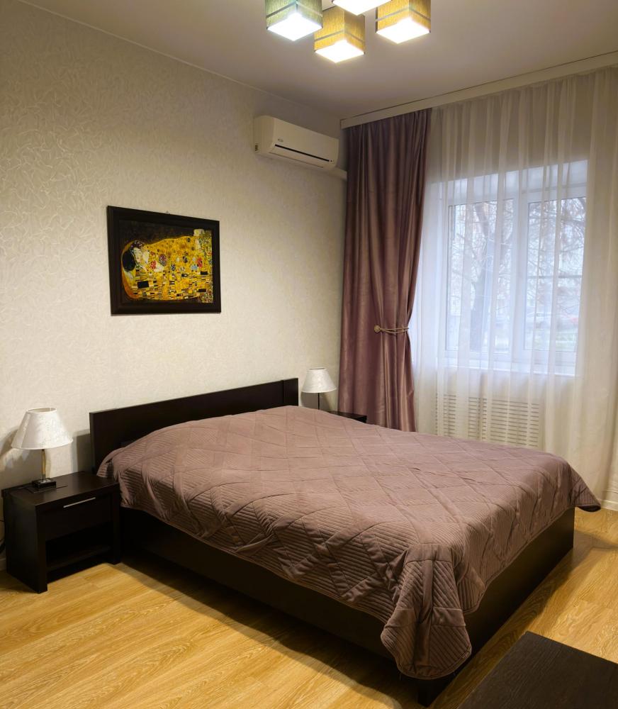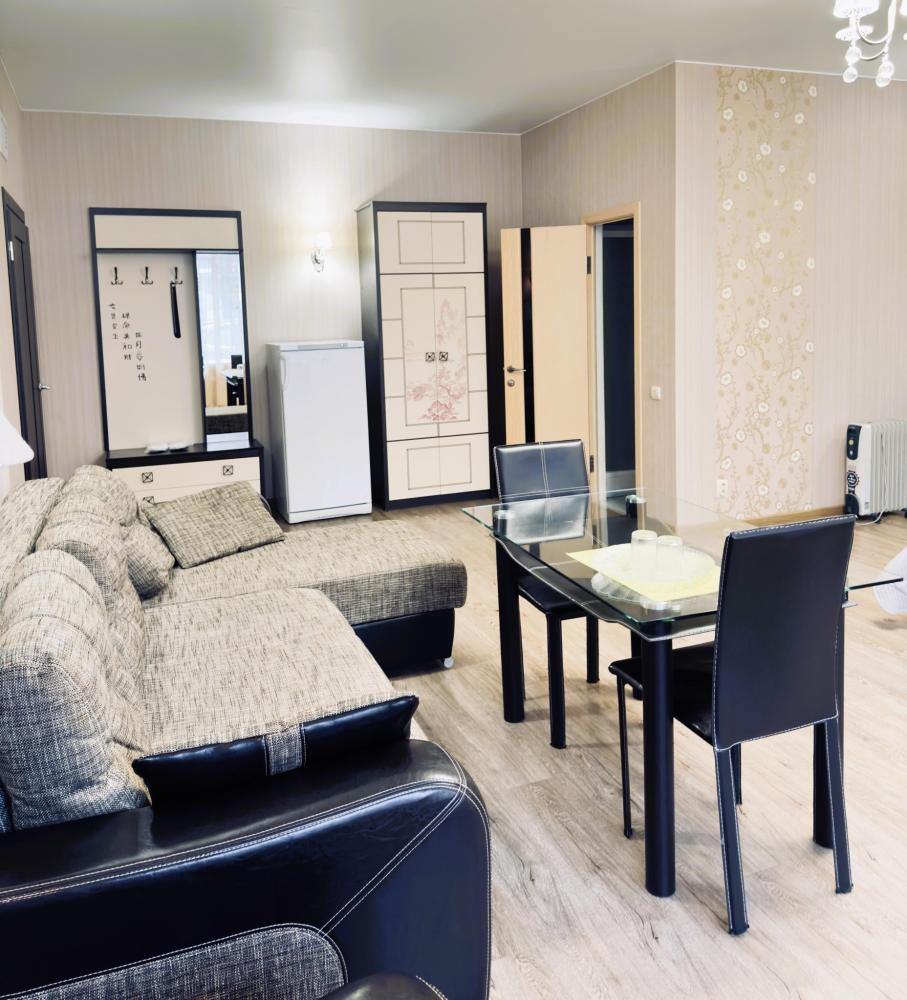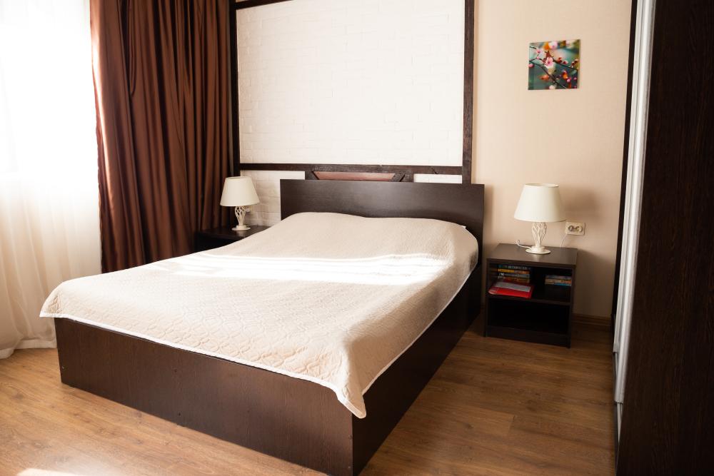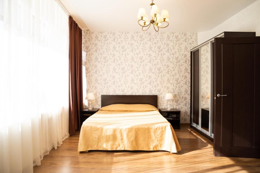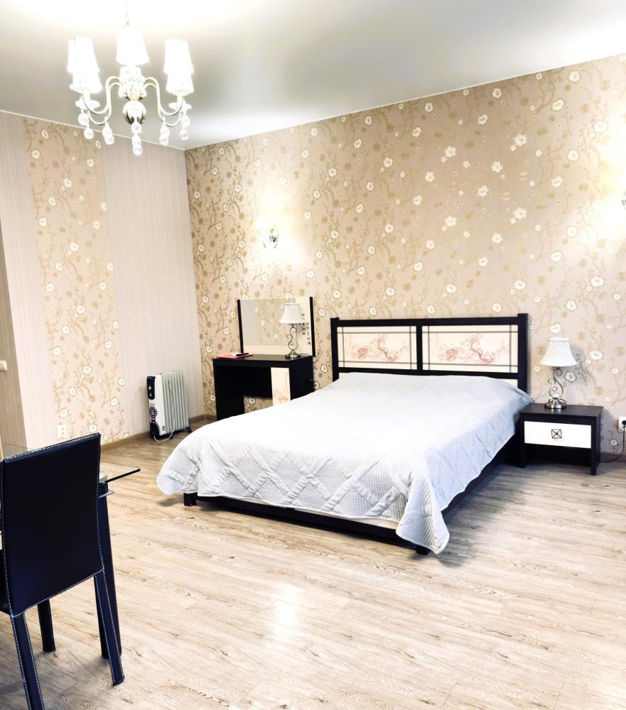 В номере: двуспальная кровать, прикроватные тумбочки, диван, кресло, холодильник, стол, стулья, шкаф, телевизор, кондиционер, туалетный столик. В ванной: душевая кабина, туалет, раковина.