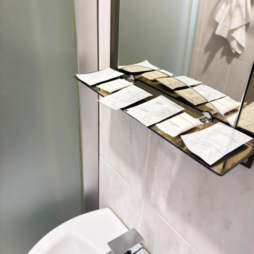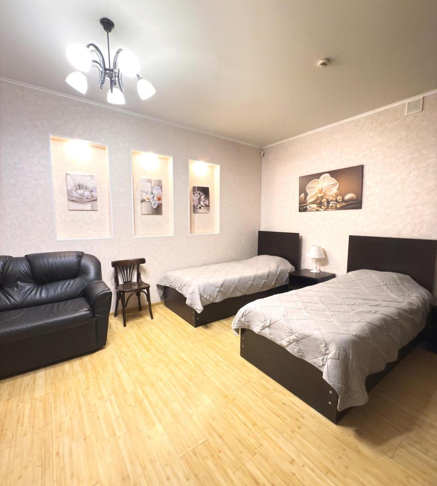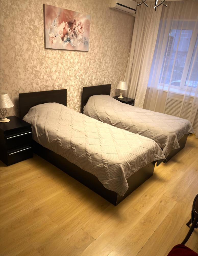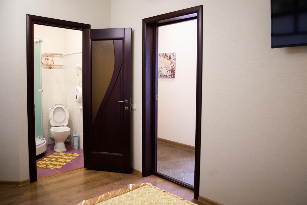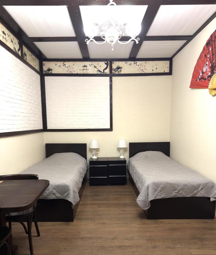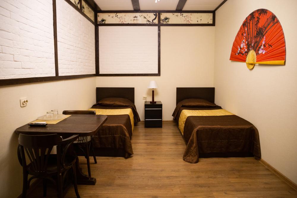 В номере: две односпальные кровати, стол, стулья, шкаф, прикроватные тумбочки, кондиционер, тумбочка, телевизор, холодильник. В ванной: туалет, раковина, душ, душевая кабина.