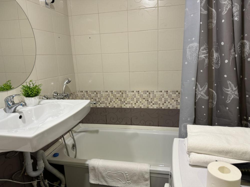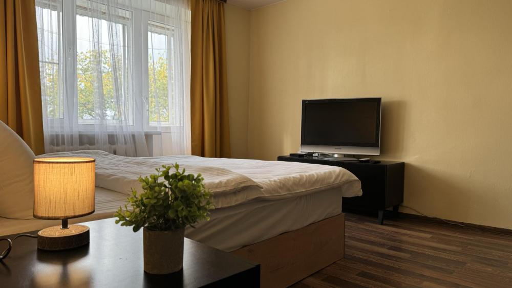 Первая спальня: Большая двуспальная кровать + диван-кровать, прикроватные светильники, а также плоский телевизор с IPTV-приставкой — сотни телеканалов и тысячи фильмов для вашего досуга!
