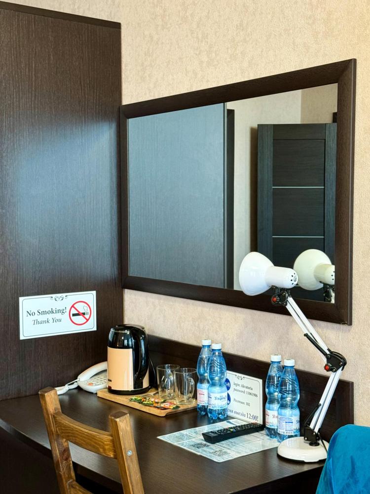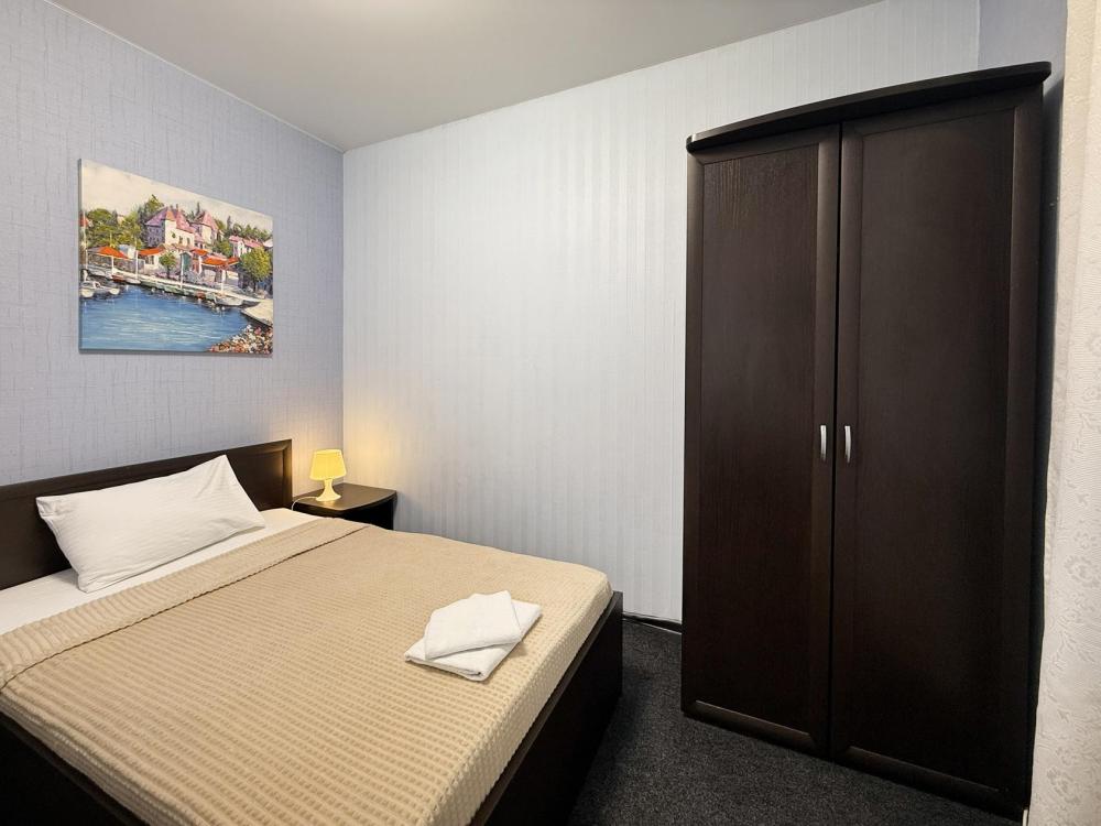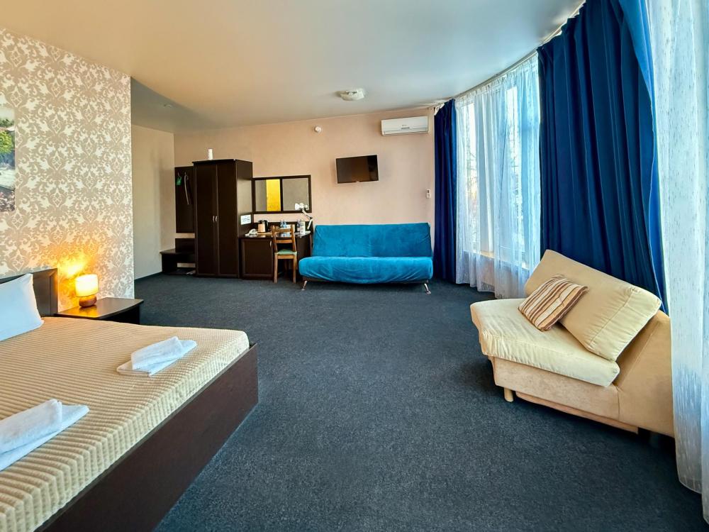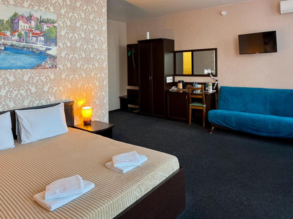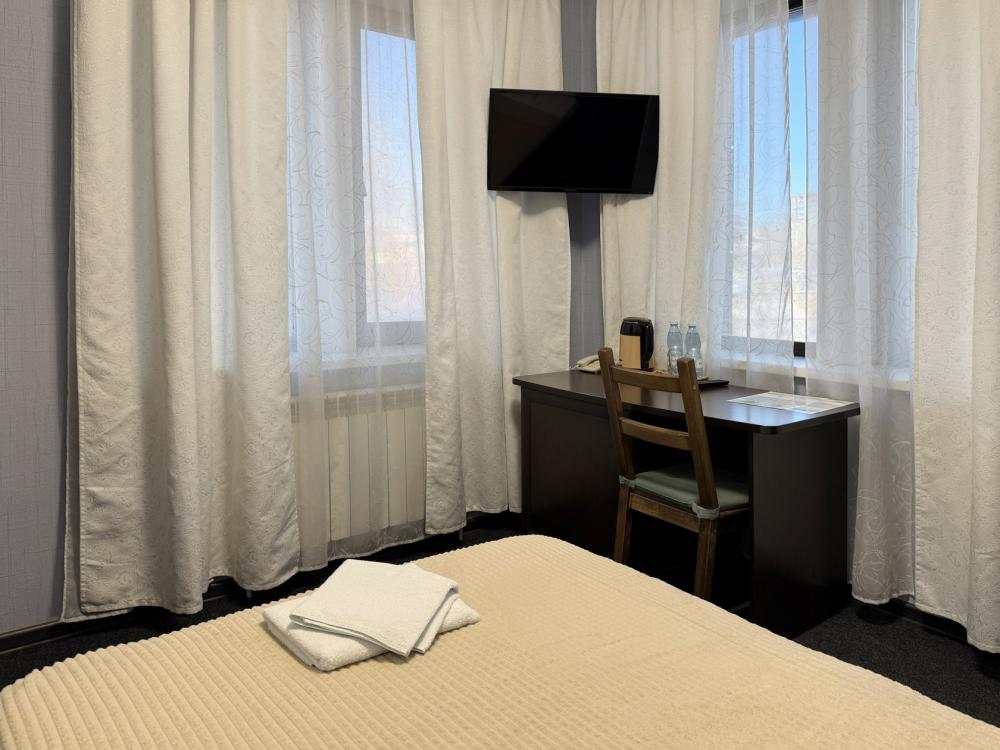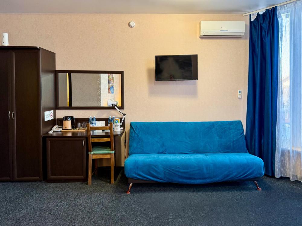 Комфортабельный, светлый номер площадью 18 м² с двуспальной кроватью ( 180* 200). В номере есть все необходимое для проживания и отдыха: телевизор со спутниковым TV, кондиционер, рабочее место, шкаф, телефон, интернет, фен, душ, зеркала, предметы первой необходимости ( гель для душа, шампунь, тапочки). Туалетная комната с с душевой кабиной.