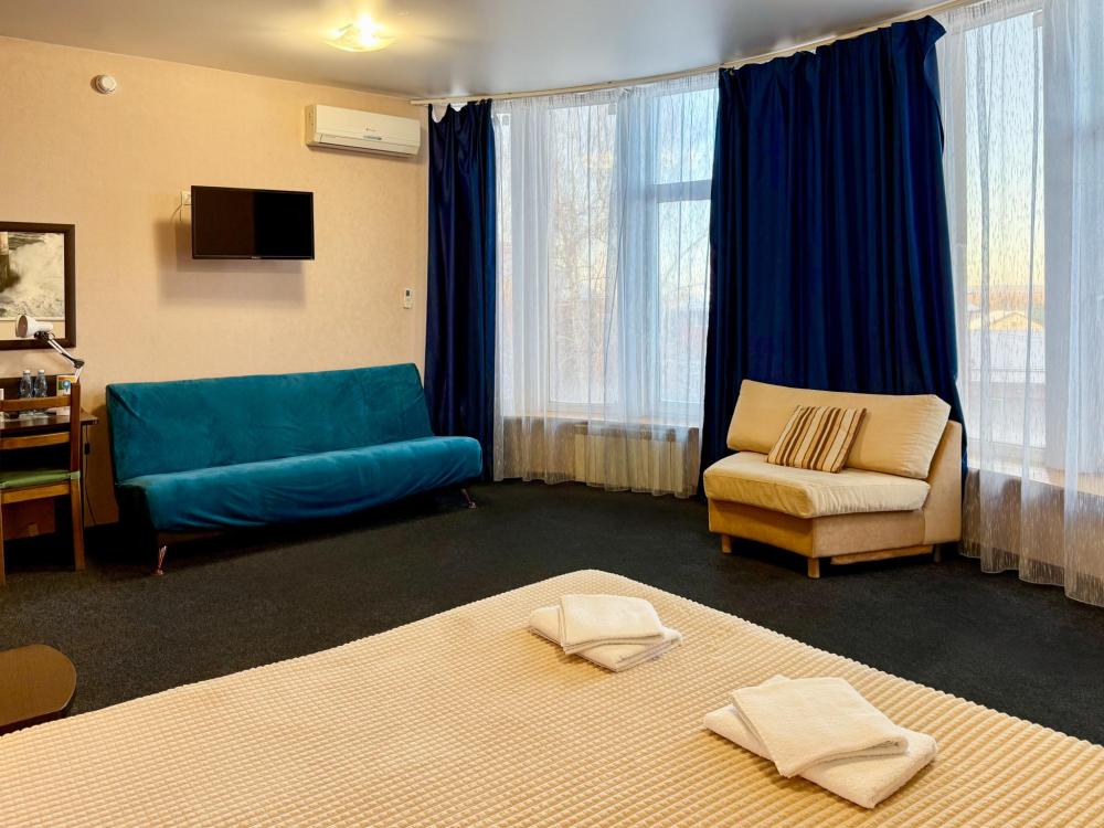 Просторный, красивый номер площадью 27 м². Одним из достоинств этого номера являются большие панорамные окна, где можно лицезреть захватывающие пейзажи Жигулевских Гор и реки Волги. Номер содержит все необходимое для комфортного проживания и отдыха: двуспальная кровать (180* 200), диван, ЖК телевизор со спутниковым TV, кондиционер, рабочее место, шкаф, телефон, интернет,холодильник, фен, душ, зеркала, предметы первой необходимости ( гель для душа, шампунь, тапочки). В номере изысканная туалетная комната с джакузи.