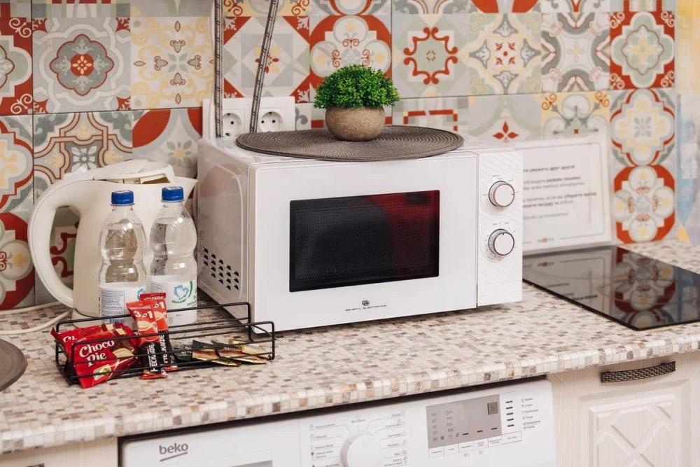 Вся необходимая бытовая техника (стиральная машинка, холодильник, плазменный телевизор, утюг, микроволновая печь и чайник).