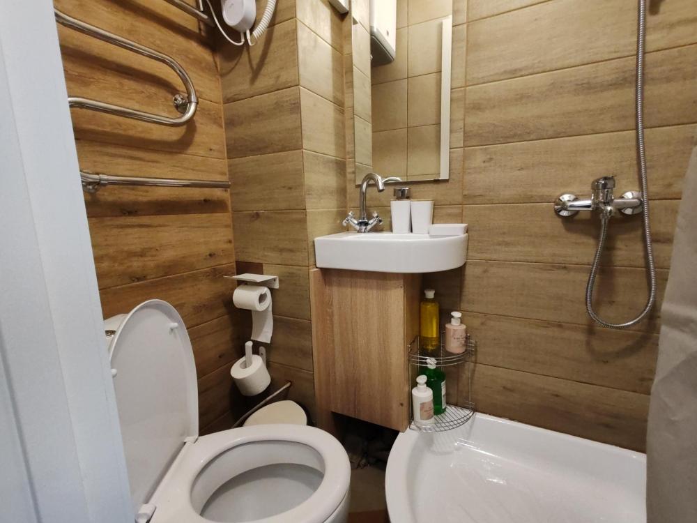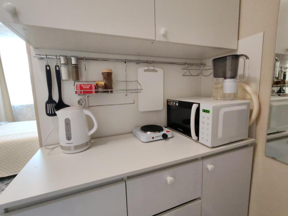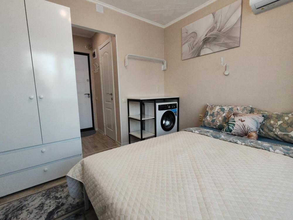 Уютные апартаменты студия, оборудованные всем необходимым для комфортного проживания. В квартире: двуспальная кровать, стол, стул, стиральная машинка, всегда горячая вода, есть водонагреватель, телевизор Smart-Tv и 200 бесплатных каналов, Wi-Fi бесплатно доя гостей. На кухне чайник, фильтр для воды, плитка электрическая, холодильник, столовые приборы и посуда. А также чистые полотенца и постельное белье.