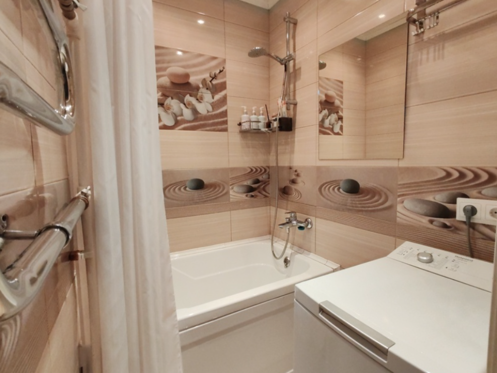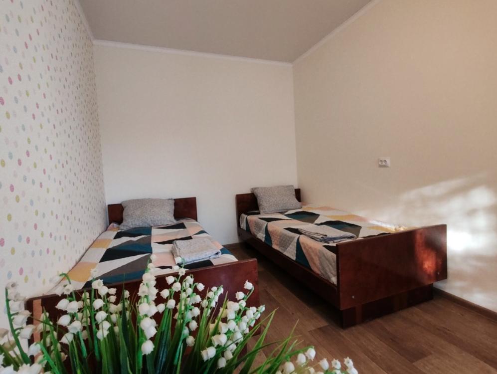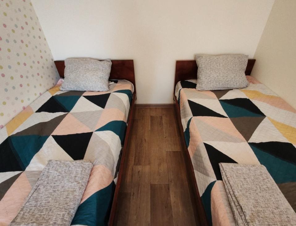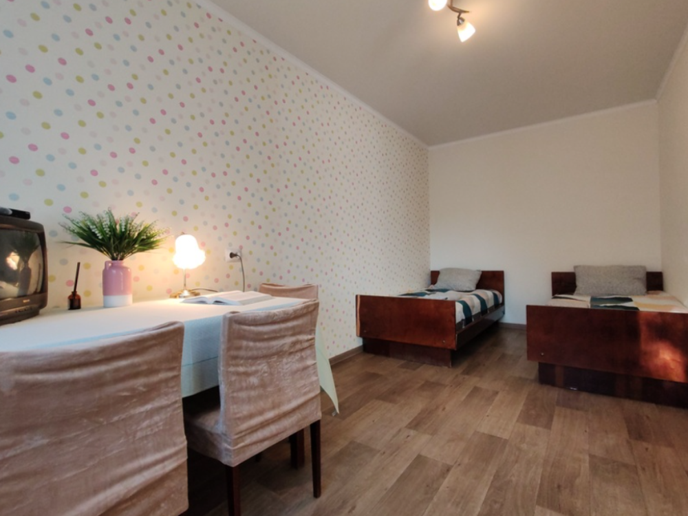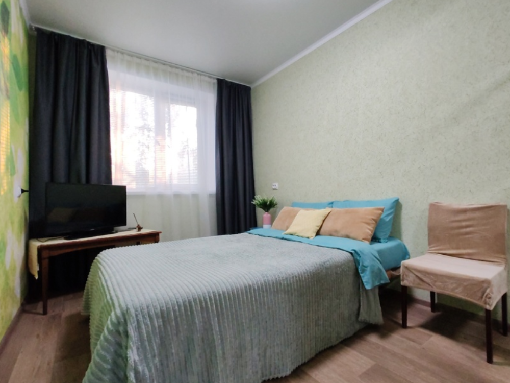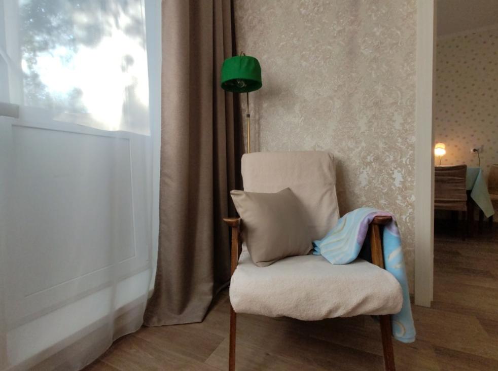 В апартаментах расположена двуспальная кровать 120x200 с ортопедическим матрасом, две односпальные кровати и уютный двуспальный диван. Возможность круглосуточного заселения имеется. Уютный вид из окон создает ощущение, что вокруг нет других домов. Территория включает большую детскую и спортивную площадки, а также уютный двор. Предоставляется чистое и глаженное постельное бельё и полотенца. В наличии столовая и необходимая посуда для приготовления пищи, чайник, микроволновая печь, плита и духовка. Отдельная ванная комната оборудована стиральной машиной, а также есть гладильная доска, утюг, фен, телевизор и бесплатный Wi-Fi. Для гостей предусмотрены гель для душа, шампунь, зубные щётки и гигиенические средства.