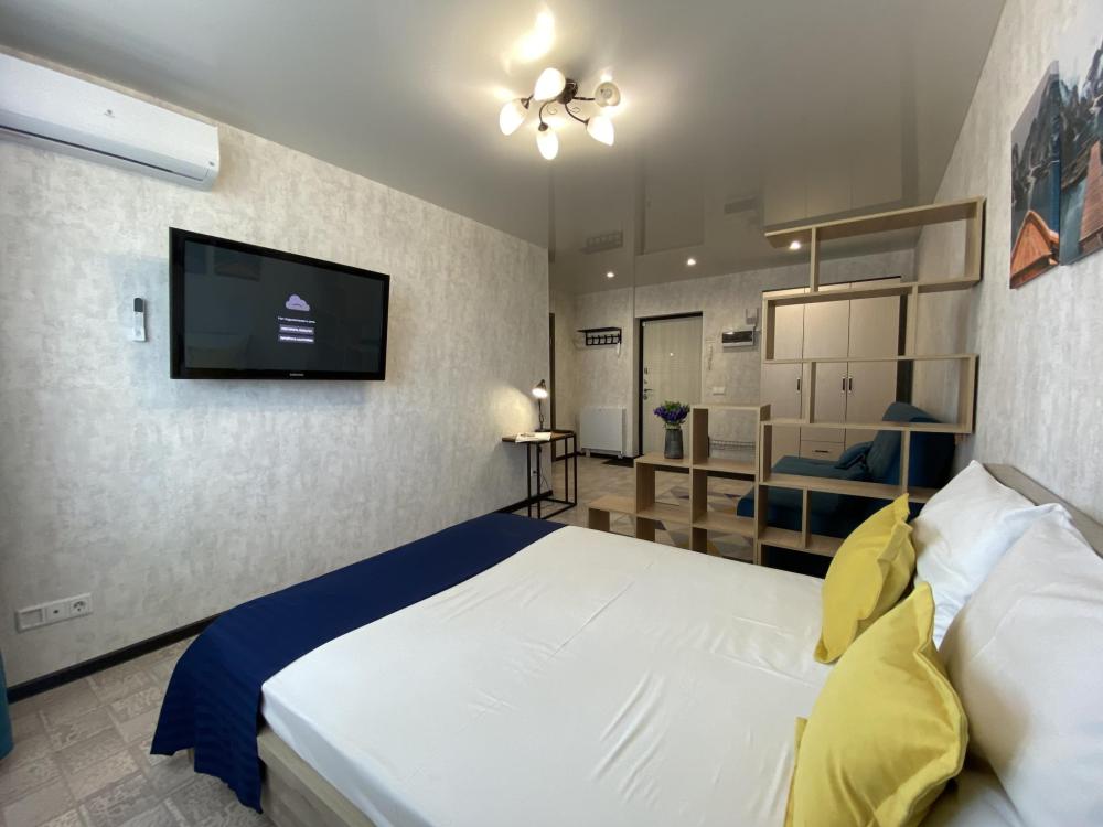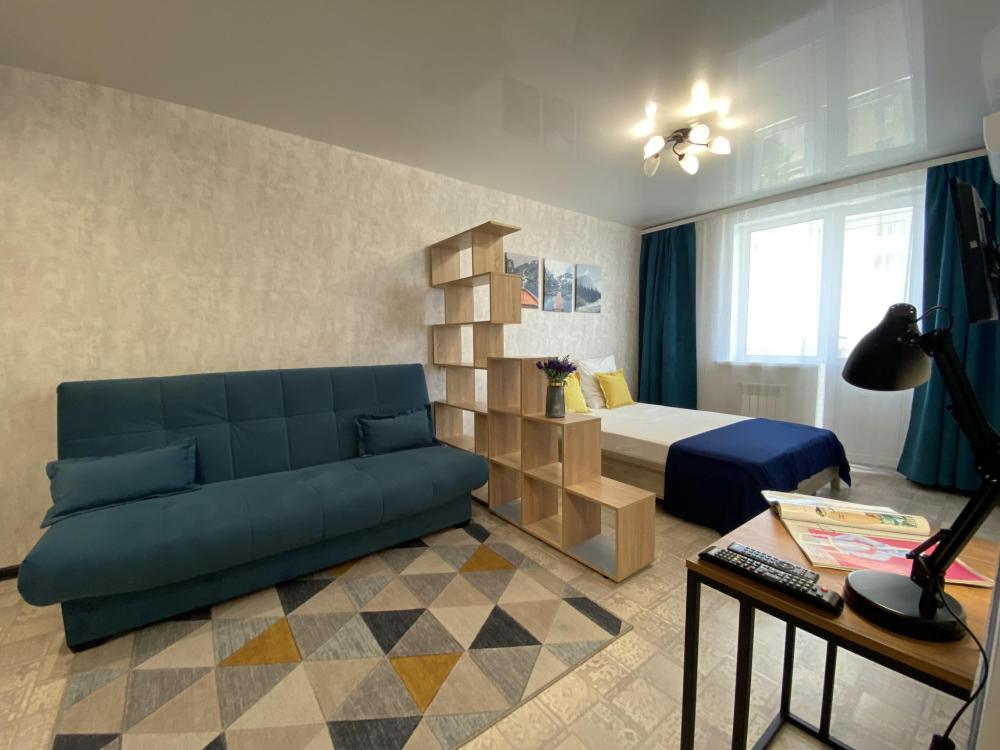 Просторная зона отдыха с удобным двуспальным диваном, Smart-TV и быстрым Wi-Fi для работы и развлечений.