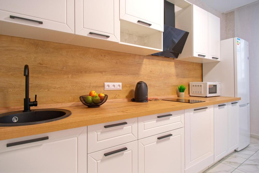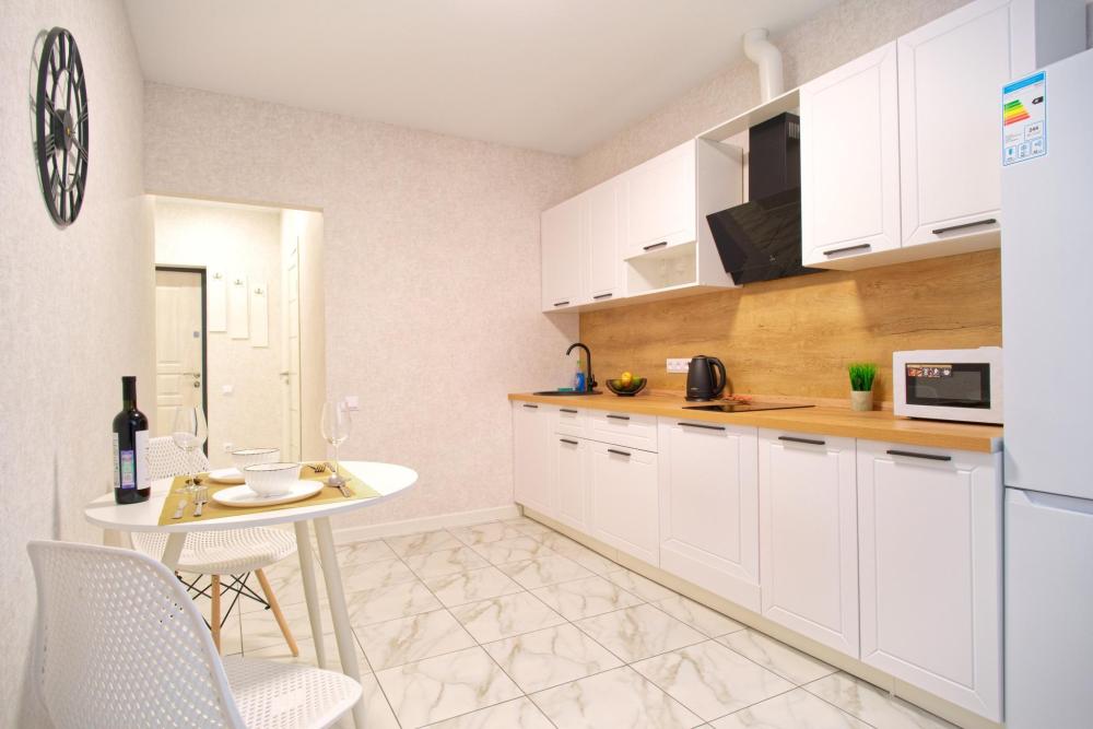 Аккуратная кухня-ниша, полностью укомплектованная всей необходимой техникой: холодильник, микроволновая печь, электрическая плита, чайник, посуда и столовые приборы. Приготовить завтрак или ужин не составит труда.