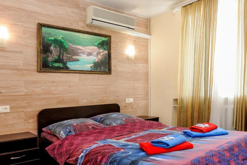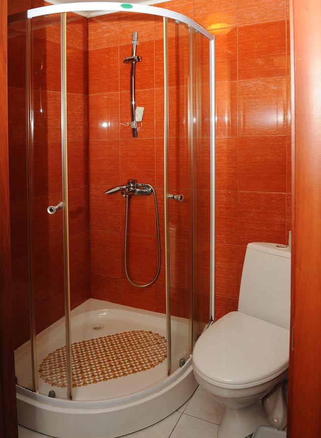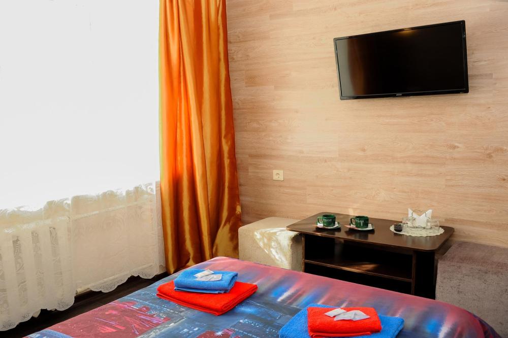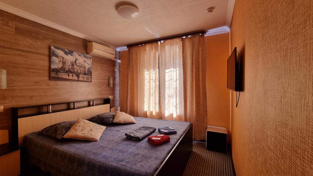 Двухместный номер комфорт общей площадью 20 кв.м. Оснащение номера: двуспальная кровать, прикроватные тумбы, стол и пуфики, кондиционер, телевизор, гардероб, санузел с душевой кабиной.