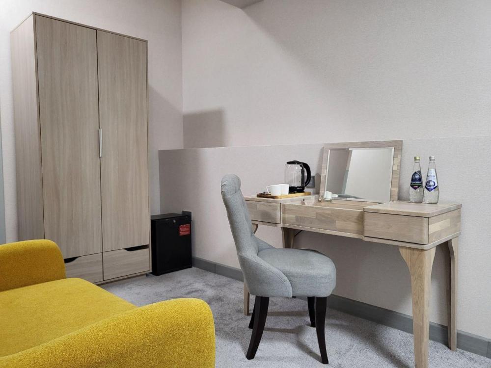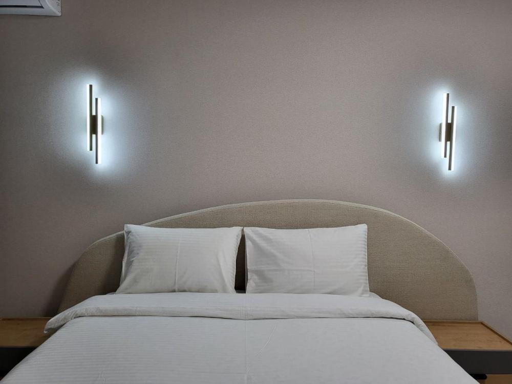 Номер Полулюкс. Подходит для размещения до 2х человек. В номере есть все необходимое для комфортного проживания: двуспальная кровать, 4 подушки, тумбы, комод с зеркалом, LED-TV 50 дюймов, смарт тв, сплит-система, зона отдыха с диваном и креслом, большой с/у с ванной и отдельной душевой комнатой, шторы блэкаут, шкаф, сейф, холодильник, халаты, тапочки, полотенца, косметические принадлежности, фен, чайный набор, вода.