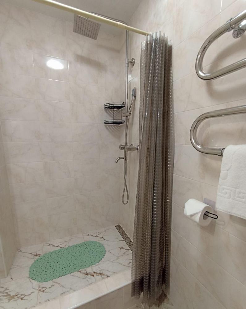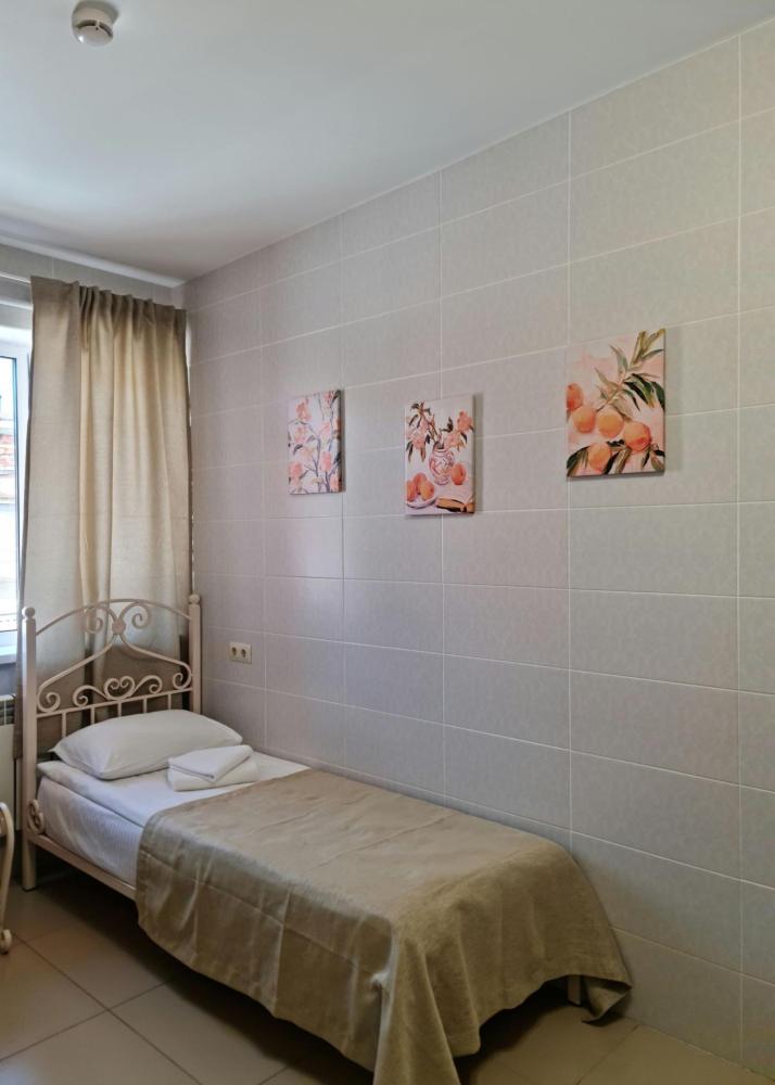 Номер с тремя 1,5 спальными кроватями. Новая мебель. В номере установлены кондиционер, телевизор, холодильник, шкаф для одежды, тумбочка, журнальный столик, пуф, мини-прихожая, телефон внутренний, чайник, фен (по запросу). Утюг и гладильная доска в общей зоне. Пользование стиральной машиной за дополнительную плату. Кулер с водой на этаже. Душ и туалет в номере. Предоставляются тапочки, шампунь и гель для душа.