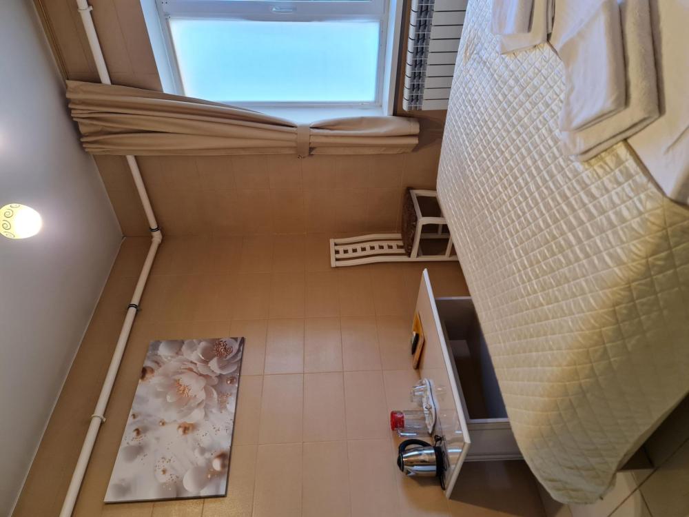 Номер с 1,5 спальной кроватью. Окно выходит в коридор. Новая мебель. В номере установлены кондиционер, телевизор, тумбочка, журнальный столик, мини-прихожая, телефон внутренний, чайник, фен (по запросу). Утюг и гладильная доска в общей зоне. Пользование стиральной машиной за дополнительную плату. Кулер с водой на этаже. Душ и туалет в номере. Предоставляются тапочки, шампунь и гель для душа.