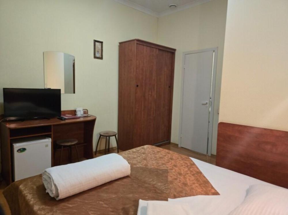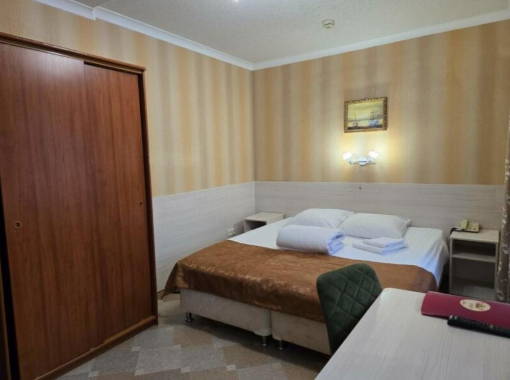 В номере: Однокомнатный номер с кроватью 180*200 и двухместным диваном, можно доставить детскую деревянную кроватку. В номере ванная комната и двойная дверь, шкаф для одежды,тумба, стул, холодильник, телевизор, телефон, кондиционер с климат-контролем, рабочее место, бесплатный Wi-Fi.