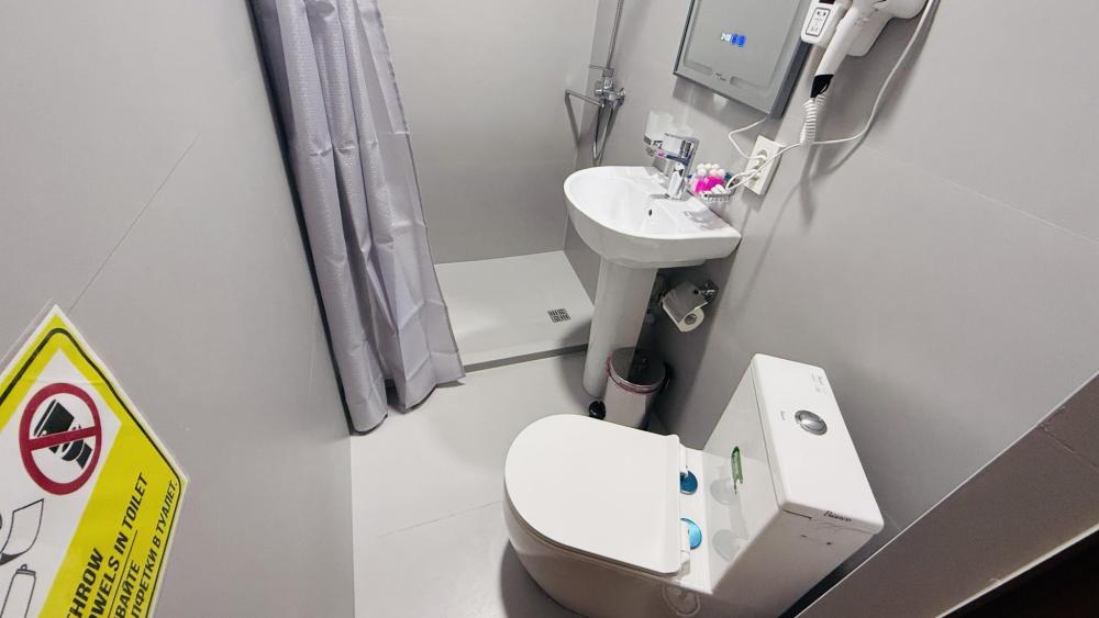 Стандартный трёхместный номер со всем необходимым: телевизор, кондиционер, шкаф, зеркало и собственная ванная комната.