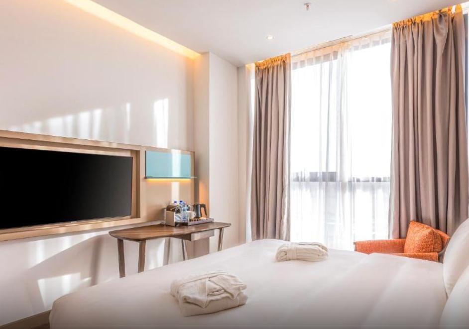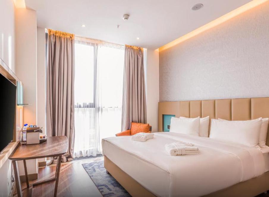 Номер с 1 двуспальной кроватью king size. Среди удобств: кондиционер, плоский ТВ диагональю 49', минибар, сейф, гладильные принадлежности, чайная станция, телефон, спутниковые каналы, халат, тапочки, набор для душа, фен.