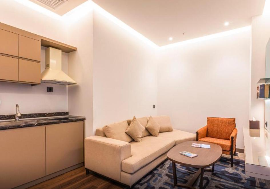 Номер с 1 двуспальной кроватью king size и мини-кухней. Среди удобств: кондиционер, плоский ТВ диагональю 49', минибар, сейф, гладильные принадлежности, чайная станция, телефон, спутниковые каналы, халат, тапочки, набор для душа, фен.