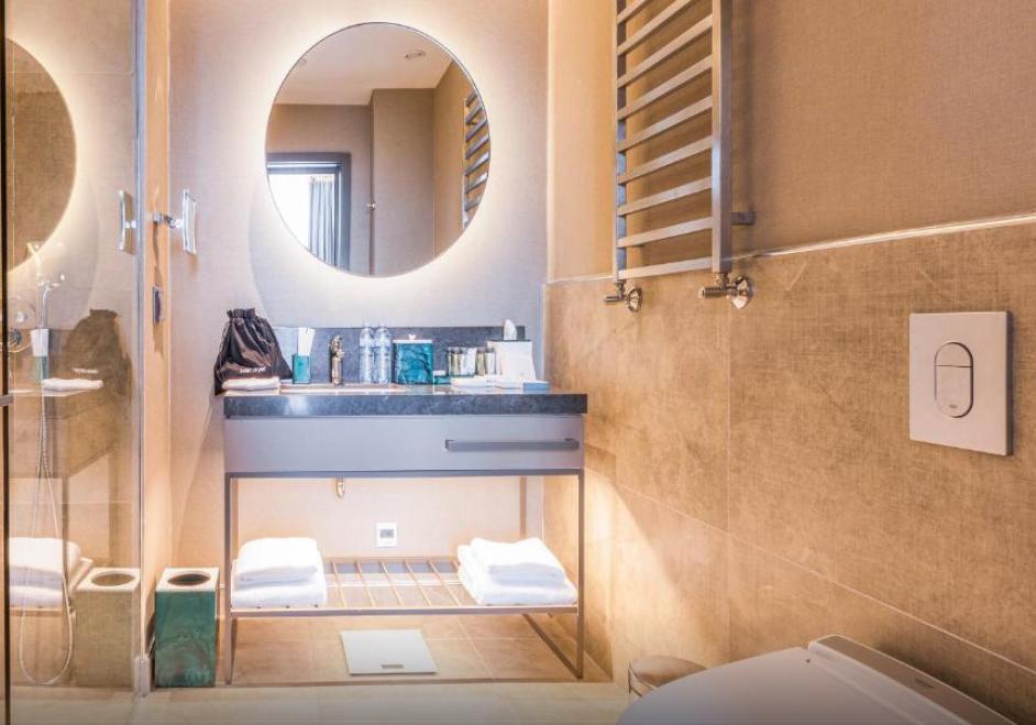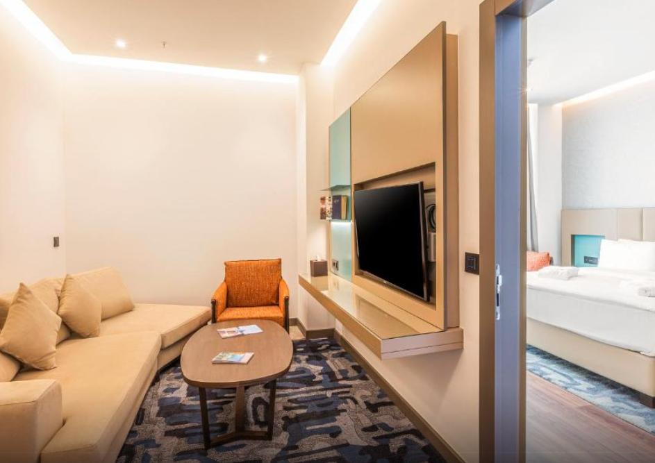 Номер для некурящих. Среди удобств: диван, кондиционер, плоский ТВ диагональю 49', минибар, сейф, гладильные принадлежности, чайная станция, телефон, спутниковые каналы, халат, тапочки, набор для душа, фен.