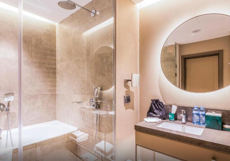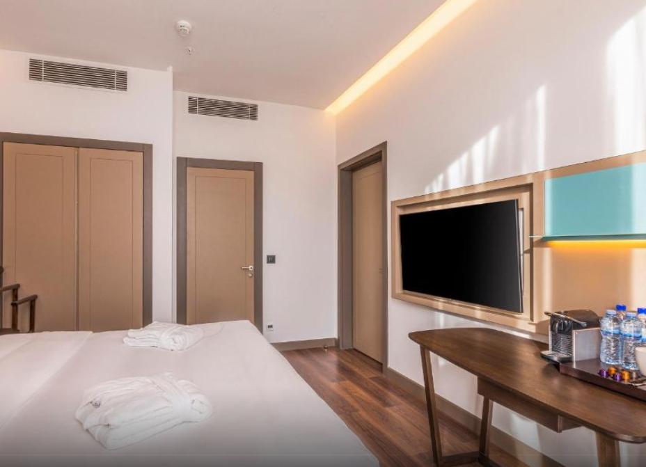 Номер для некурящих. Среди удобств: кондиционер, плоский ТВ диагональю 49', минибар, сейф, гладильные принадлежности, чайная станция, телефон, спутниковые каналы, халат, тапочки, набор для душа, фен.