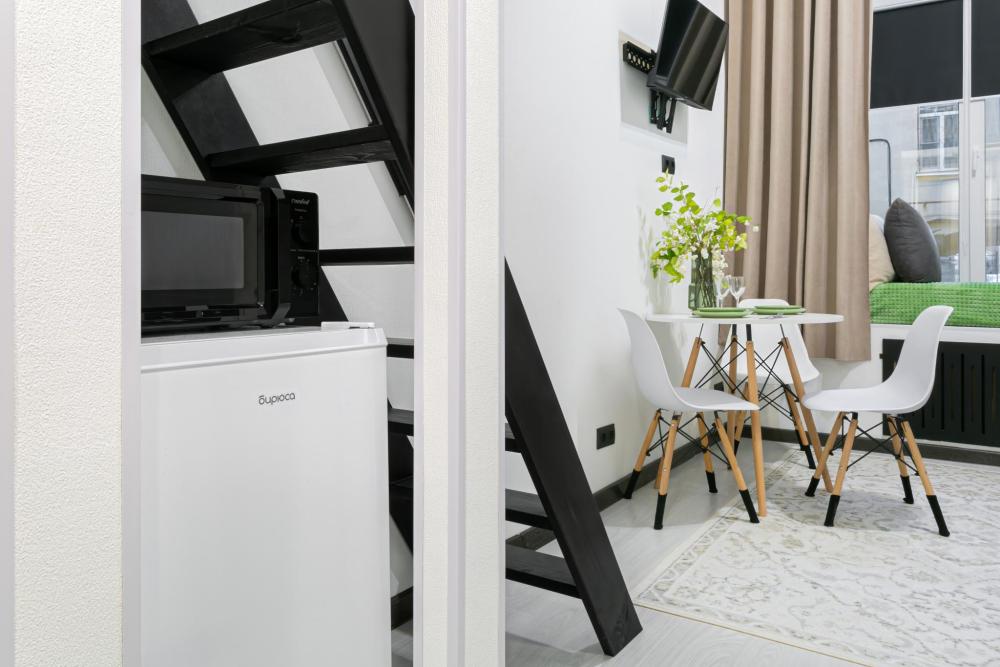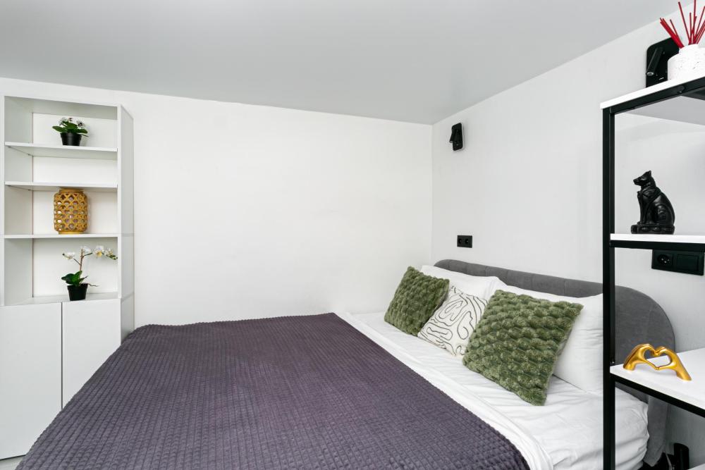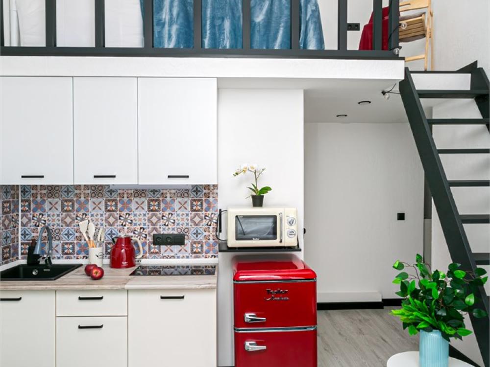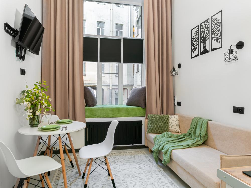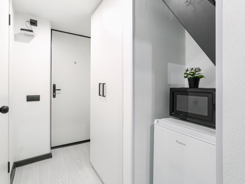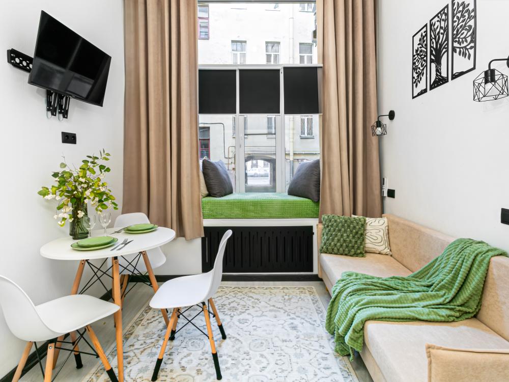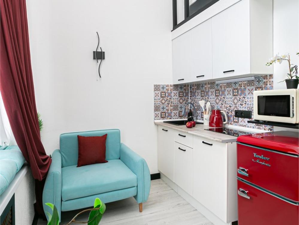 Студия для 43-х гостей. Площадь квартиры 20 м2. Совмещенный санузел с душевой кабиной, кабельное телевидение, Wi Fi, электроплита, стиральная машина, центральное отопление и горячая вода, кондиционер, удобная двуспальная кровать 160 см, высокие потолки 4 метра.