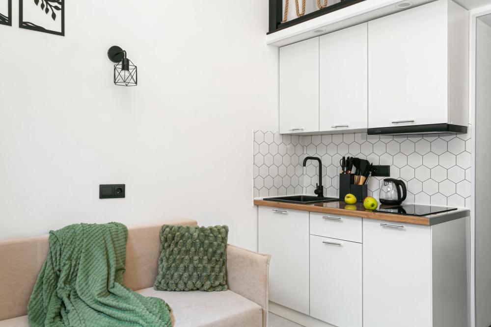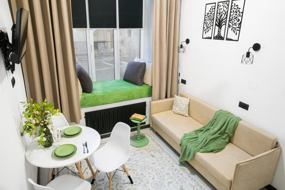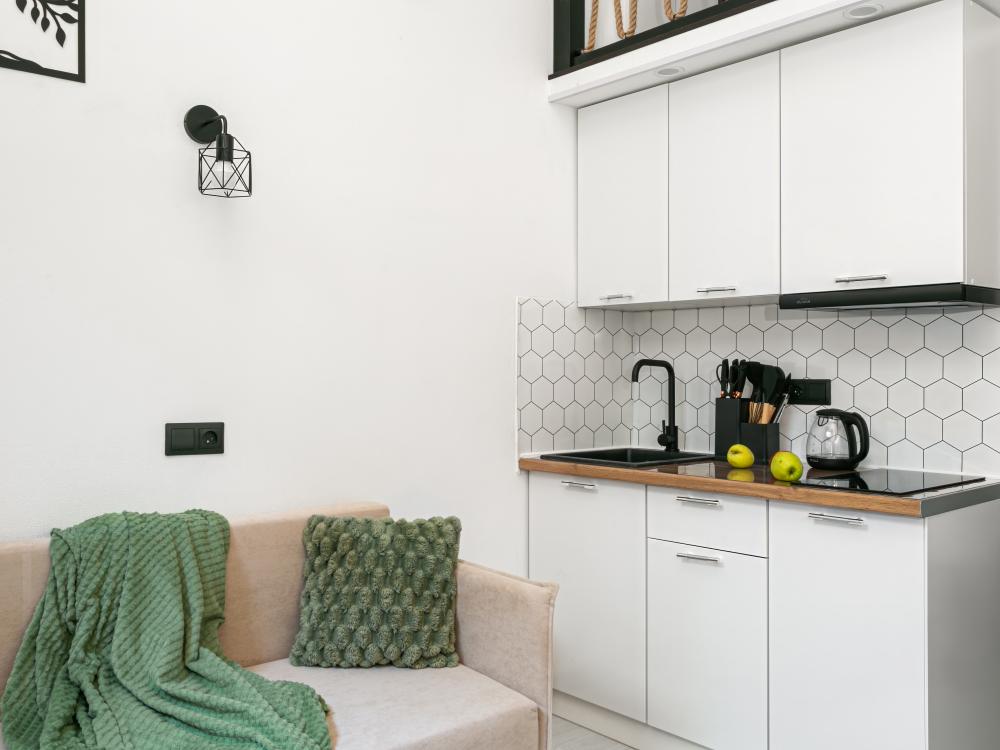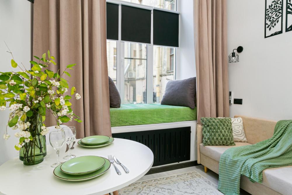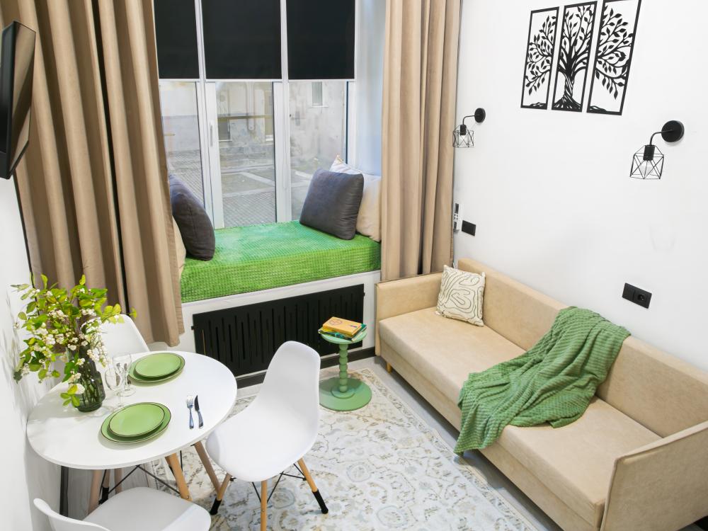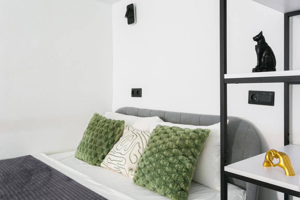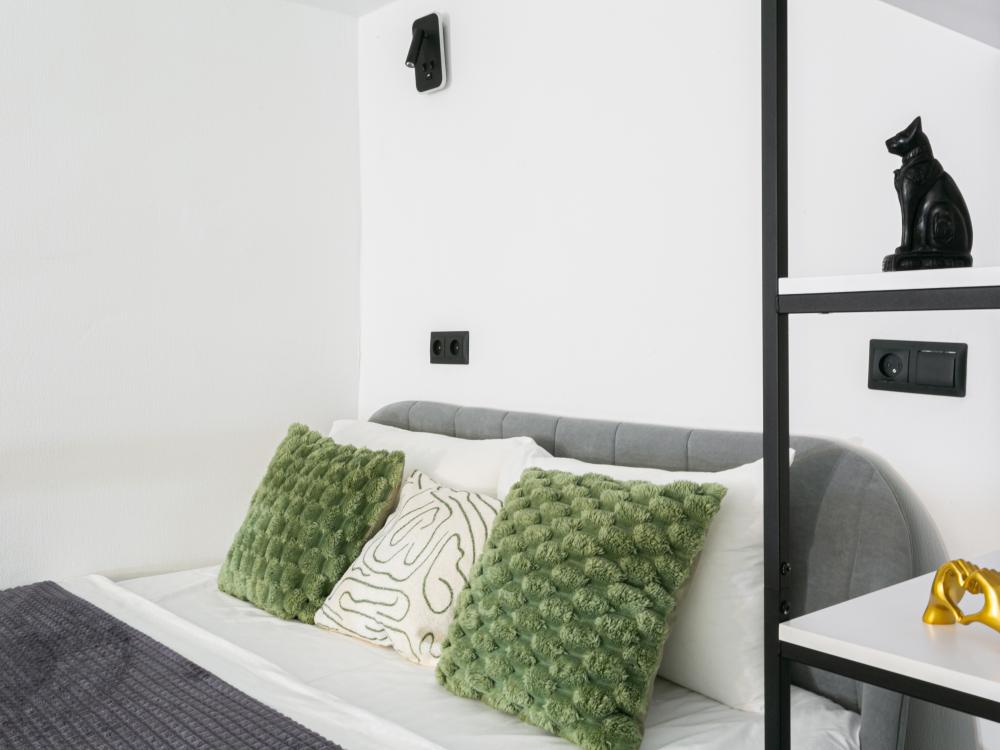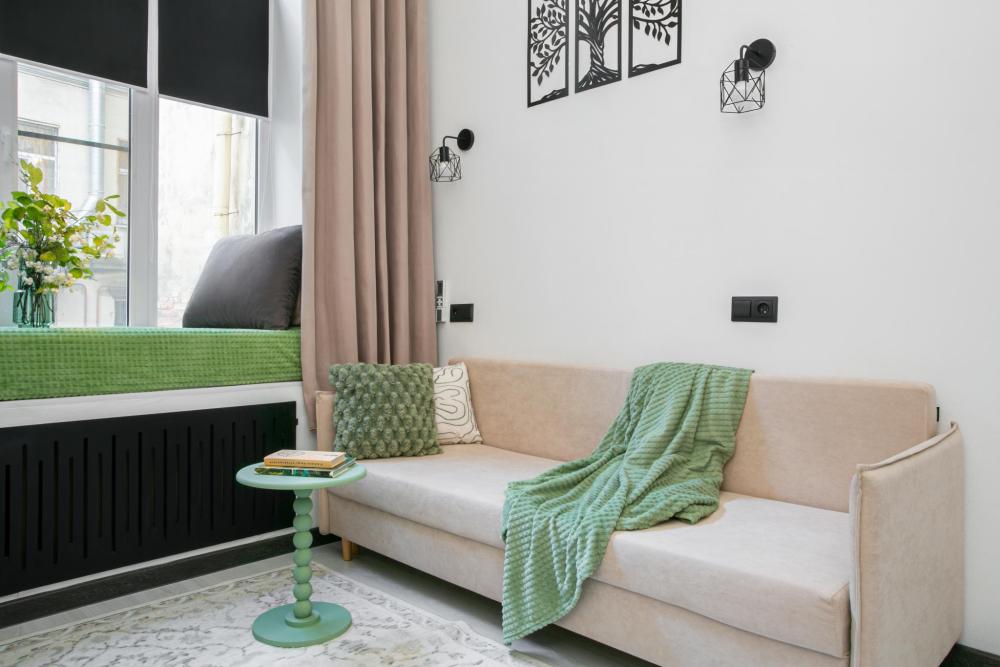 Студия для 43-х гостей. Площадь квартиры 20 м2. Совмещенный санузел с душевой кабиной, кабельное телевидение, Wi Fi, электроплита, стиральная машина, центральное отопление и горячая вода, кондиционер, удобная двуспальная кровать 160 см, высокие потолки 4 метра.