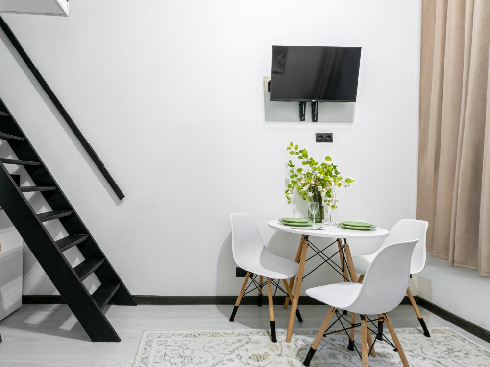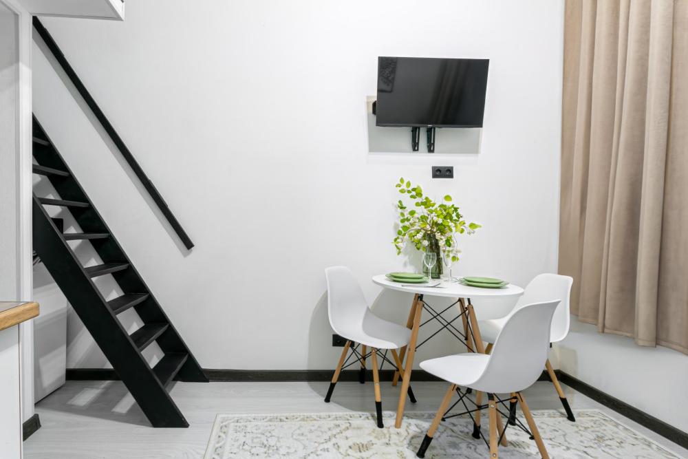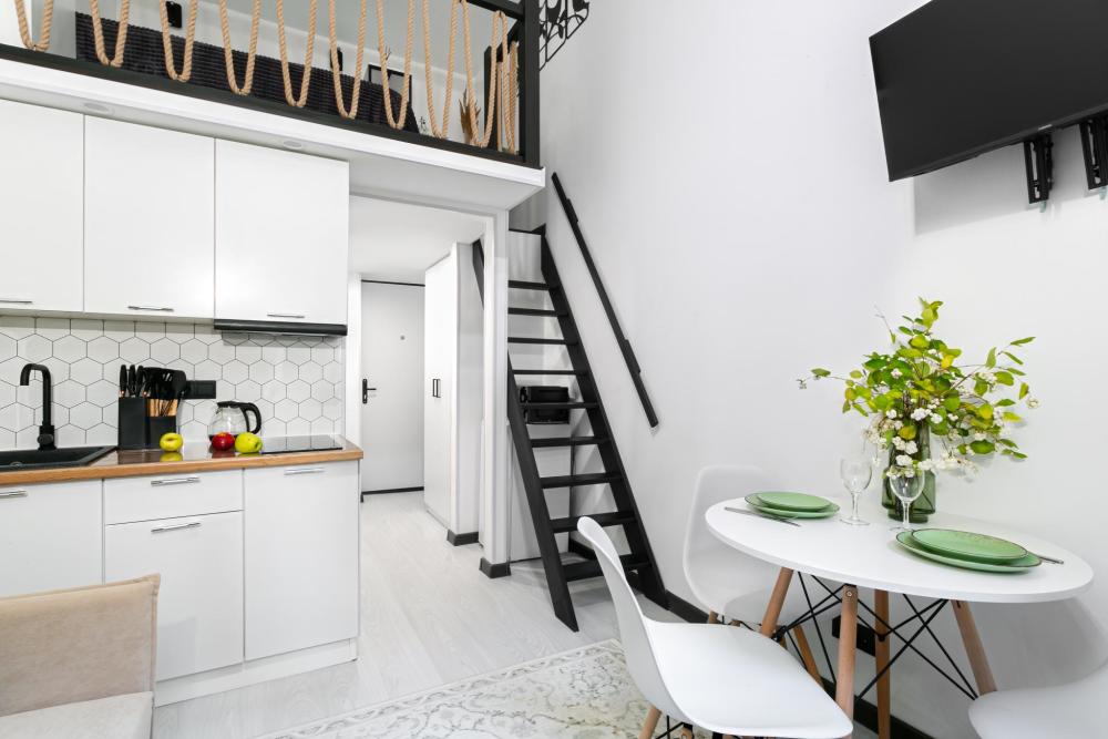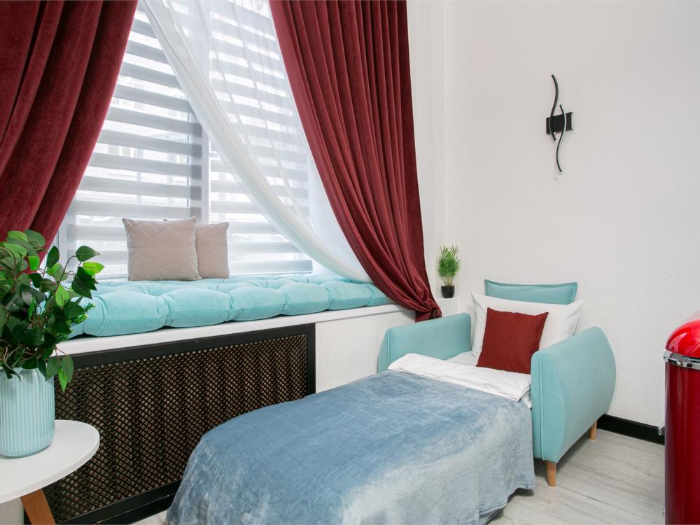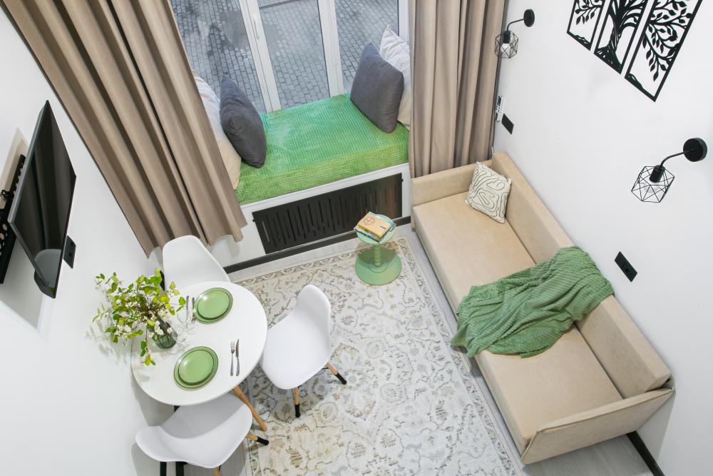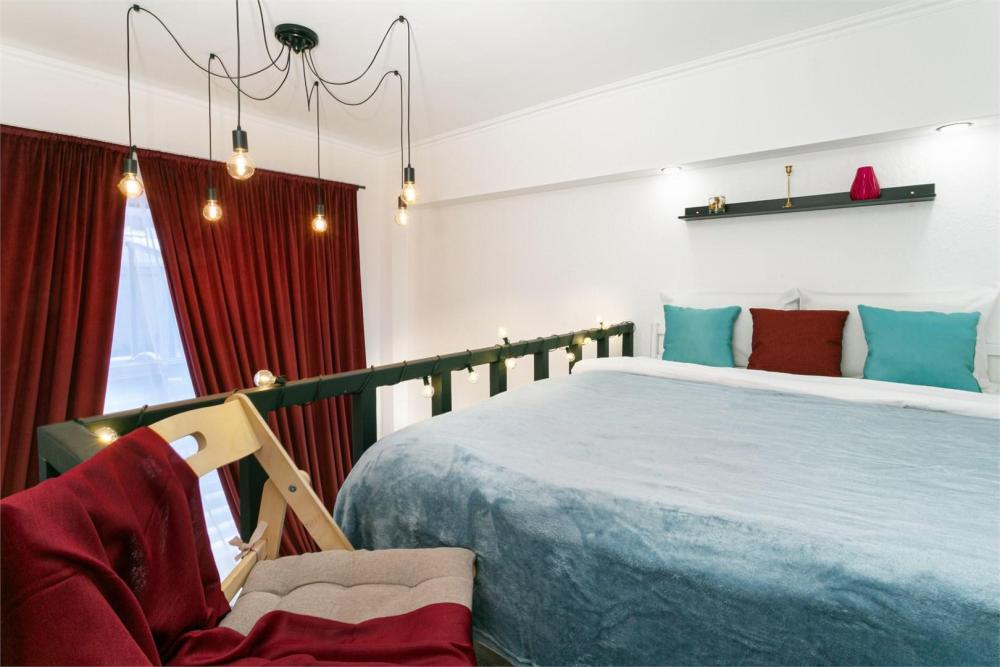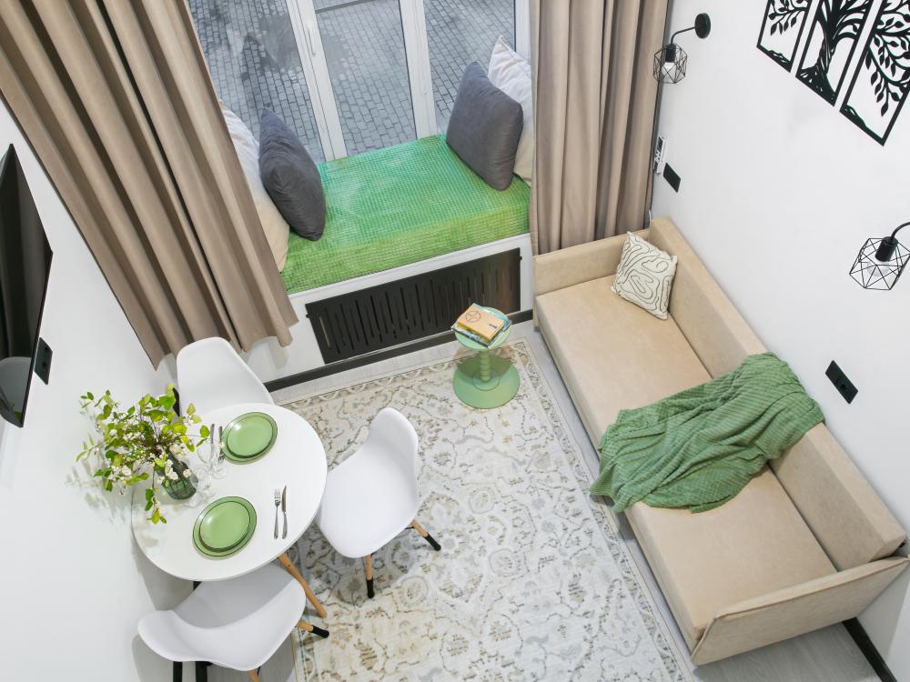 Студия для 4-х гостей. Площадь квартиры 20 м2. Совмещенный санузел с душевой кабиной, кабельное телевидение, Wi Fi, электроплита, стиральная машина, центральное отопление и горячая вода, кондиционер, удобная двуспальная кровать 160 см, высокие потолки 4 метра.