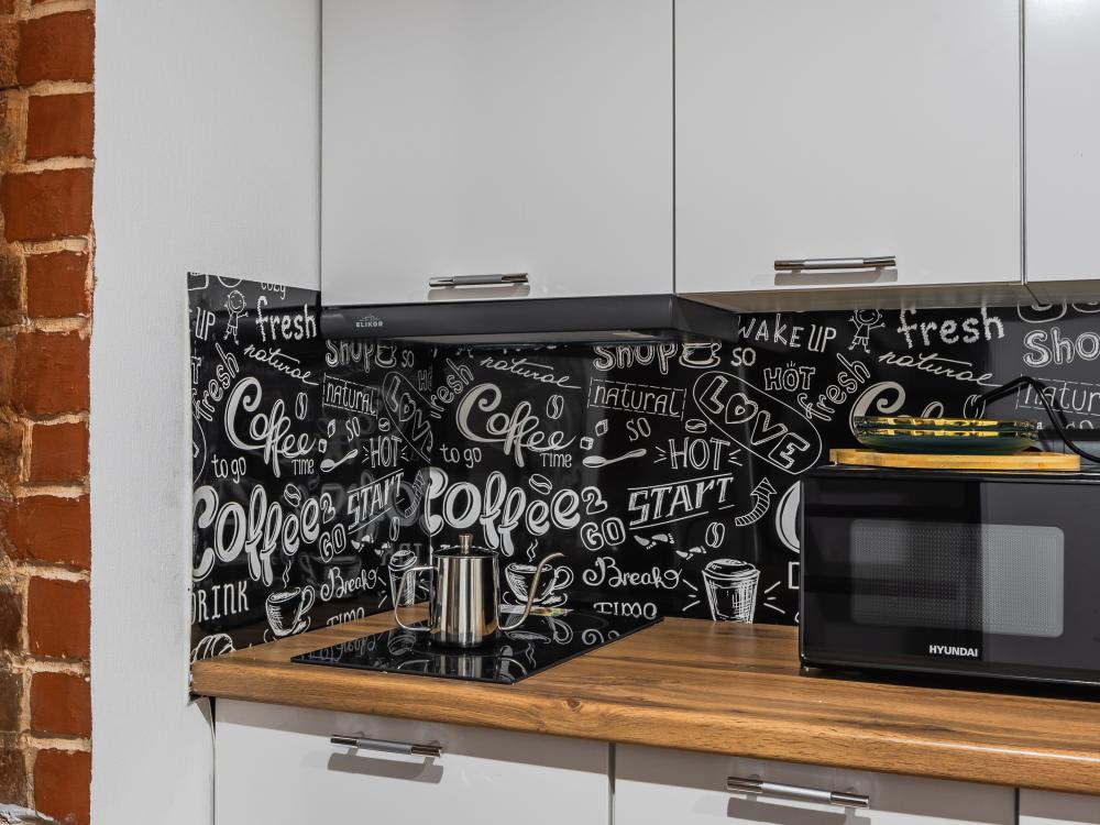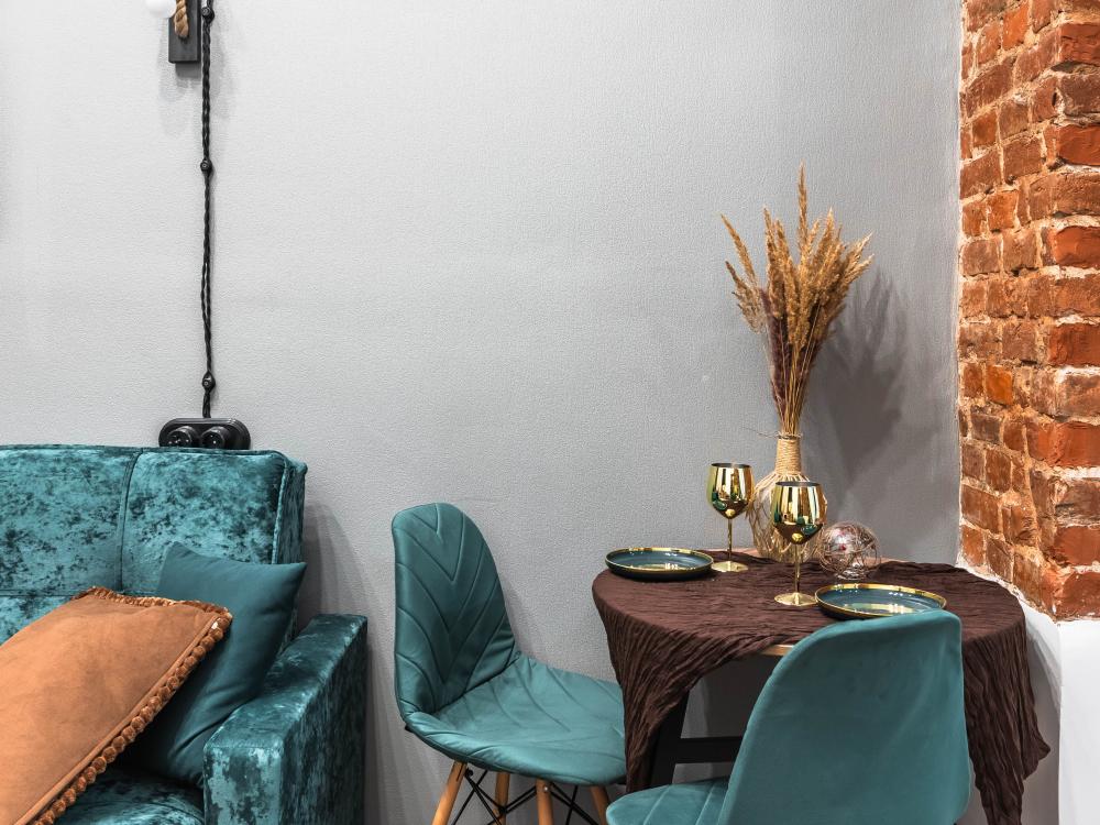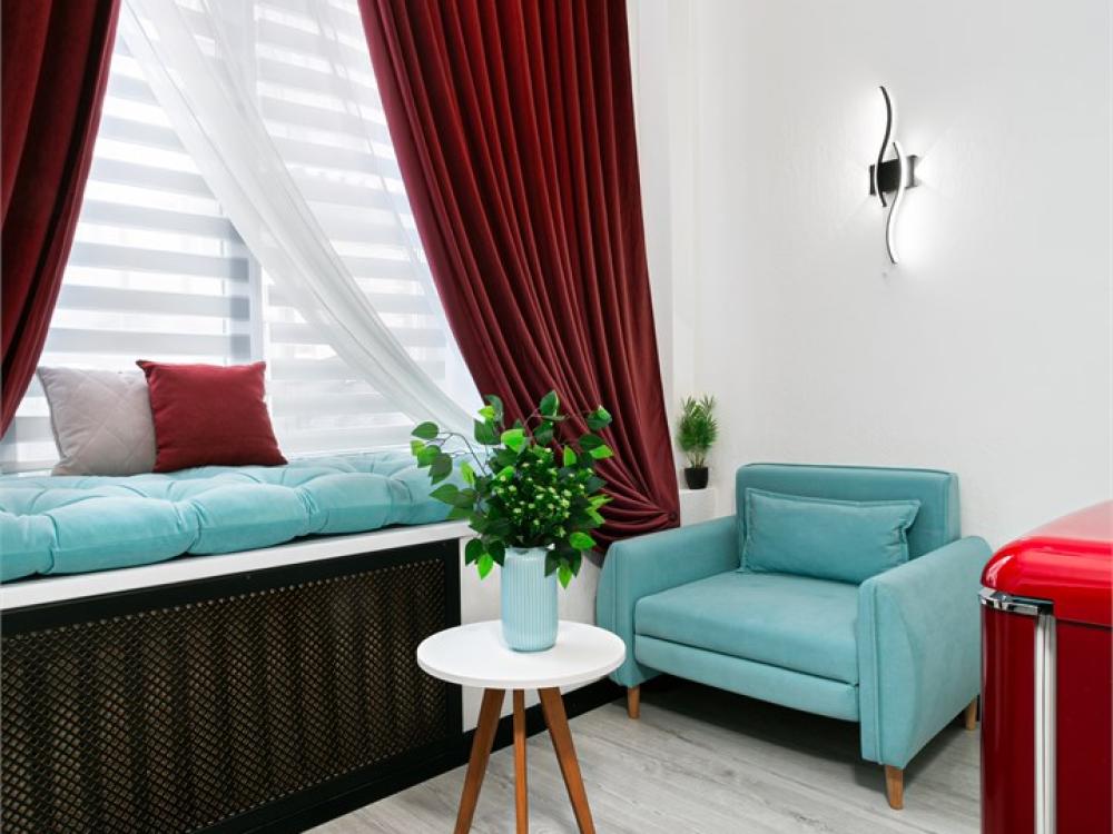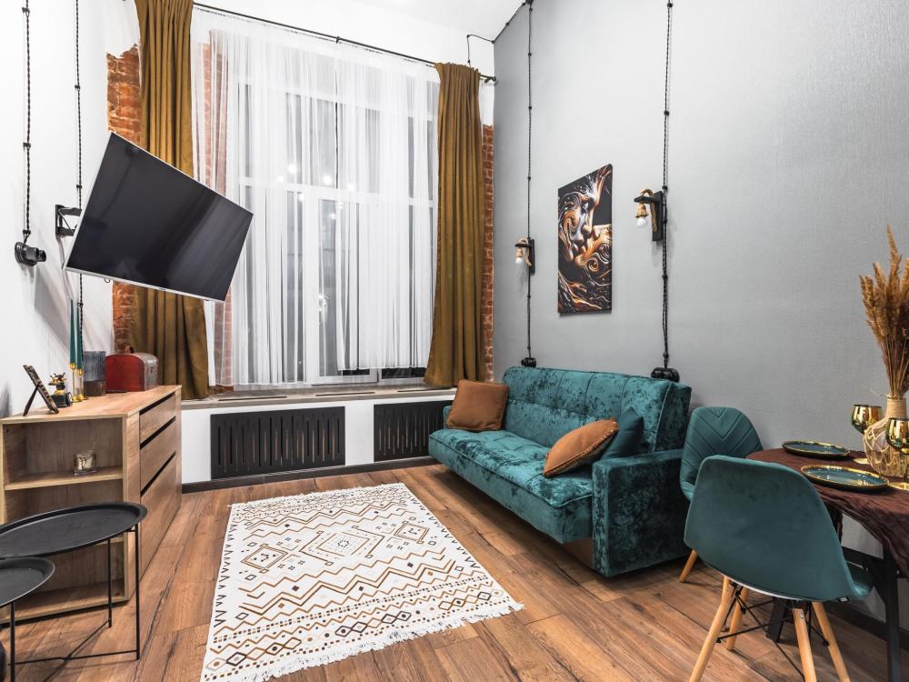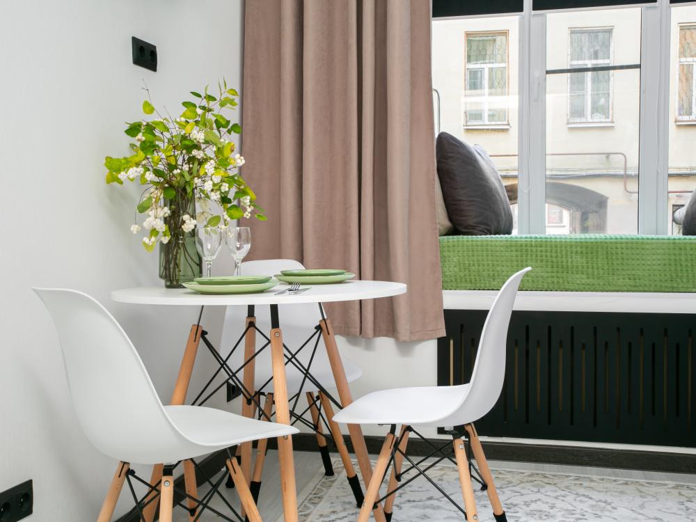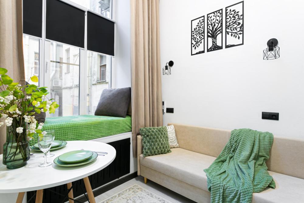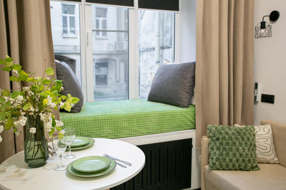 Студия для 4-х гостей. Площадь квартиры 28 м2. Совмещенный санузел с душевой кабиной, кабельное телевидение, Wi Fi, электроплита, стиральная машина, центральное отопление и горячая вода, кондиционер, удобная двуспальная кровать 160 см, высокие потолки 4 метра.