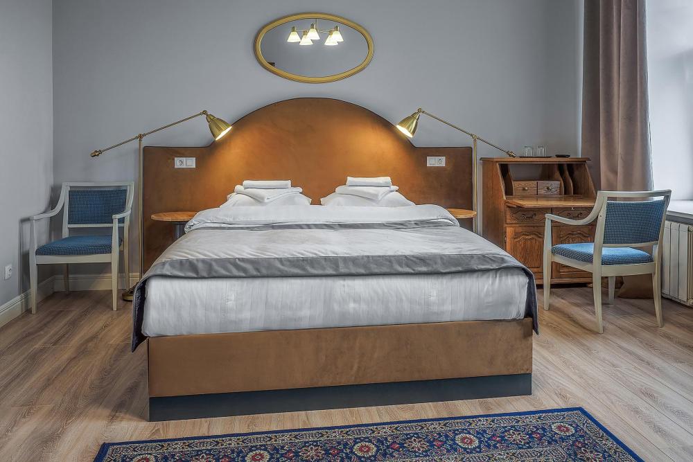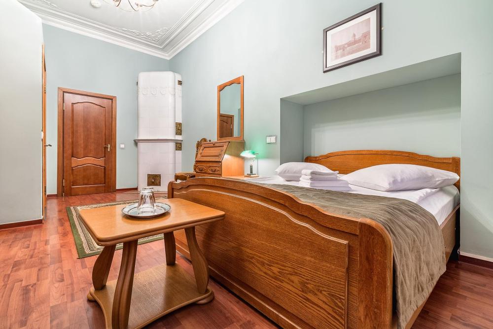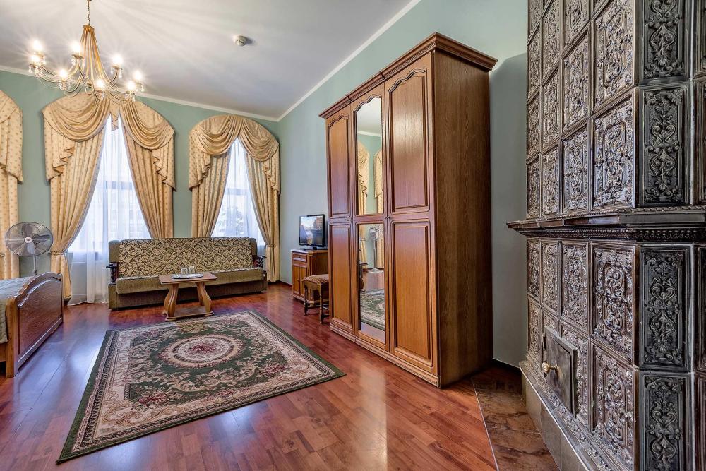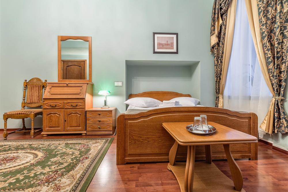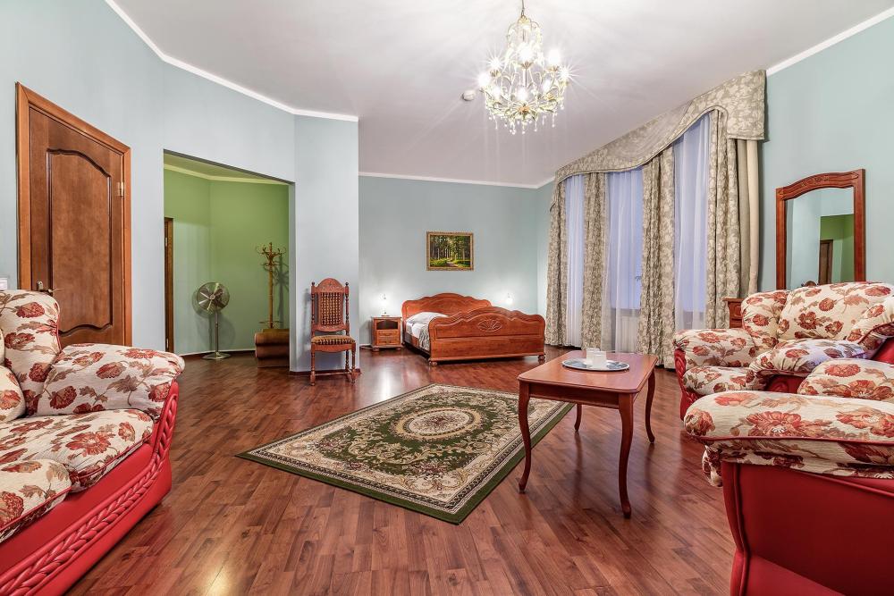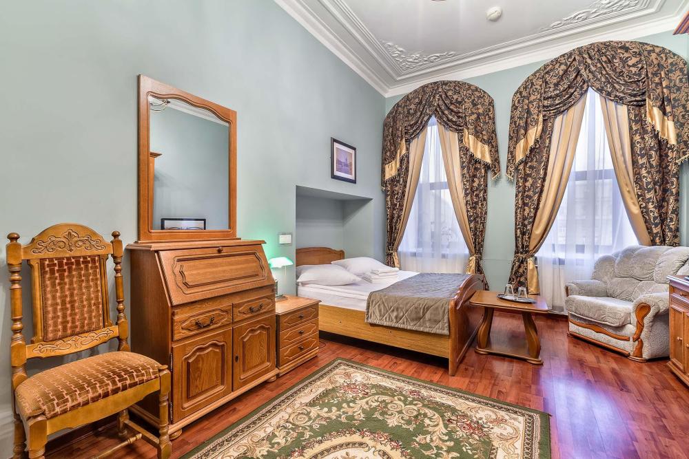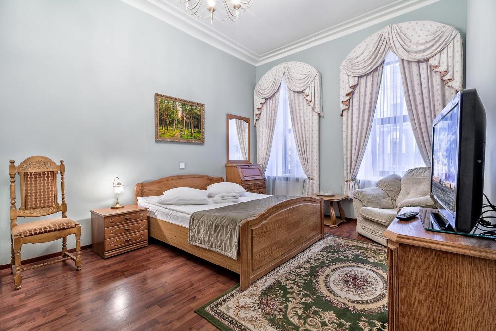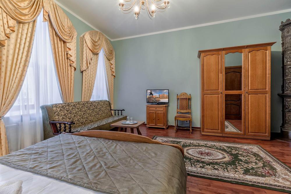 Комната площадью 40 кв.м. с окнами, выходящими на Бородинскую улицу или в тихий внутренний дворик. В комнате, помимо стандартного мебельного набора, имеется раскладной двуспальный диван, фортепьяно и изразцовый камин. В ванной комнате – душевая кабинка или ванна.