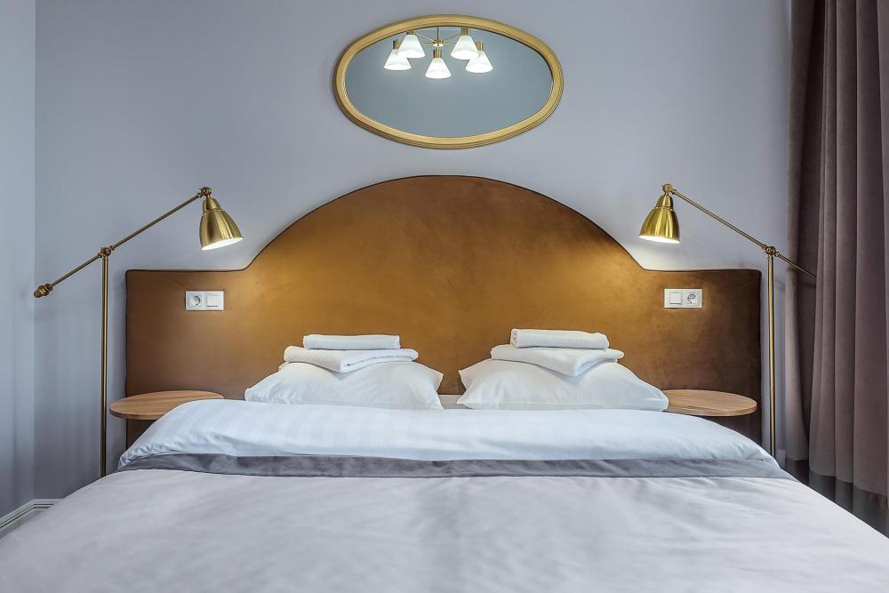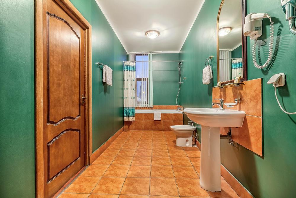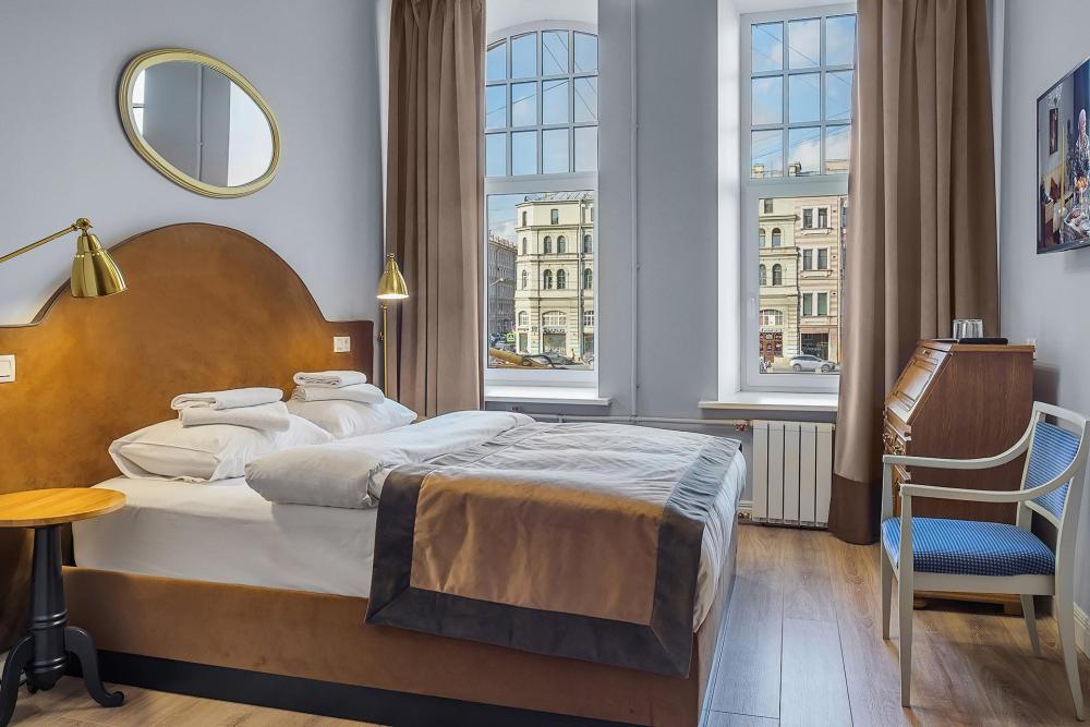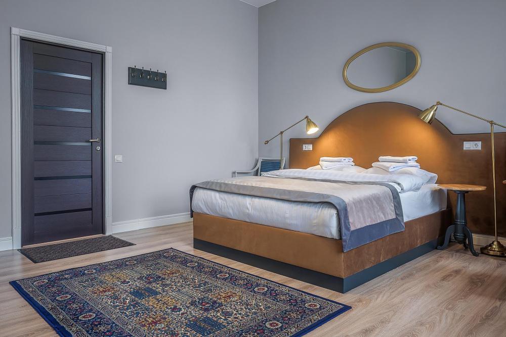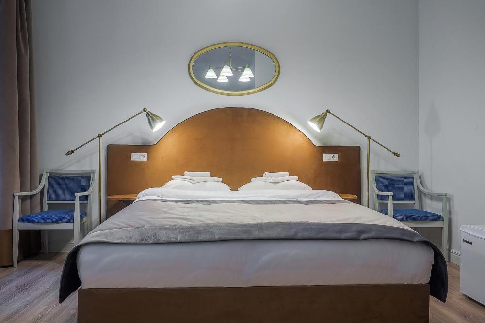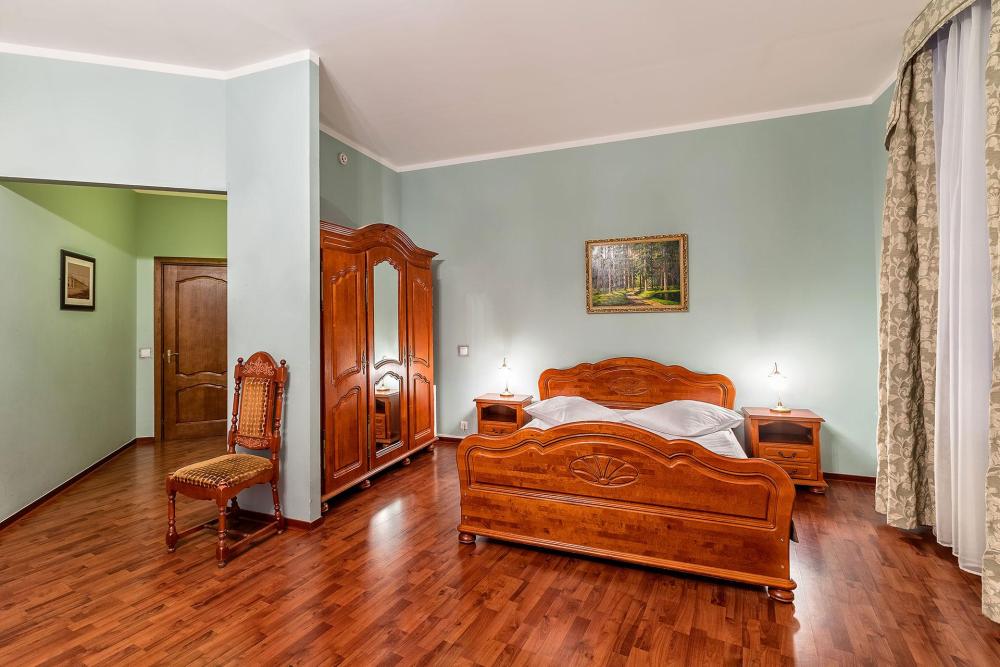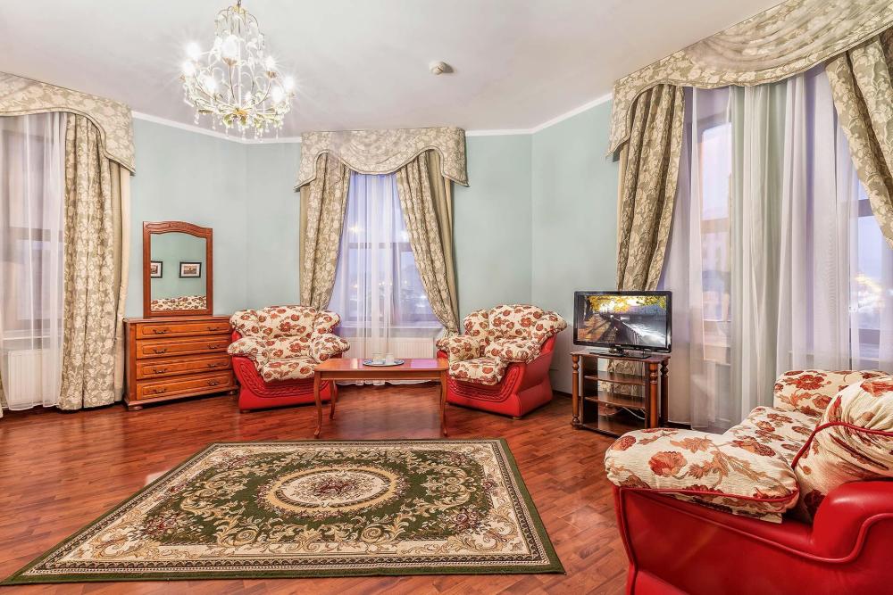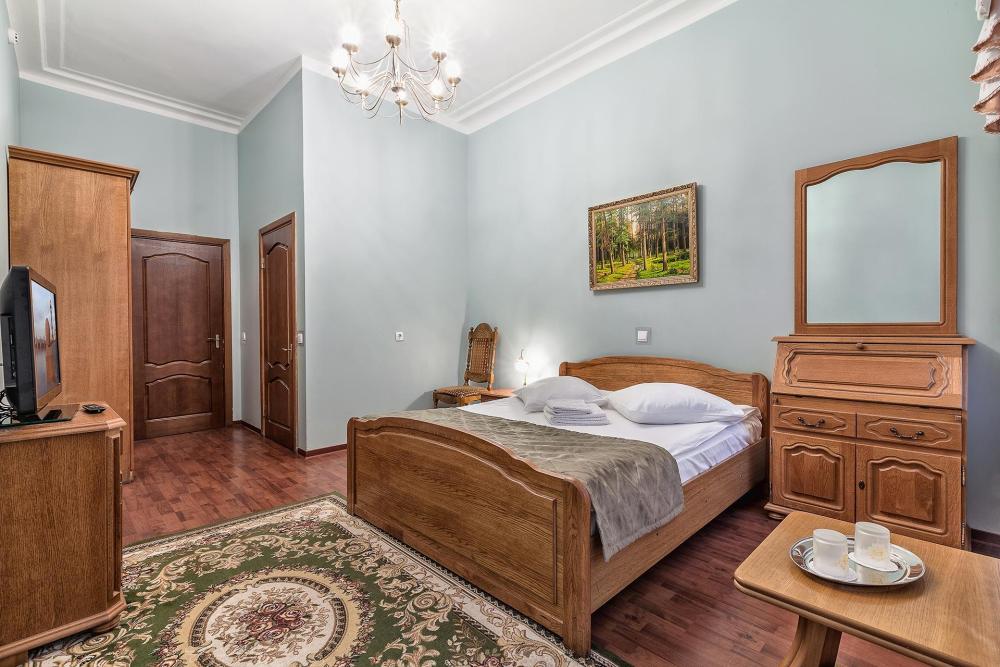 Комната площадью 40 кв.м. с окнами, выходящими на Бородинскую улицу или в тихий внутренний дворик. В комнате, помимо стандартного мебельного набора, имеется раскладной двуспальный диван, фортепьяно и изразцовый камин. В ванной комнате – душевая кабинка или ванна.