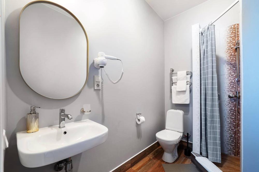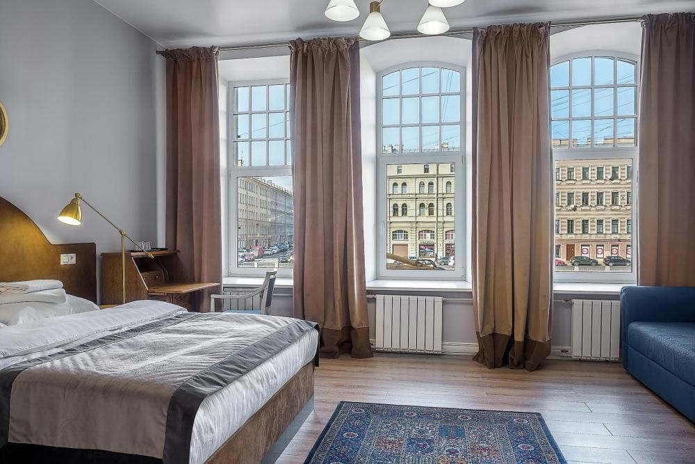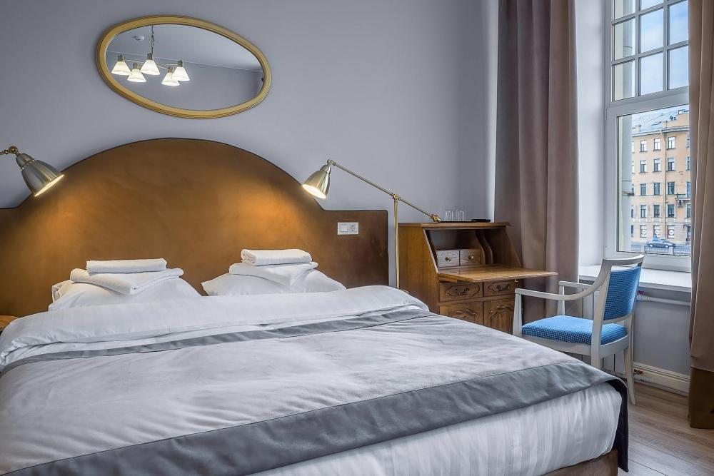 Комнаты с тремя окнами, выходящими на реку Фонтанку. В комнате, помимо стандартного мебельного набора, имеется полутороспальный раскладной диван. Есть возможность поставить раскладушку. В ванной комнате – душевая кабинка.
