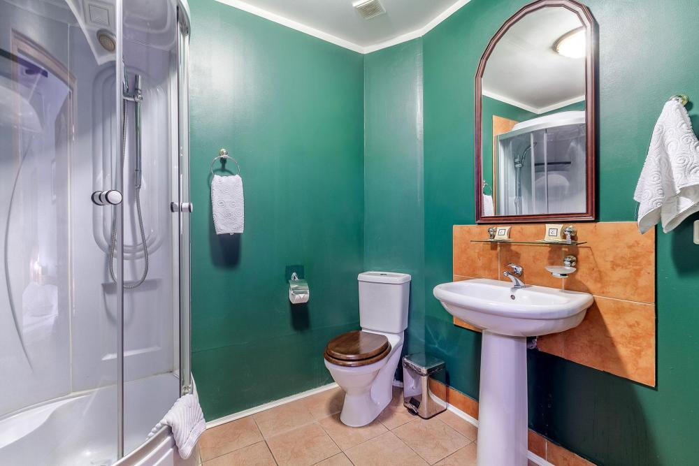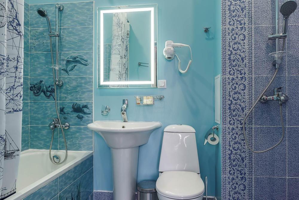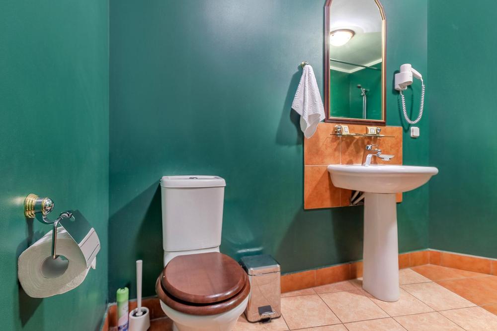 В комнате двуспальная кровать, прикроватная тумбочка, шкаф, секретер, два стула, диван (раскладной), плазменный телевизор, мини-холодильник. В ванной комнате душевая кабинка и ванна.