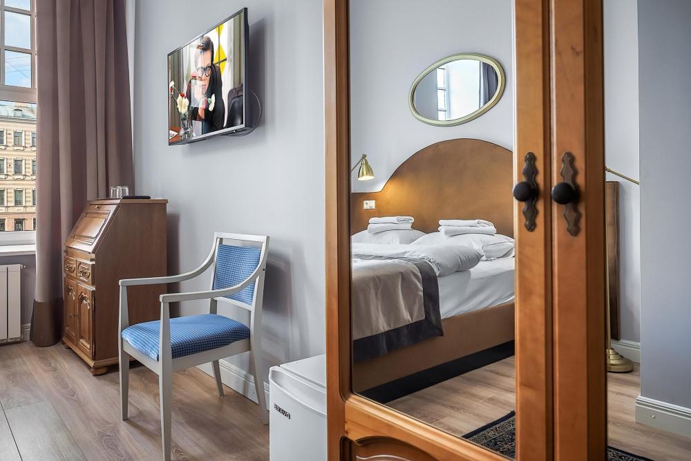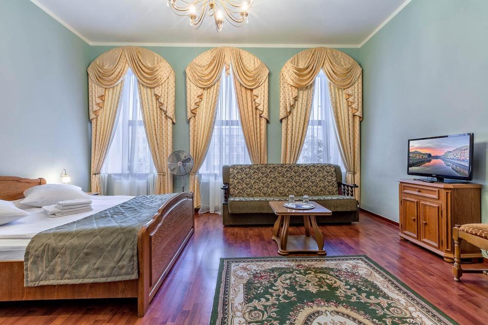 Самая просторная комната, площадью 51 кв.м., с окнами, выходящими на набережную Фонтанки и спокойную Бородинскую улицу. В комнате есть мягкий гарнитур с раскладным двуспальным диваном, двуспальная кровать и гардероб, стол-бюро, телевизор; отделенная стеной от основного номера прихожая с большим зеркалом. В ванной комнате с отдельным окном – ванна и биде.