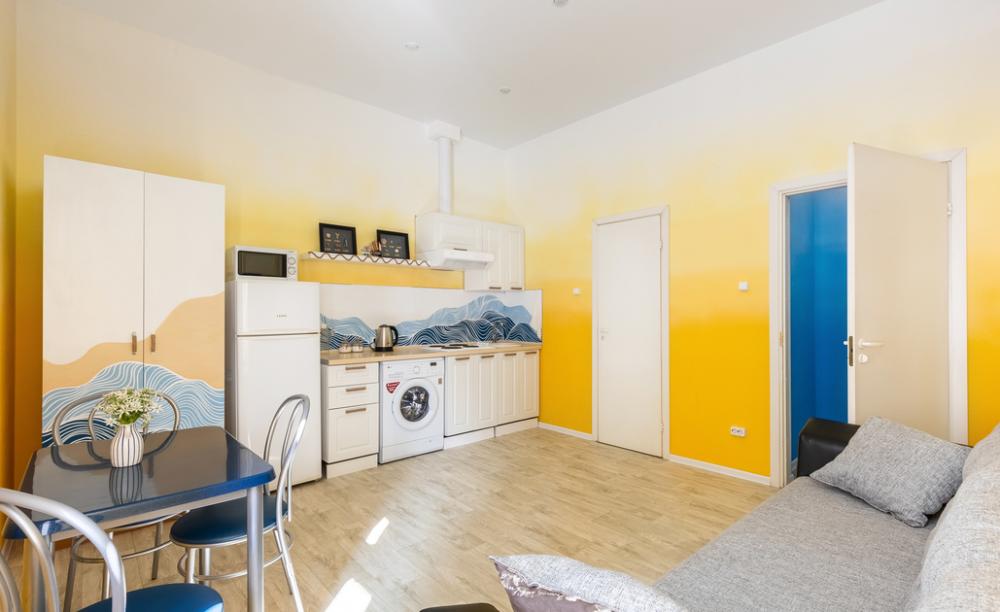 Двухкомнатные апартаменты с раздельными комнатами и кухней в центре города на знаменитой улице Рубинштейна, где неимоверное количество ресторанов, кафе, булочных, баров. А также рядом с нами находятся два шикарных театра. Наши апартаменты располагаются внутри второго двора и в них очень уютно и спокойно по вечерам и ночам, когда активная жизнь на этой улице только начинается. Так же в соседнем дворе для гостей с детьми есть огромная детская площадка. Все магазины в шаговой доступности. Данные апартаменты расчитаны на двоих или компанию до 4-х человек. В коридоре созданы ниши, где не только "прекрасный пол" сможет погрузиться в создание шикарного макияжа под специально созданное освещение, но и можно разместить достаточно много вещей. В спальной комнате размещается комфортная кровать, комод и огромный шкаф-купе с отдельным рабочим местом. По вечерам, если солнце появляется в Санкт-Петербурге, спальня наполняется янтарным теплым светом, если Вы не захотите им насладиться, то на окнах расположены не только обычные black out, но и рулонные шторы. В большой комнате, которая соединена с кухней размещен комфортный раскладной диван , обеденная группа. На кухне есть все необходимое для приготовления завтрака, обеда или ужина: варочная поверхность, электрический чайник, холодильник, микроволновая печь, посудомоечная машина, тостер. Имеется стиральная машина, если необходима стирка белья - порошок предоставляется бесплатно. Также в апартаментах имеется с/у с большой ванной, где имеется шампунь, гель для душа и жидкое мыло. В апартаментах к Вашим услугам всегда предоставляется бесплатный Wi-fi и телевидение на все время проживания. Мы открыты к предложениям гостей и всегда рады Вам помочь на всем протяжении вашего пребывания у нас.