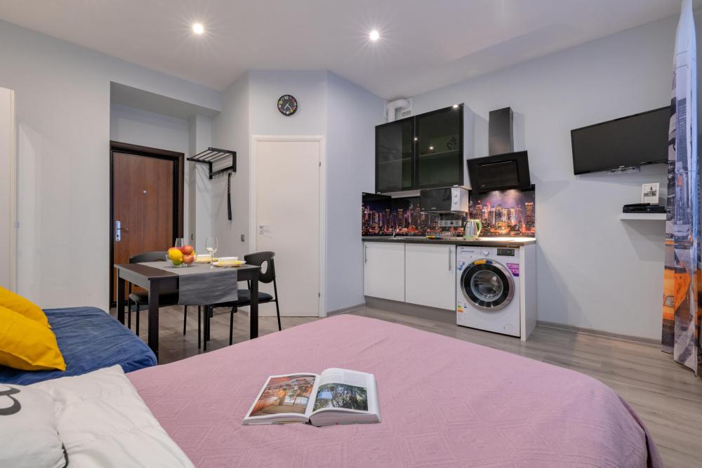 Стильная и современная квартира-студия в которой есть все необходимое как для краткосрочного так и для длительного проживания 4х гостей.В квартире студии удобная кровать размера “Queen Size”, которая позволит Вам хорошенько отдохнуть и выспаться после длительной прогулки или рабочего дня, Smart TV, где можно посмотреть интересный фильм или любимую телепередачу и полностью оборудованная кухня со всей необходимой посудой для приготовления любимых блюд.