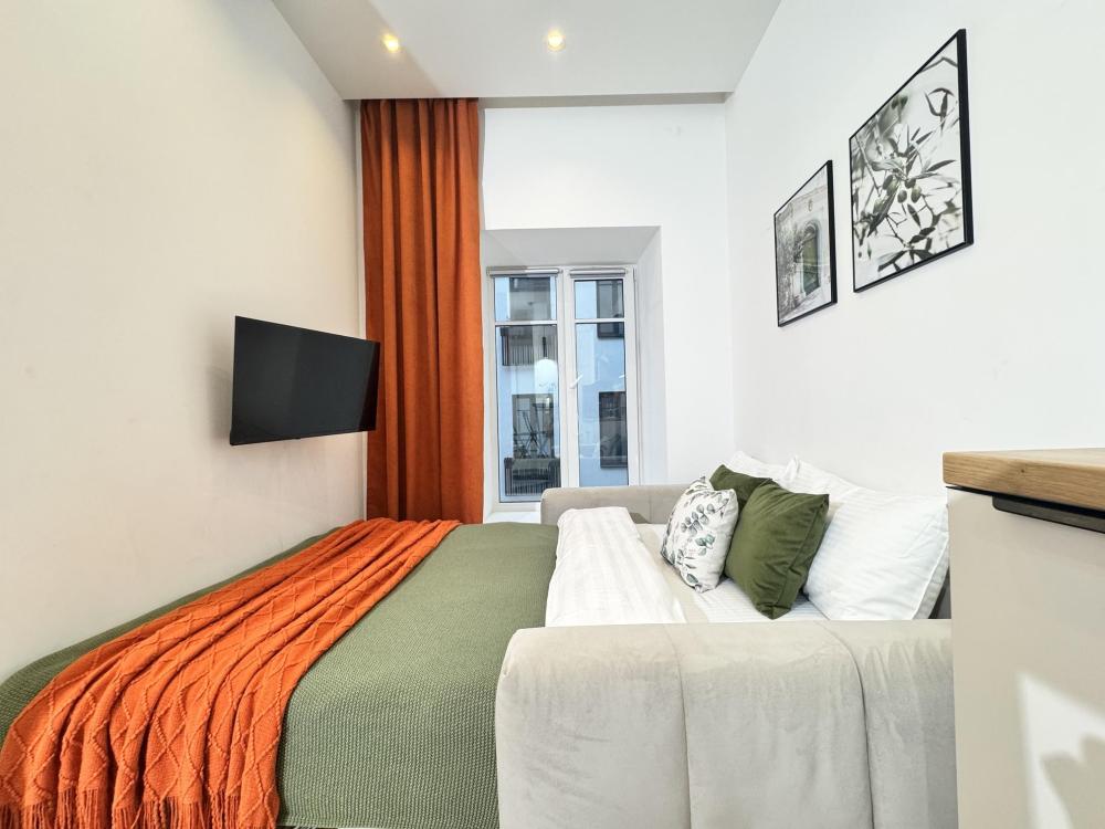 СПАЛЬНЫХ МЕСТ 2: комфортный двуспальный диван В АПАРТАМЕНТАХ ВАС ЖДЕТ: • Мультимедиа: WI – FI, телевизор • Бытовая техника: плита, холодильник, фен, утюг • Дополнительно: постельное белье, полотенца, средства гигиены, посуда, чай, сахар.