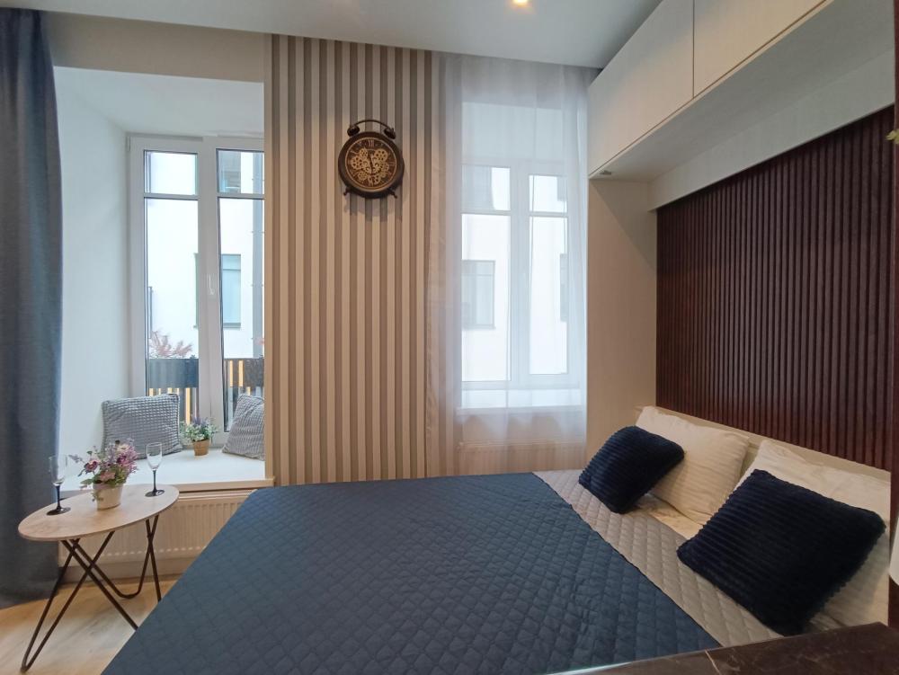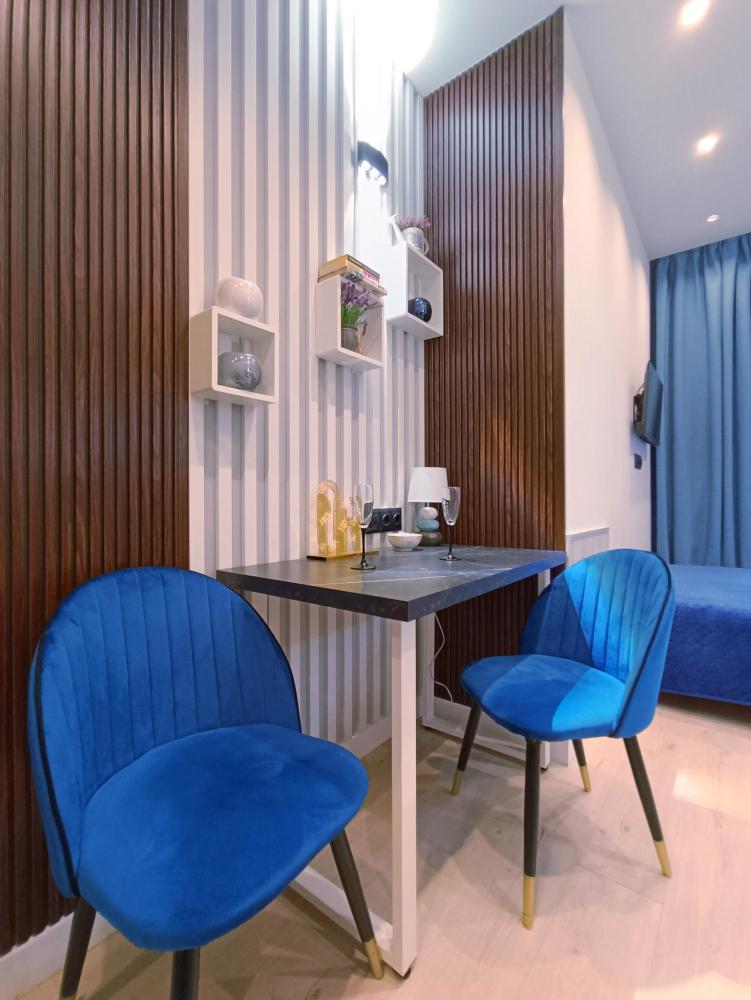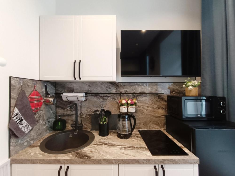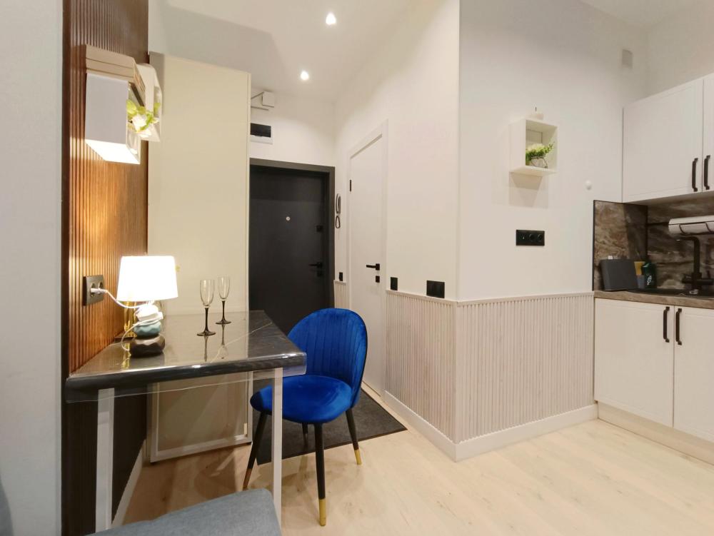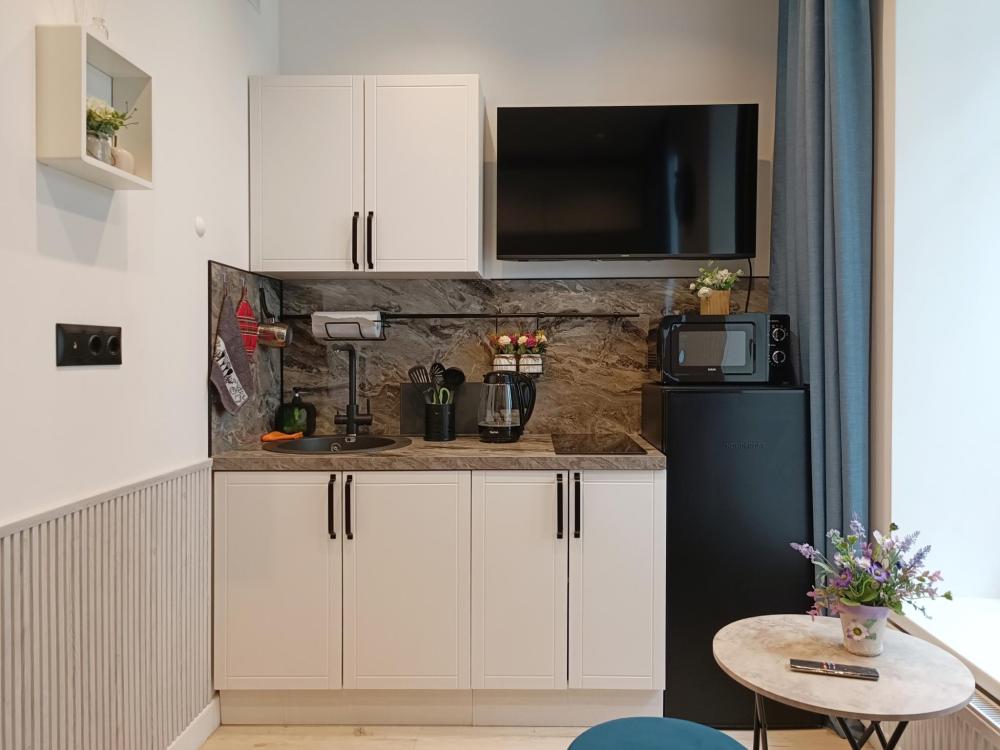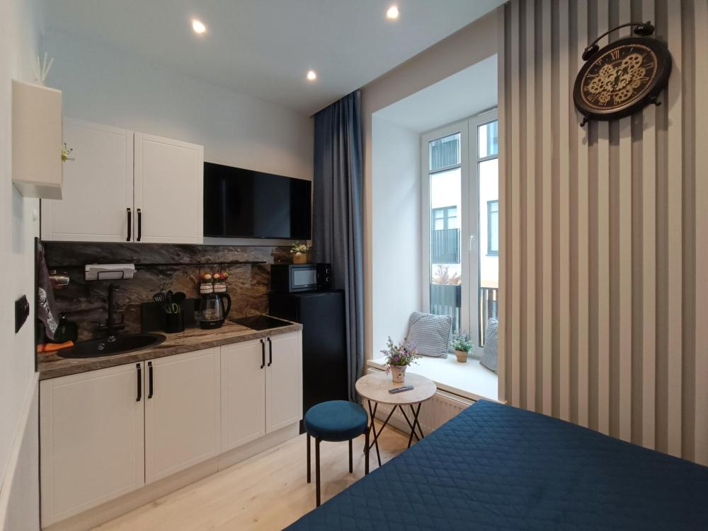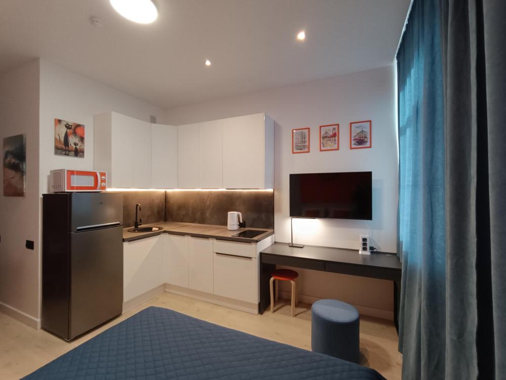 В апартаментах возможно размещение 2 гостей. Спальное место: двуспальная кровать. Кухня оборудована необходимой посудой и техникой: электрическая плита, микроволновка, чайник, холодильник. К услугам гостей также телевизор, стиральная машина, фен, постельное бельё, полотенца, тапочки. Есть отдельное рабочее место.