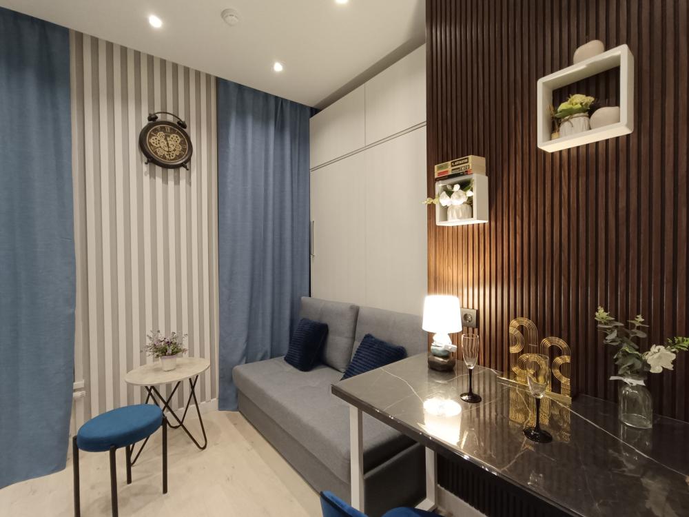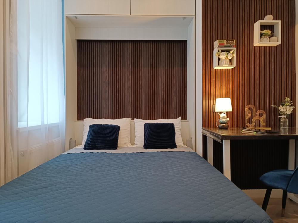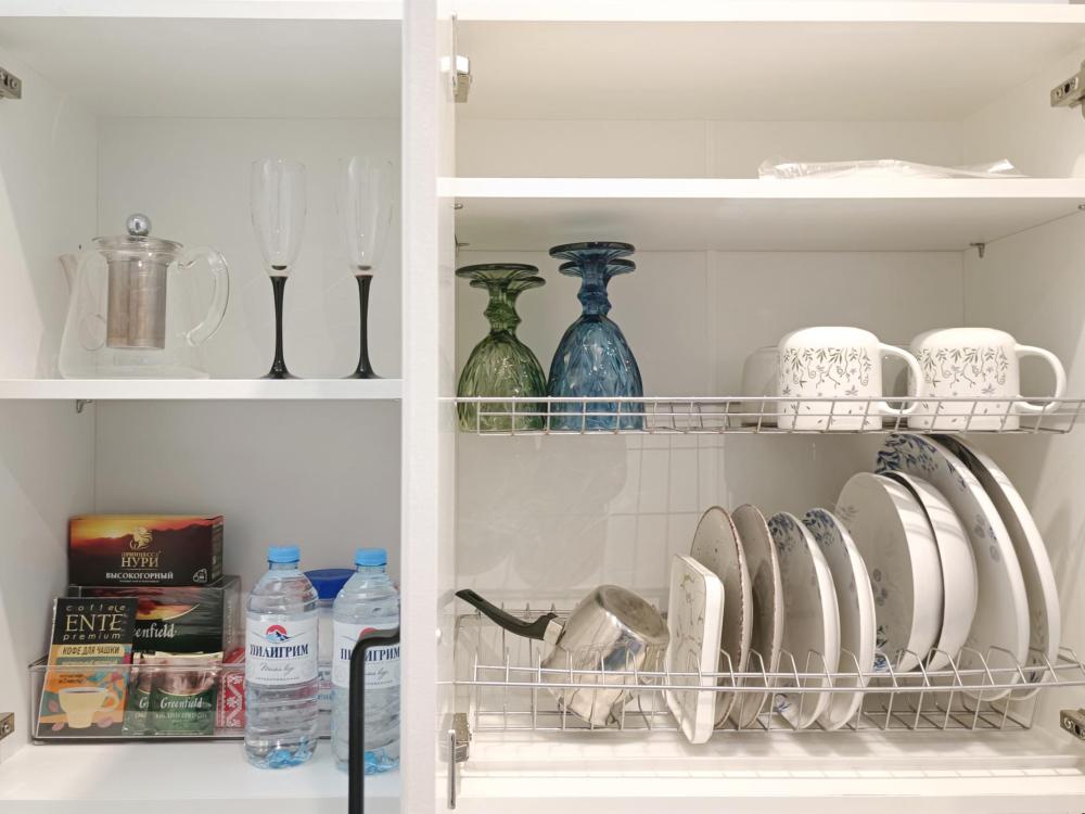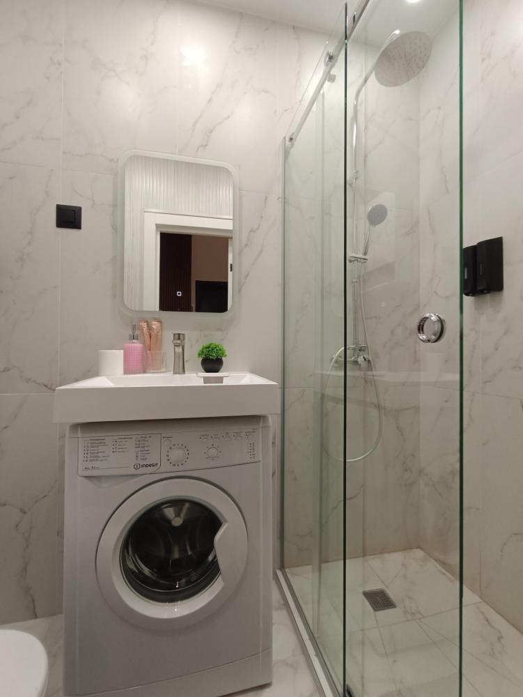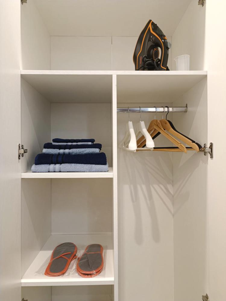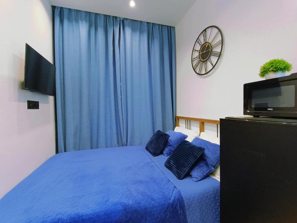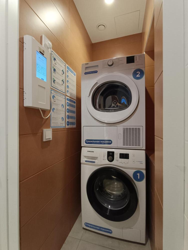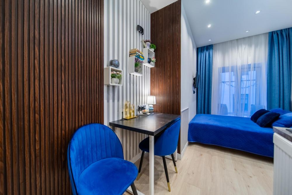 В апартаментах возможно размещение 2 гостей. Спальное место: двуспальная кровать. Кухня оборудована необходимой посудой и техникой: электрическая плита, микроволновка, чайник, холодильник. К услугам гостей также телевизор, стиральная машина, фен, постельное бельё, полотенца, тапочки. Есть отдельное рабочее место.