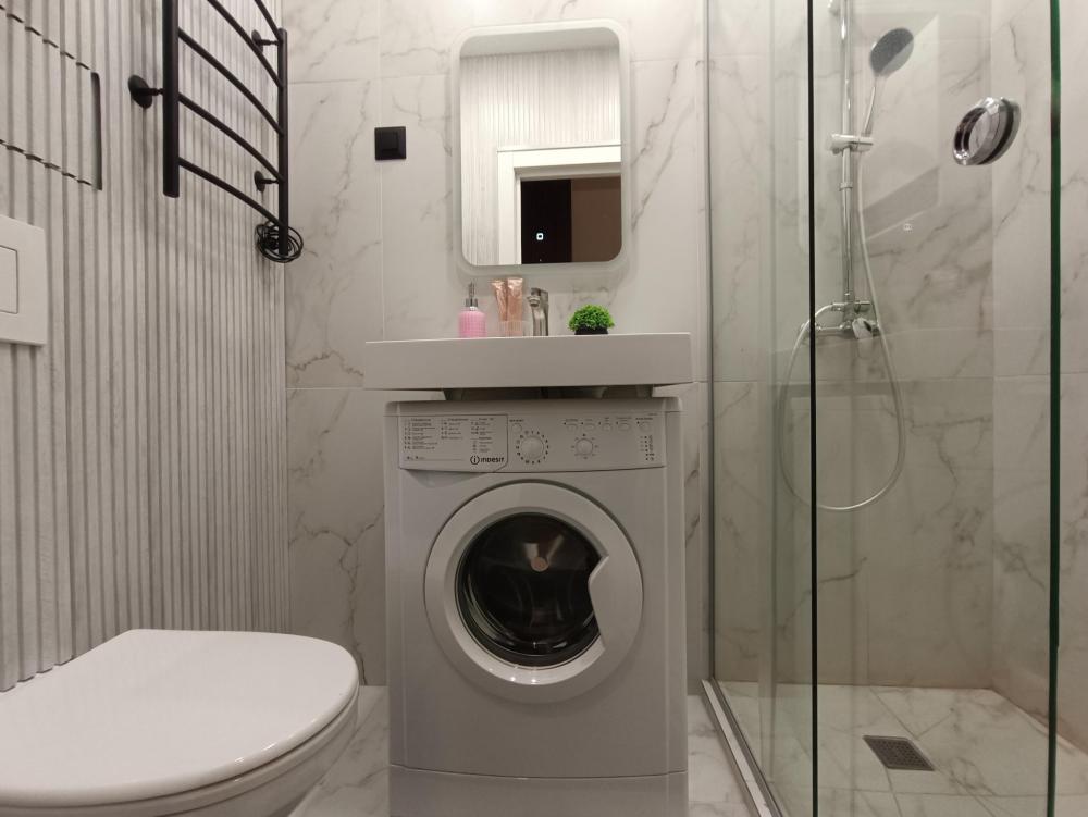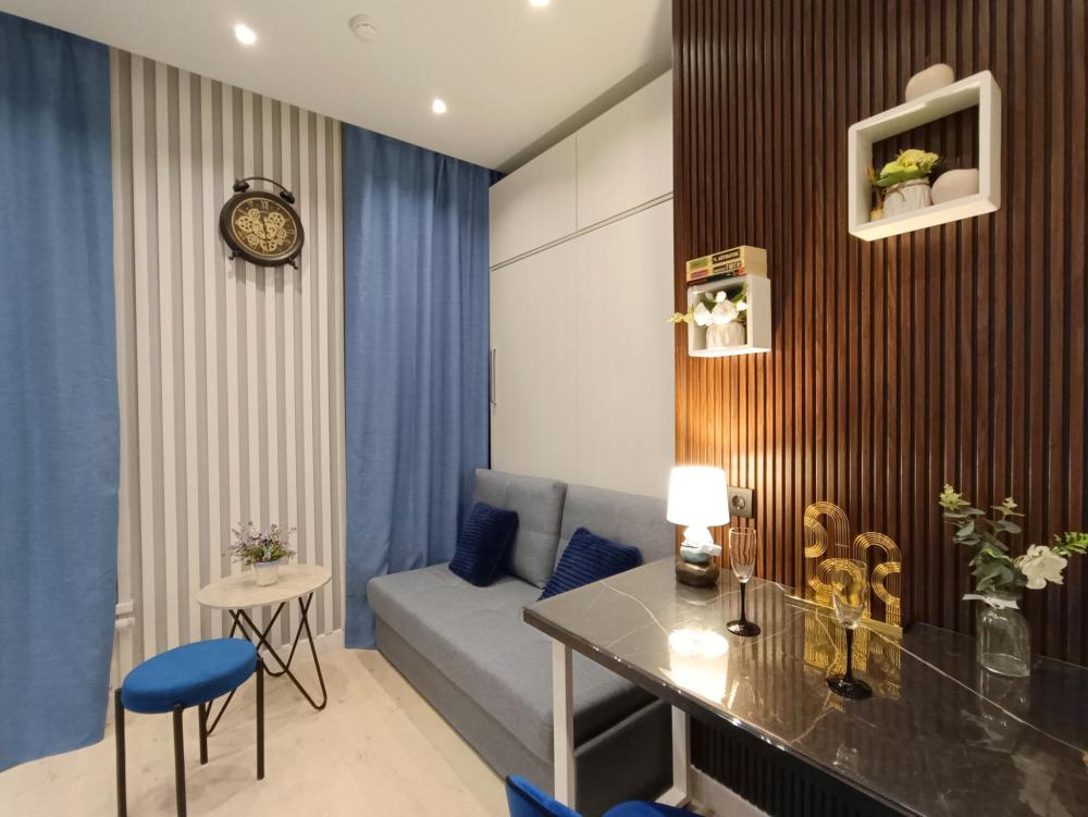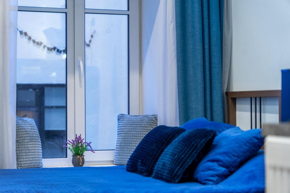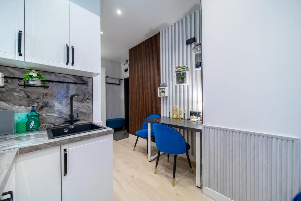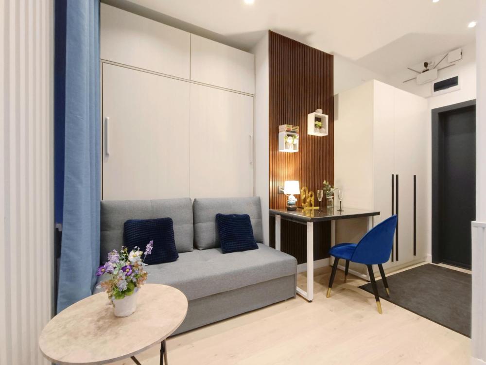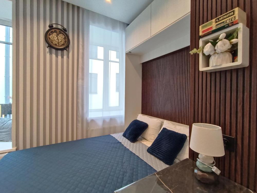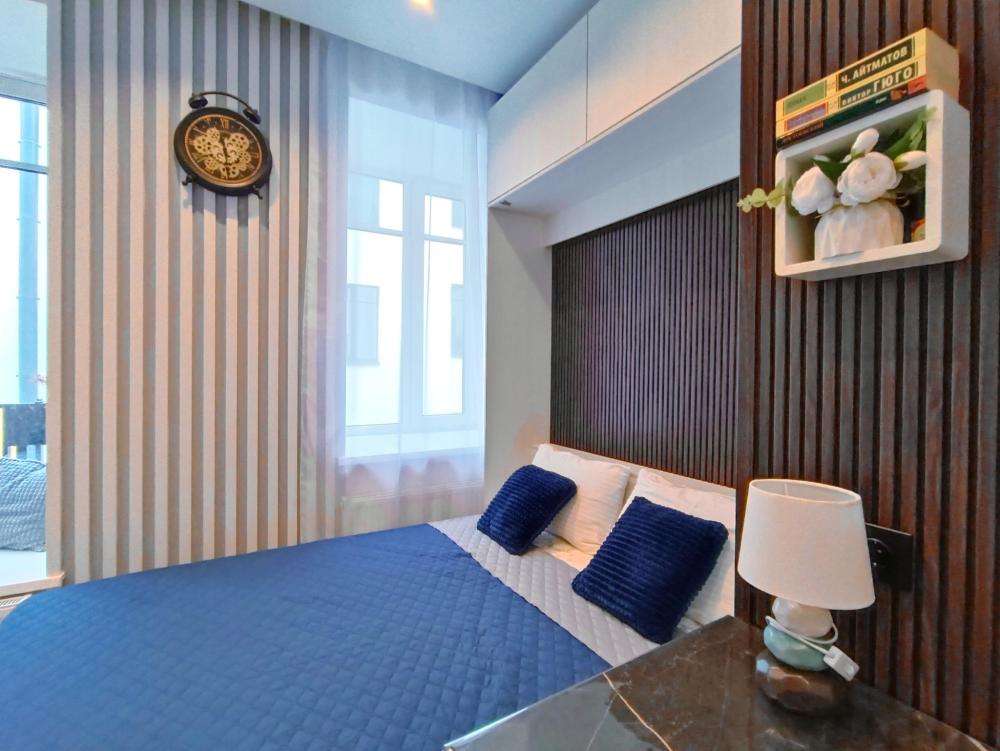 В апартаментах возможно размещение 2 гостей. Спальное место: двуспальная кровать. Кухня оборудована необходимой посудой и техникой: электрическая плита, микроволновка, чайник, холодильник. К услугам гостей также телевизор, стиральная машина, фен, постельное бельё, полотенца, тапочки. Есть отдельное рабочее место.