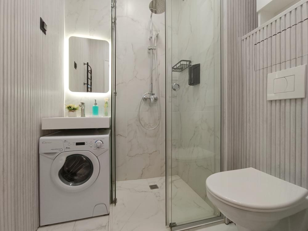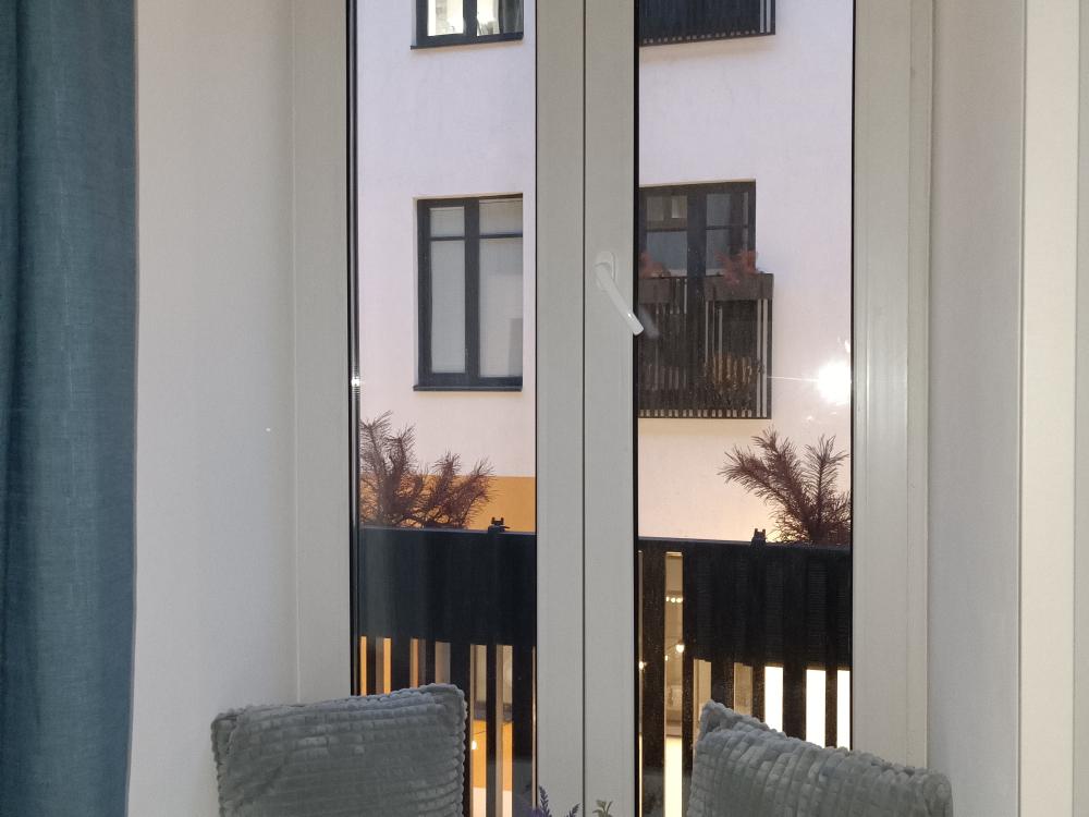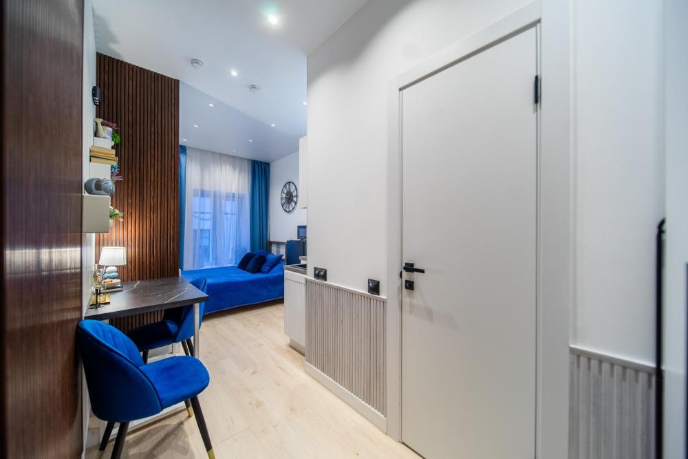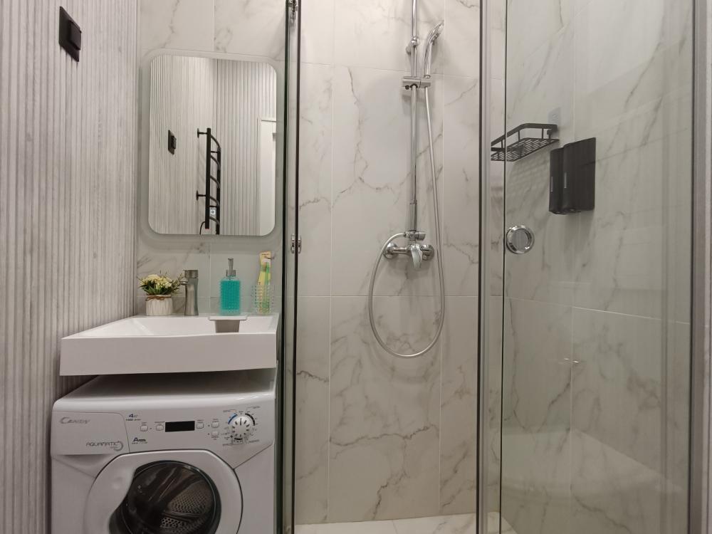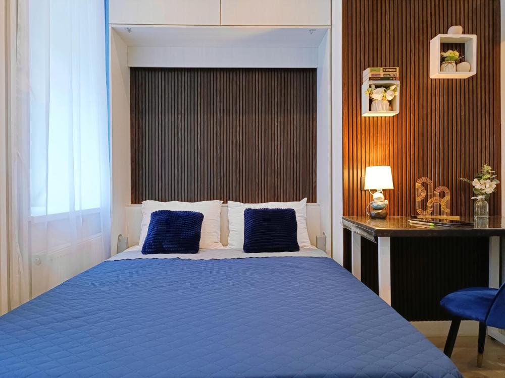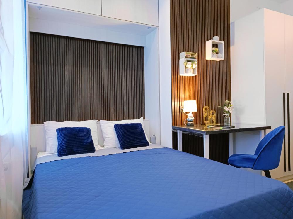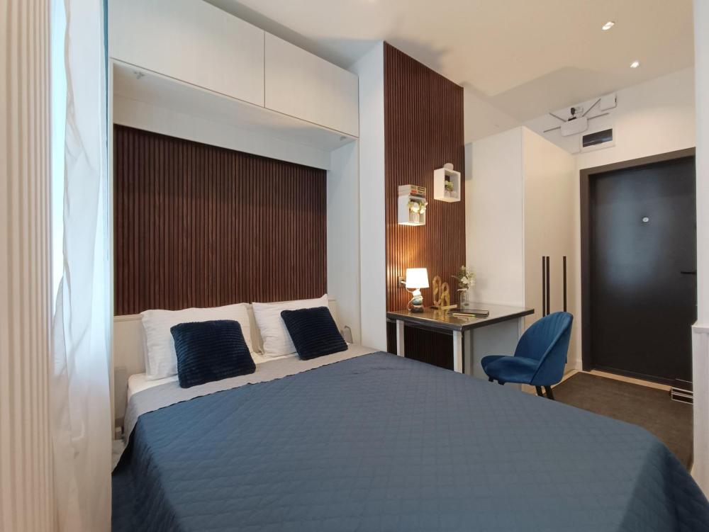 В апартаментах возможно размещение 2 гостей. Спальное место: двуспальная кровать. Кухня оборудована необходимой посудой и техникой: электрическая плита, микроволновка, чайник, холодильник. К услугам гостей также телевизор, стиральная машина, фен, постельное бельё, полотенца, тапочки. Есть отдельное рабочее место.