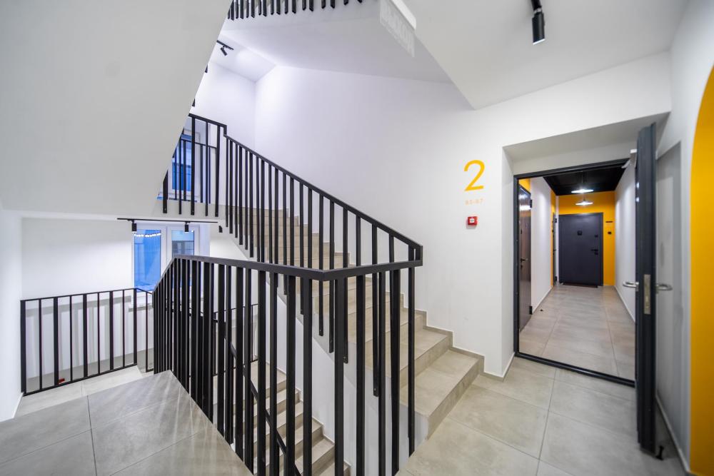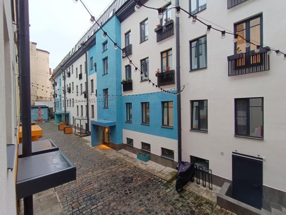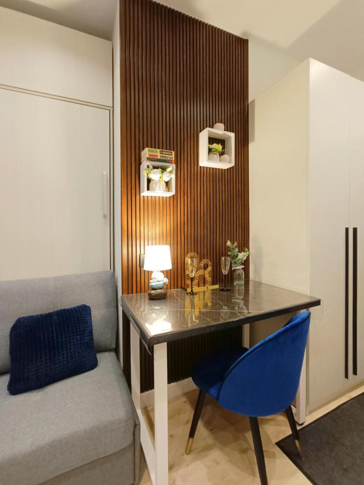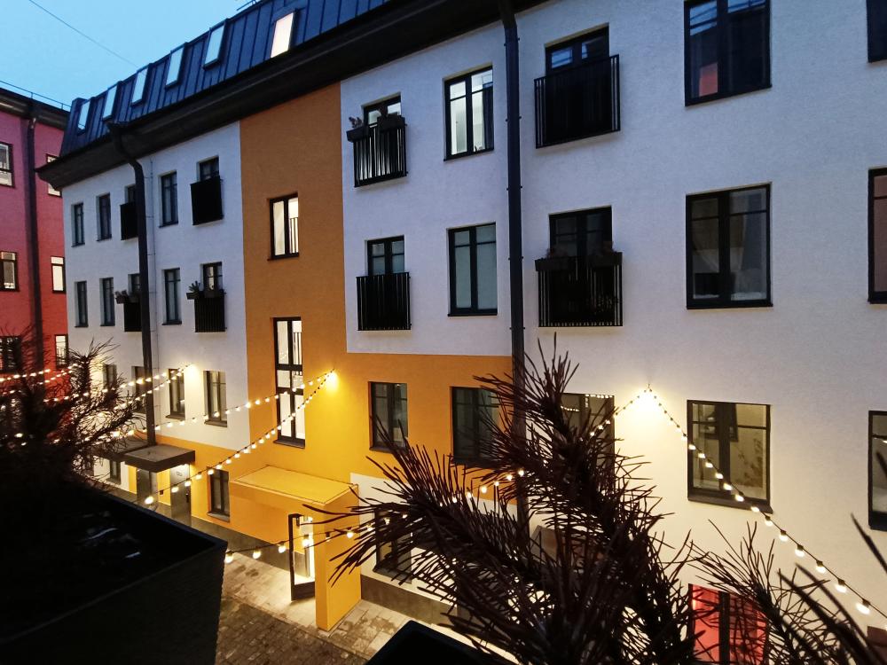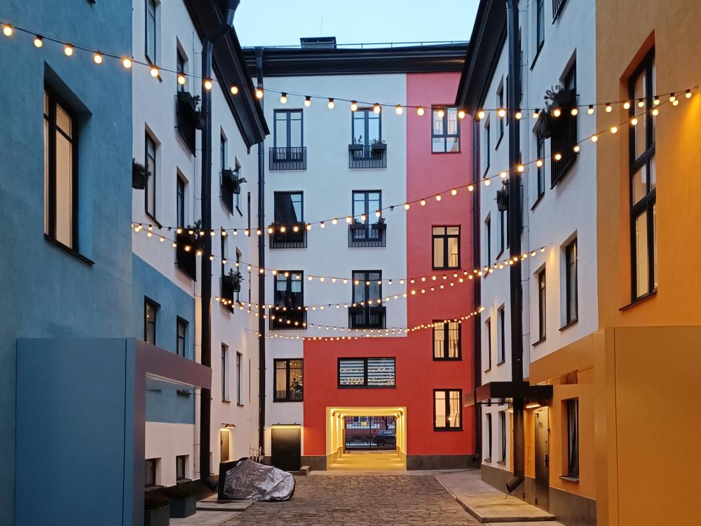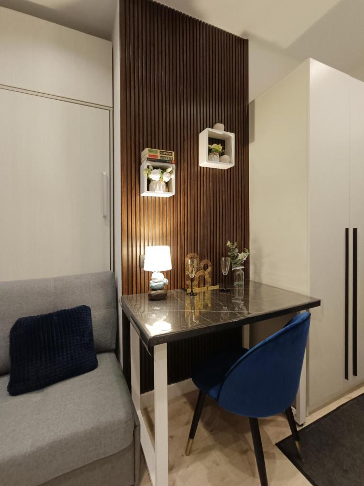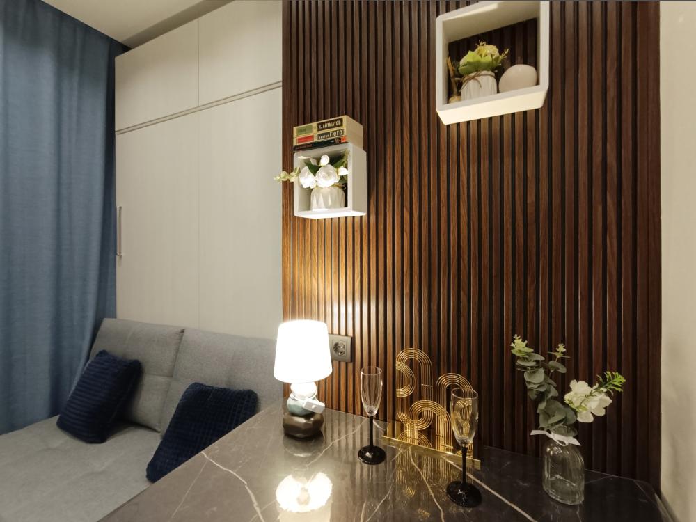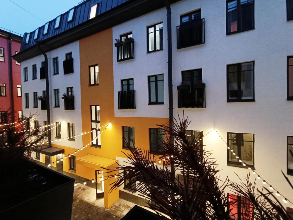 В апартаментах возможно размещение 2 гостей. Спальное место: двуспальная кровать. Кухня оборудована необходимой посудой и техникой: электрическая плита, микроволновка, чайник, холодильник. К услугам гостей также телевизор, стиральная машина, фен, постельное бельё, полотенца, тапочки. Есть отдельное рабочее место.