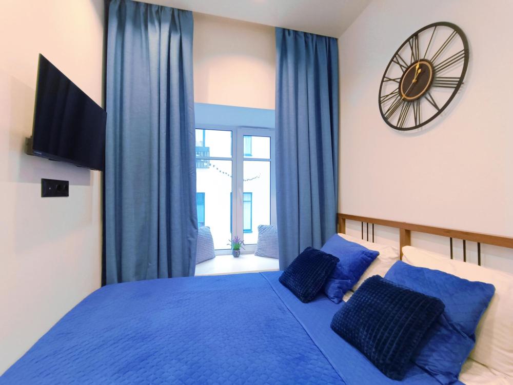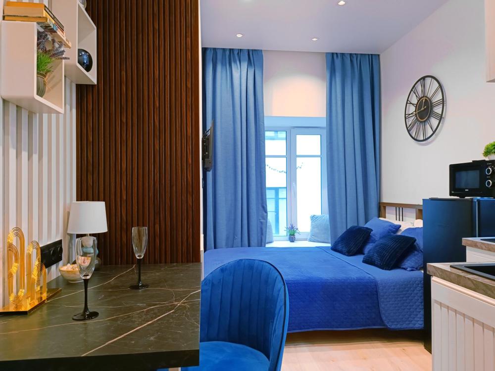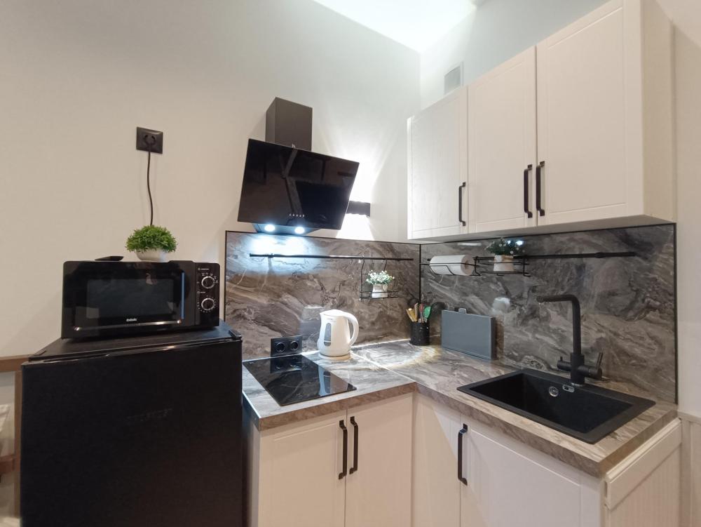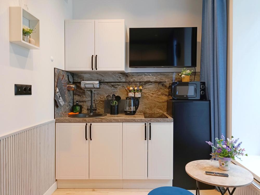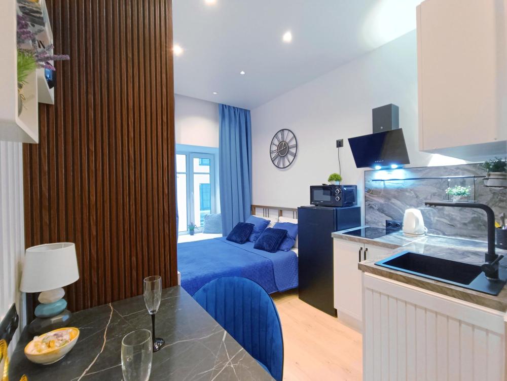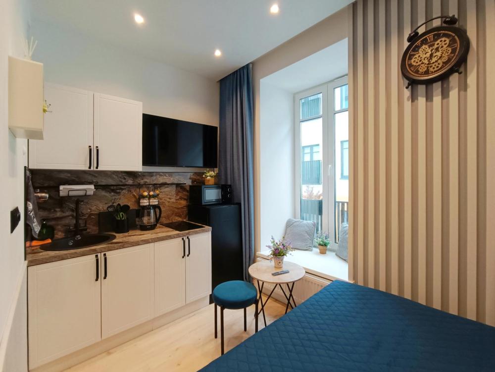 В апартаментах возможно размещение 2 гостей. Спальное место: двуспальная кровать. Кухня оборудована необходимой посудой и техникой: электрическая плита, микроволновка, чайник, холодильник. К услугам гостей также телевизор, стиральная машина, фен, постельное бельё, полотенца, тапочки.
