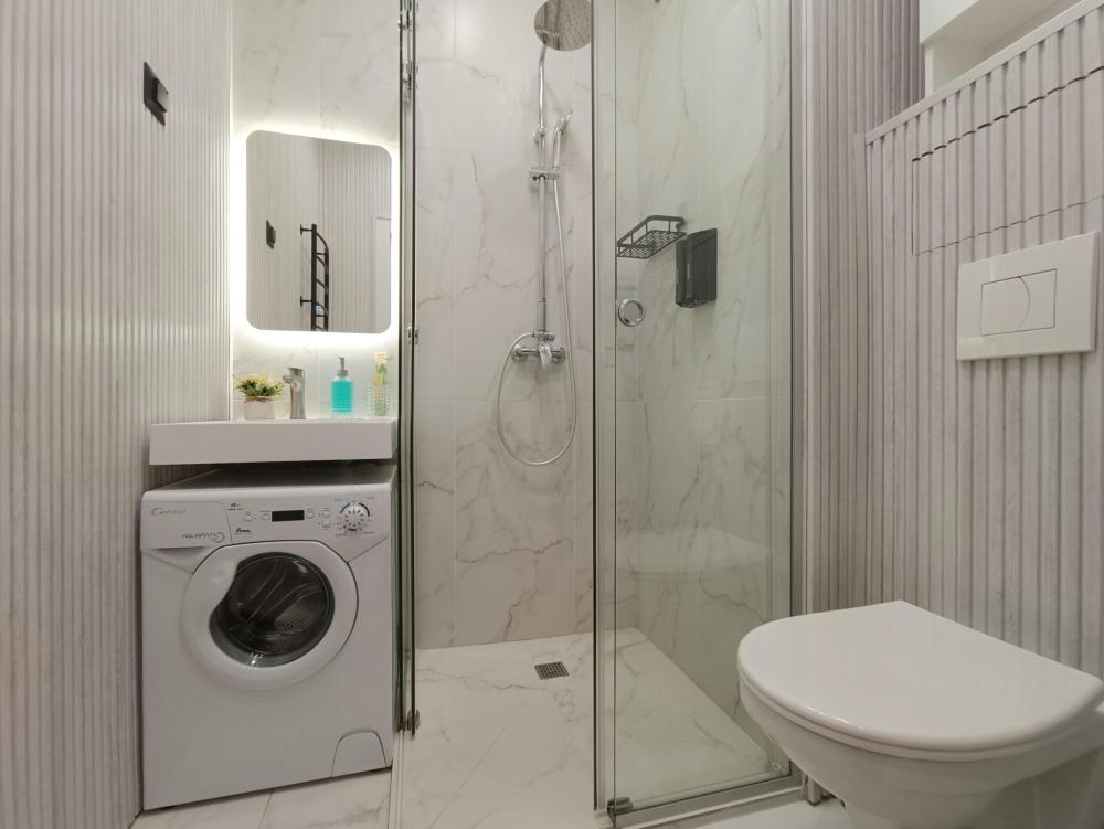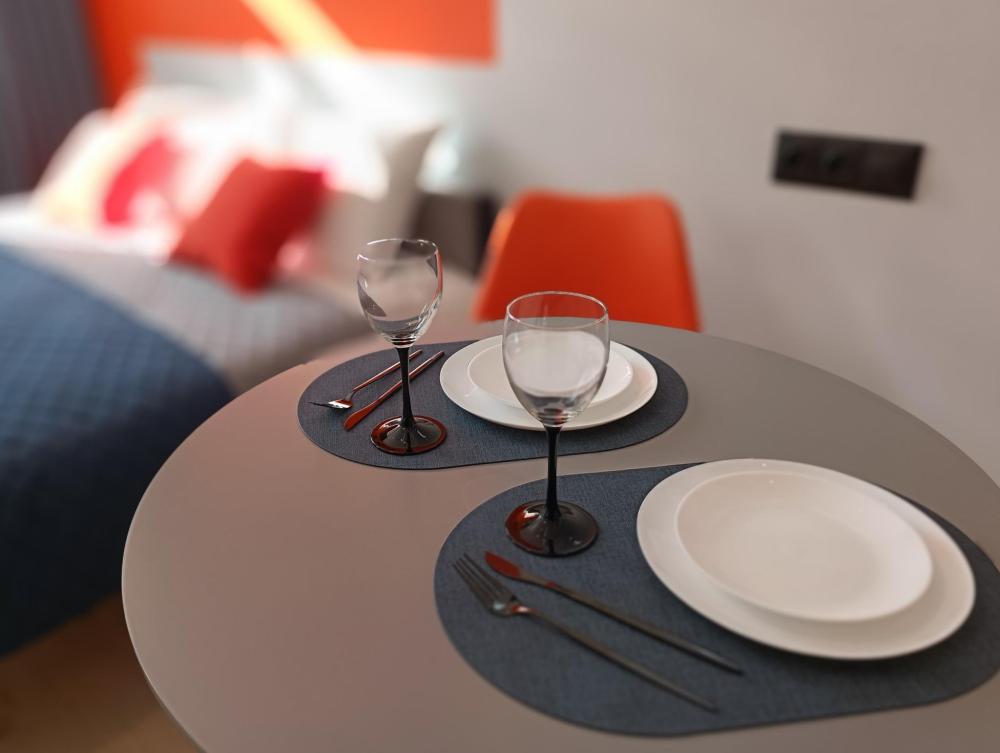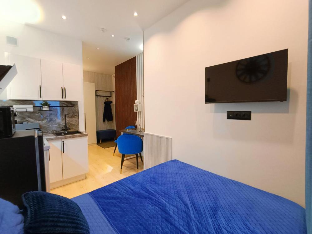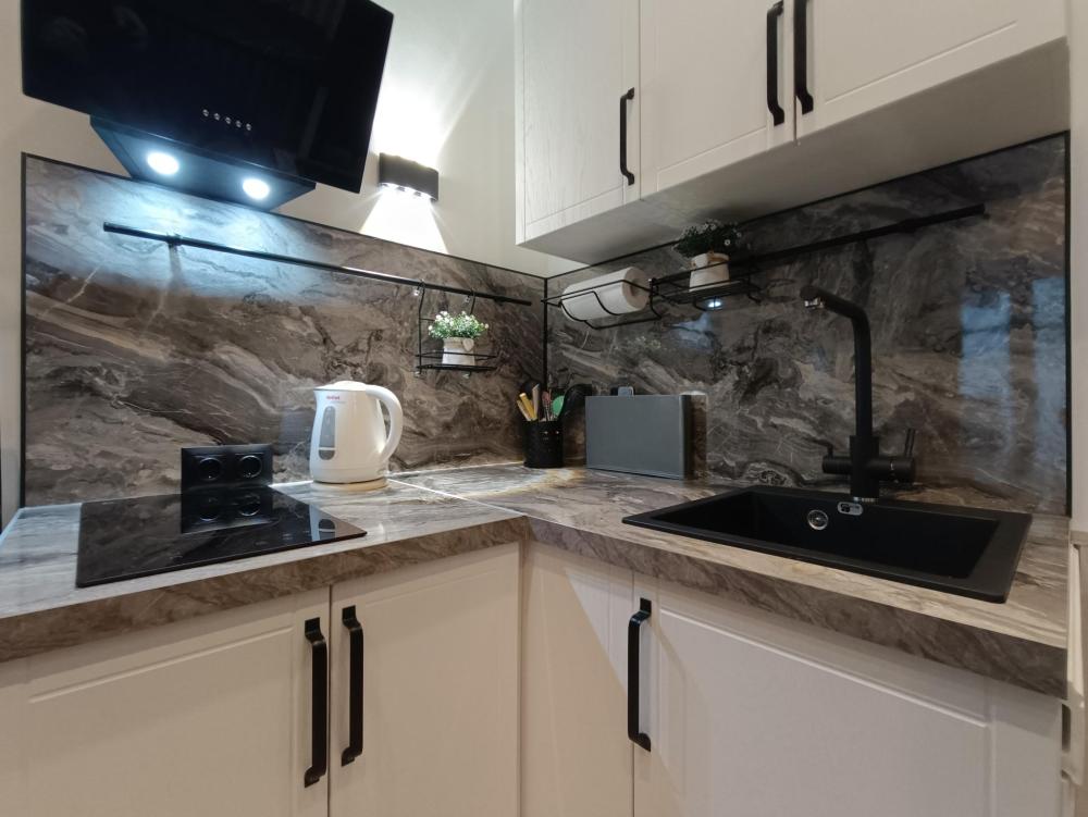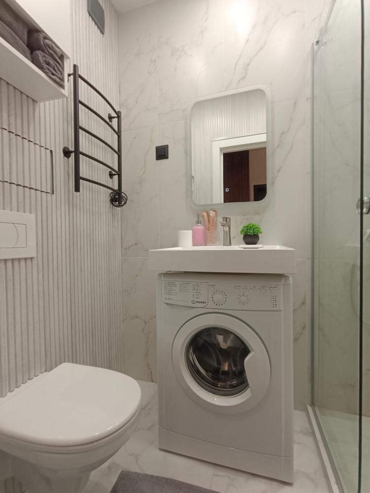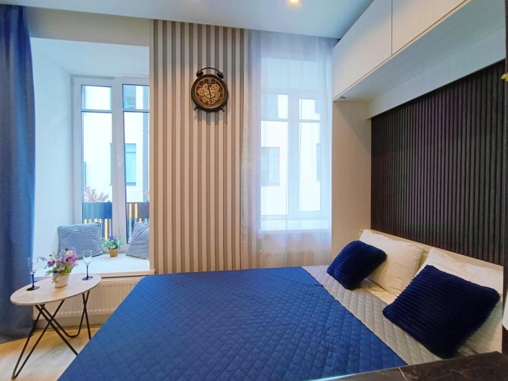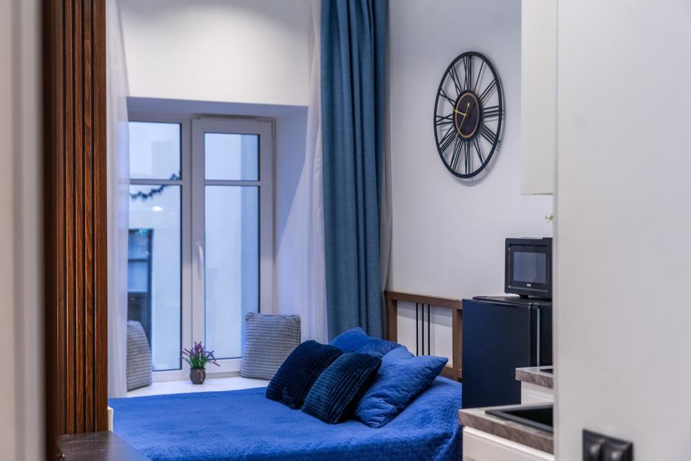 В апартаментах возможно размещение 2 гостей. Спальное место: двуспальная кровать. Кухня оборудована необходимой посудой и техникой: электрическая плита, микроволновка, чайник, холодильник. К услугам гостей также телевизор, стиральная машина, фен, постельное бельё, полотенца, тапочки.