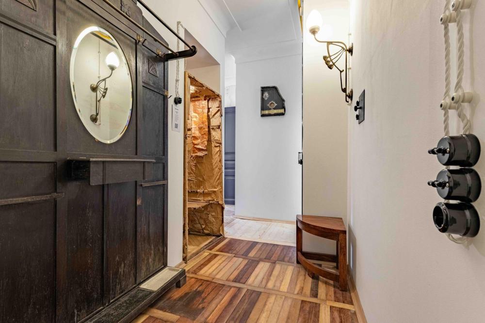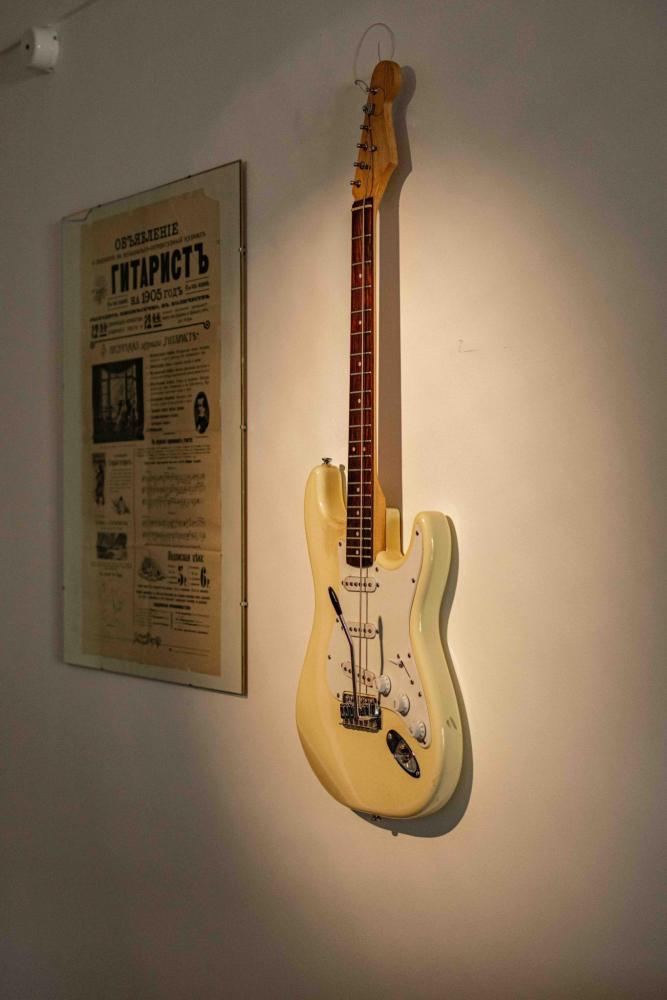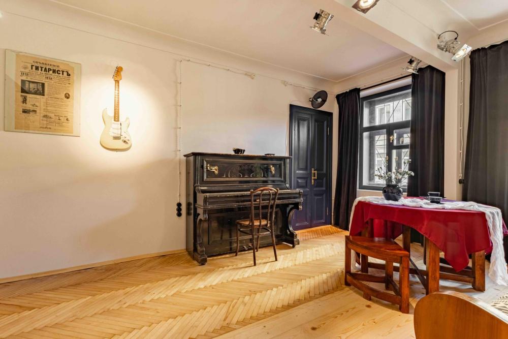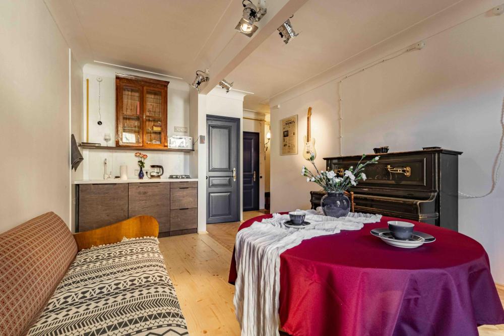 Интерьер продуман до мелочей: синие двери, деревянный пол, винтажное пианино, белая гитара на стене, ретро-приёмник и свет старых бра. Каждая зона квартиры имеет собственный «тембр» — как отдельный инструмент в оркестре. Квартира 40 м². Формат: отдельная спальня + кухня-гостиная. Ванная с окном и мозаикой, и широкой чашей. Три больших окна, тихий двор. Удобства : Wi-Fi, пианино, кухня с плитой, посудой, микроволновкой, чайником, стиральная машина, утюг, фен, постельное бельё и полотенца