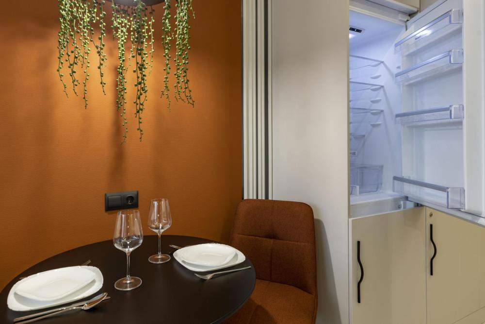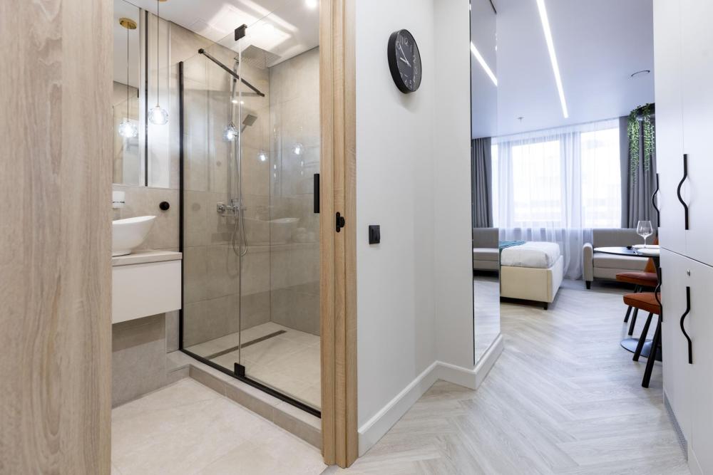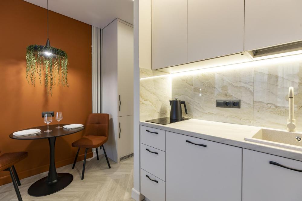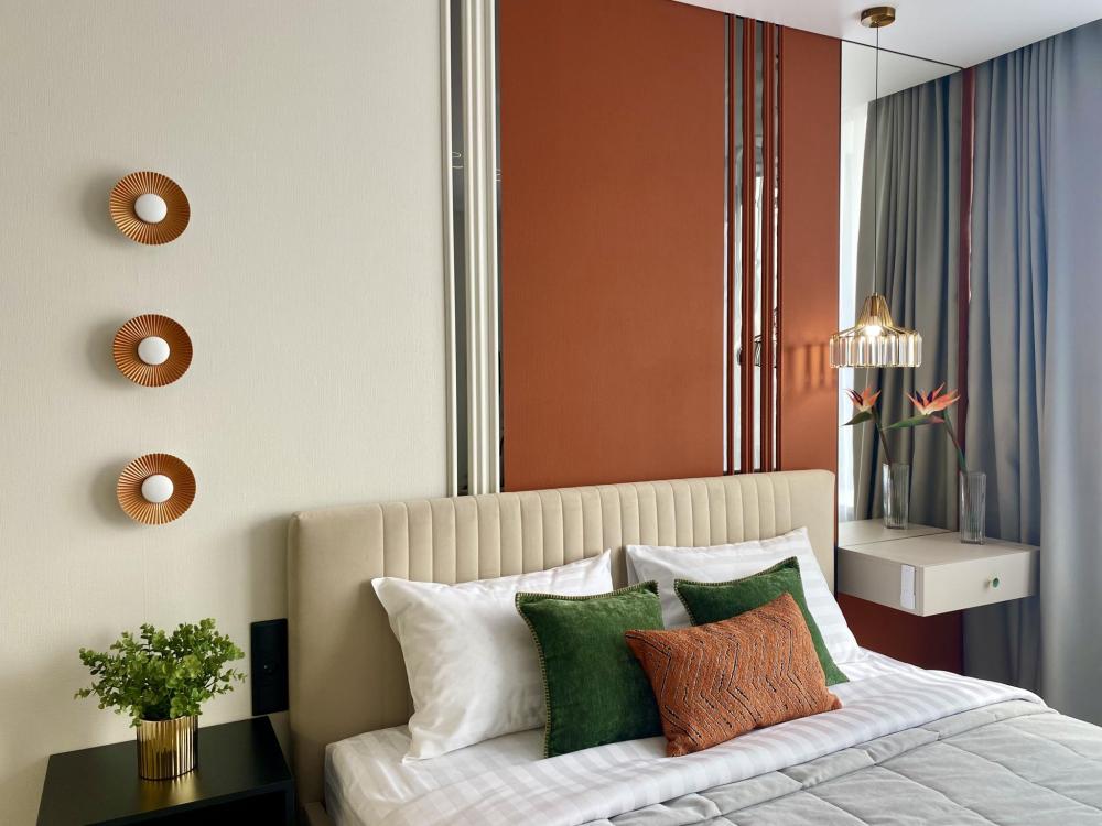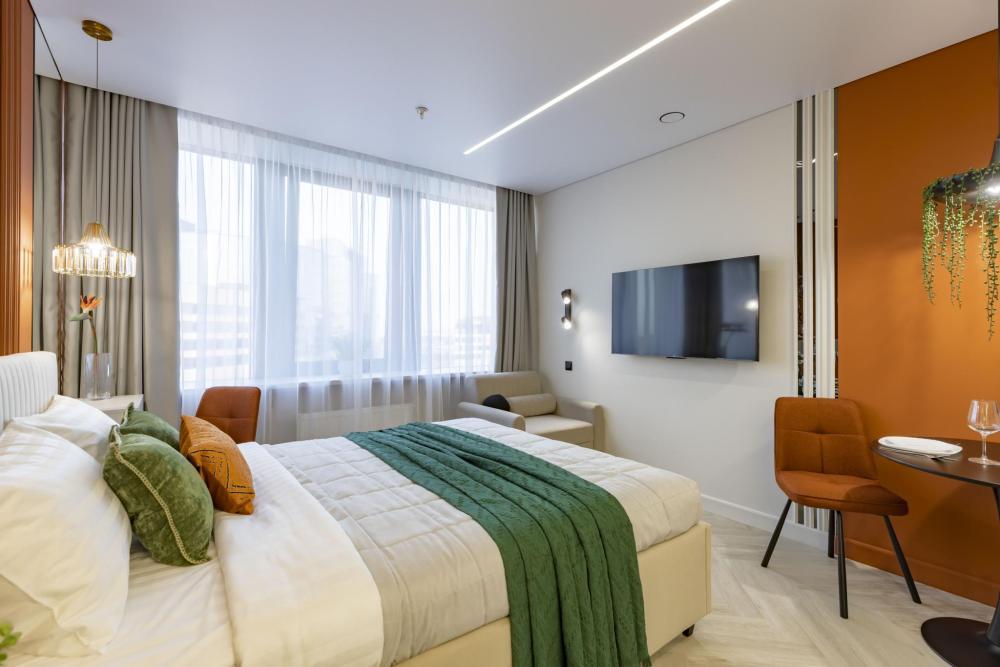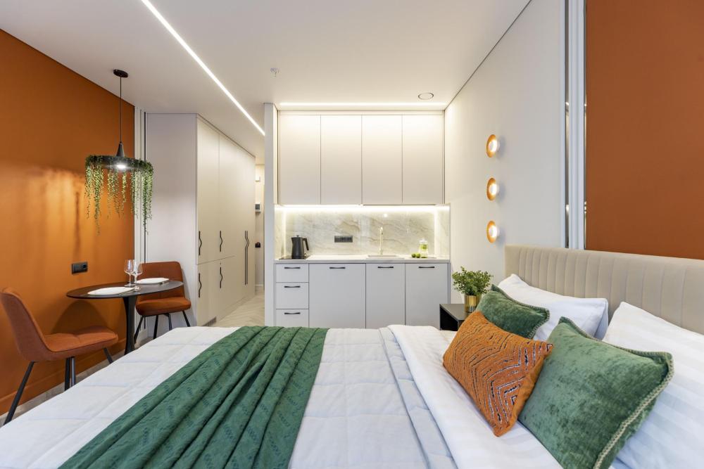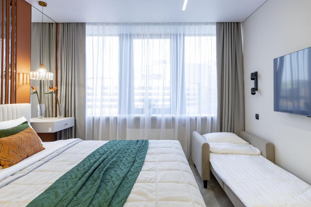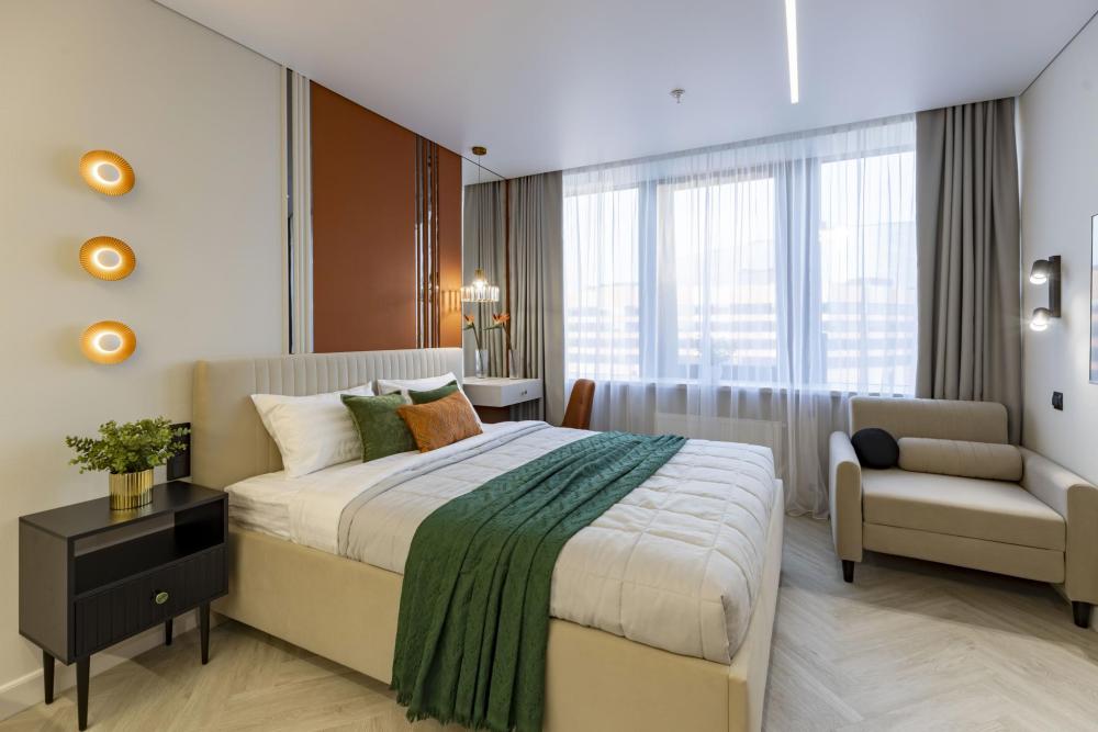 Дизaйнерские апартаменты в комплексе бизнес-класса рассчитаны на проживание 3 гостей. Кровать king sizе 160 см шириной, с ортопедическим матрасом обеспечит комфортный отдых и сон, а кресло-кровать порадует своим удобством. Большой телевизор со Smart-TV, беспроводной интернет. Подключены онлайн-кинотеатры Кинопоиск, Okko, Wink. Умная колонка Алиса. Чистое постельное бельё и полотенца хорошего качества. Шторы блэк-аут управляются дистанционно с помощью пульта. Полностью оборудованная кухня с техникой: холодильник, плита, микроволновая печь, посудомоечная машина, чайник, посуда, обеденная зона. Ванная комната, фен, утюг, стиральная машина.