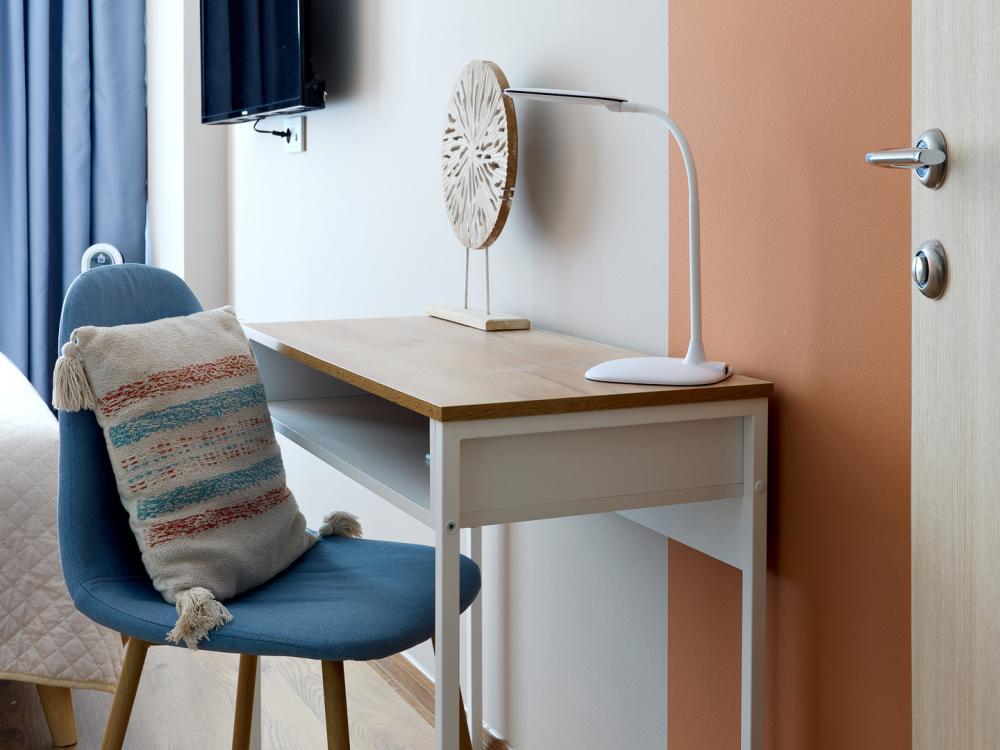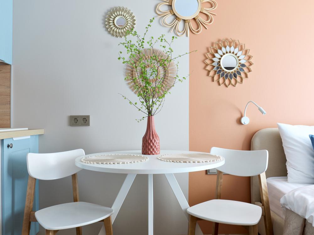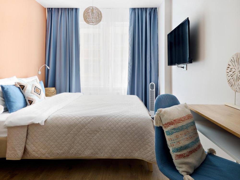 В апартаментах со стильным дизайнерским решением комфортно могут разместиться двое гостей. Кухня полностью оборудована для проживания. Комфортная обеденная зона, за которой можно расположиться как за романтическим ужином, так и за работой с ноутбуком. Двуспальная кровать 160х200 с ортопедическим матрасом и шторы Black-out – то, что нужно, чтобы выспаться и отлично отдохнуть. По предварительному запросу возможно размещение дополнительного места. Студия оснащена вместительной зоной хранения, стиральной машиной, бойлером, полотенцесушителем, феном, гладильная доска и утюг также находятся в апартаментах. Белоснежное постельное белье, комплект полотенец на каждого гостя и гигиенический набор (гель для душа, шампунь, кондиционер, ватные диски и палочки). Скоростной Wi-fi и ТВ с функцией SMART.