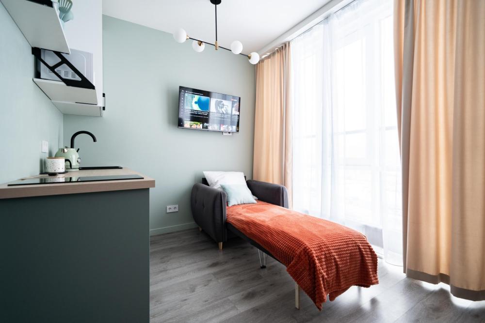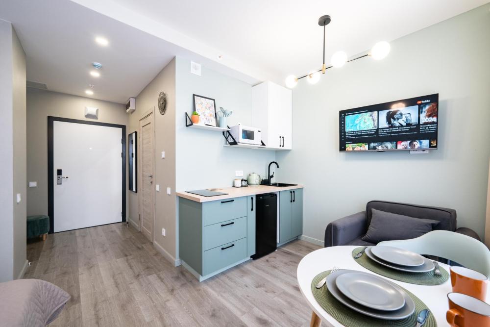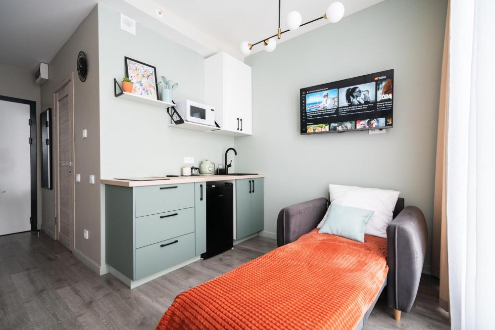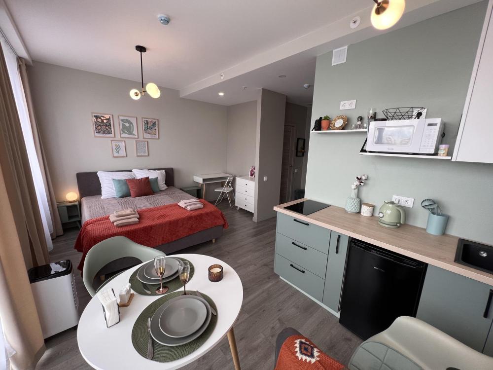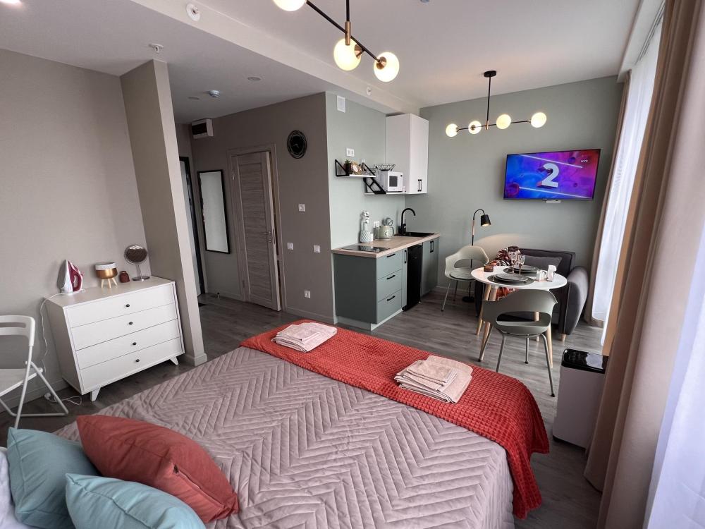 Спальных мест 4: двуспальная кровать и двуспальный диван. В апартаментах вас ждет: • Мультимедиа: WI – FI (200 мб/с). • Бытовая техника: плита, холодильник, микроволновка, фен, утюг. • Дополнительно: постельное белье, полотенца, средства гигиены, посуда, чай, сахар/соль.