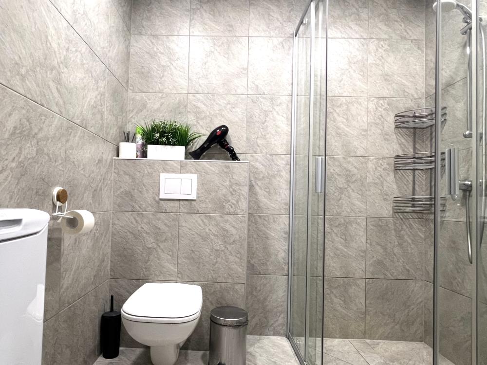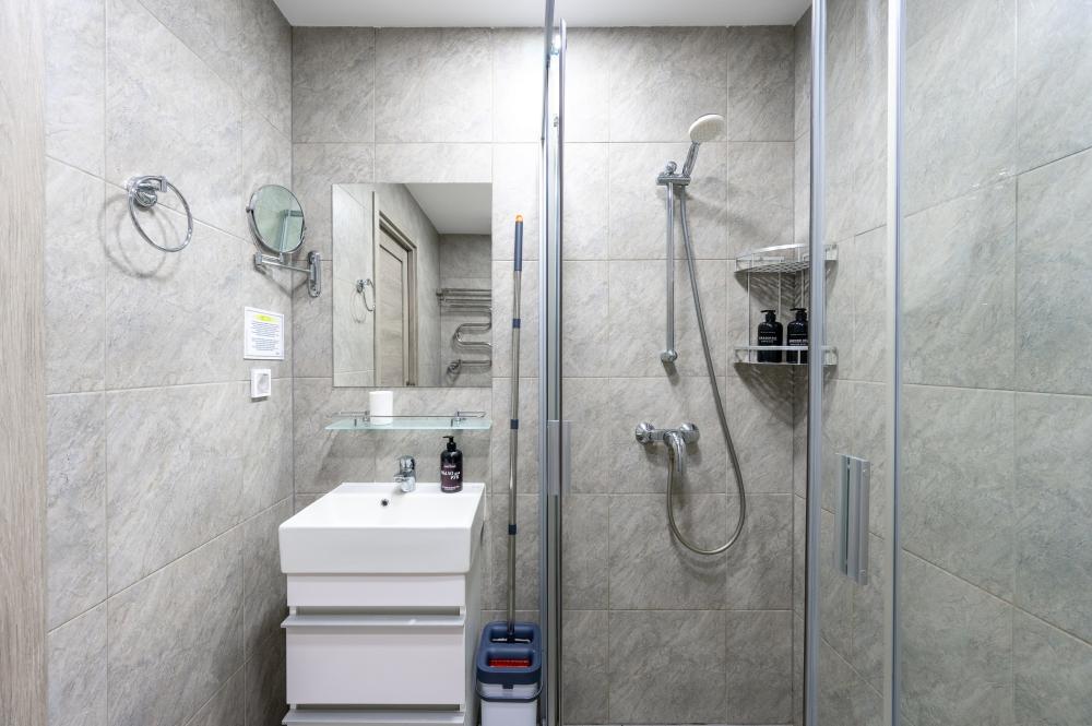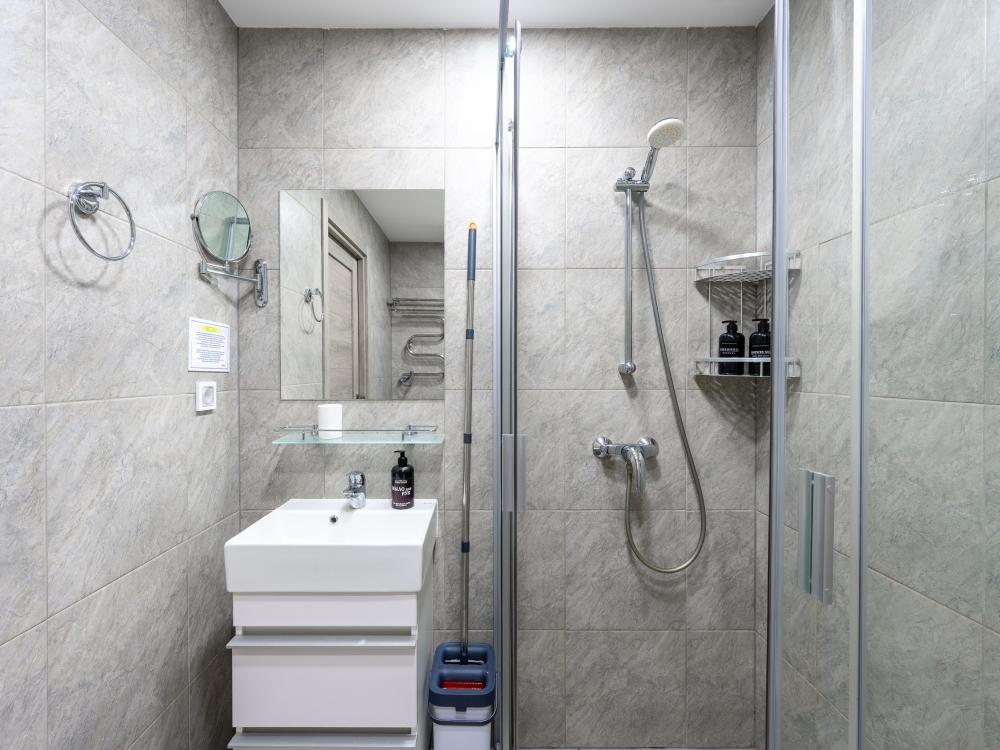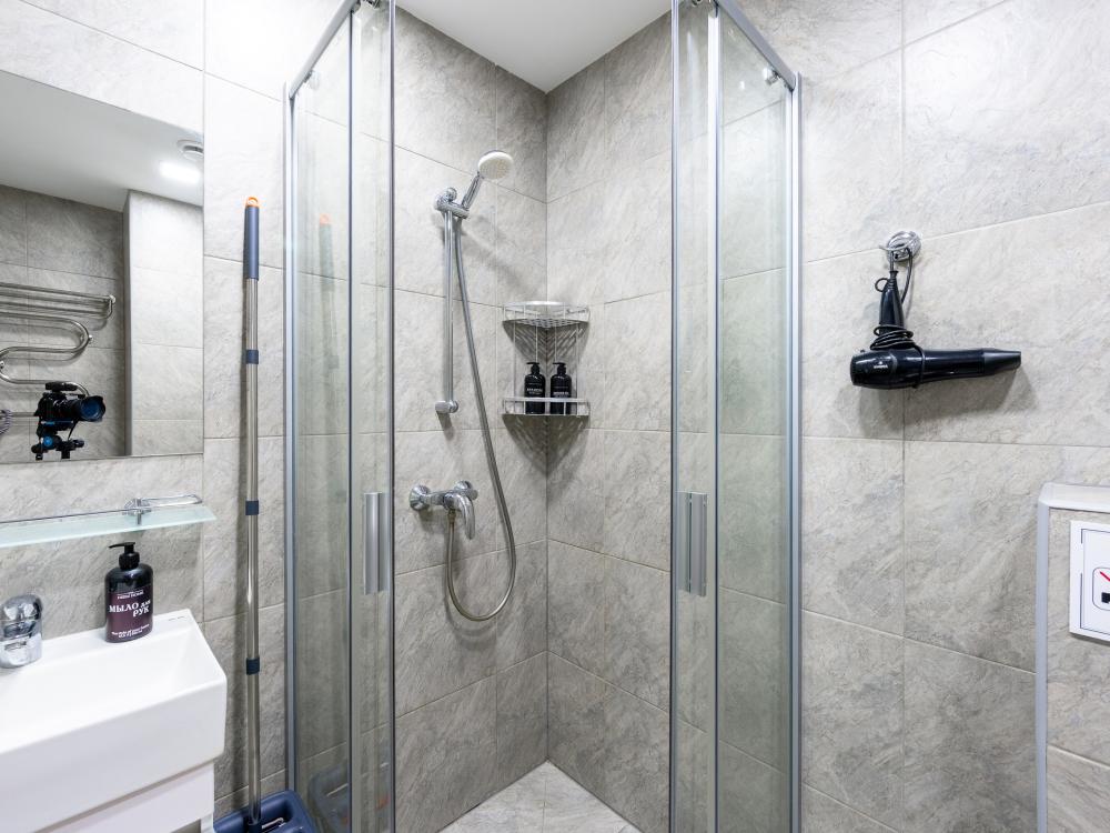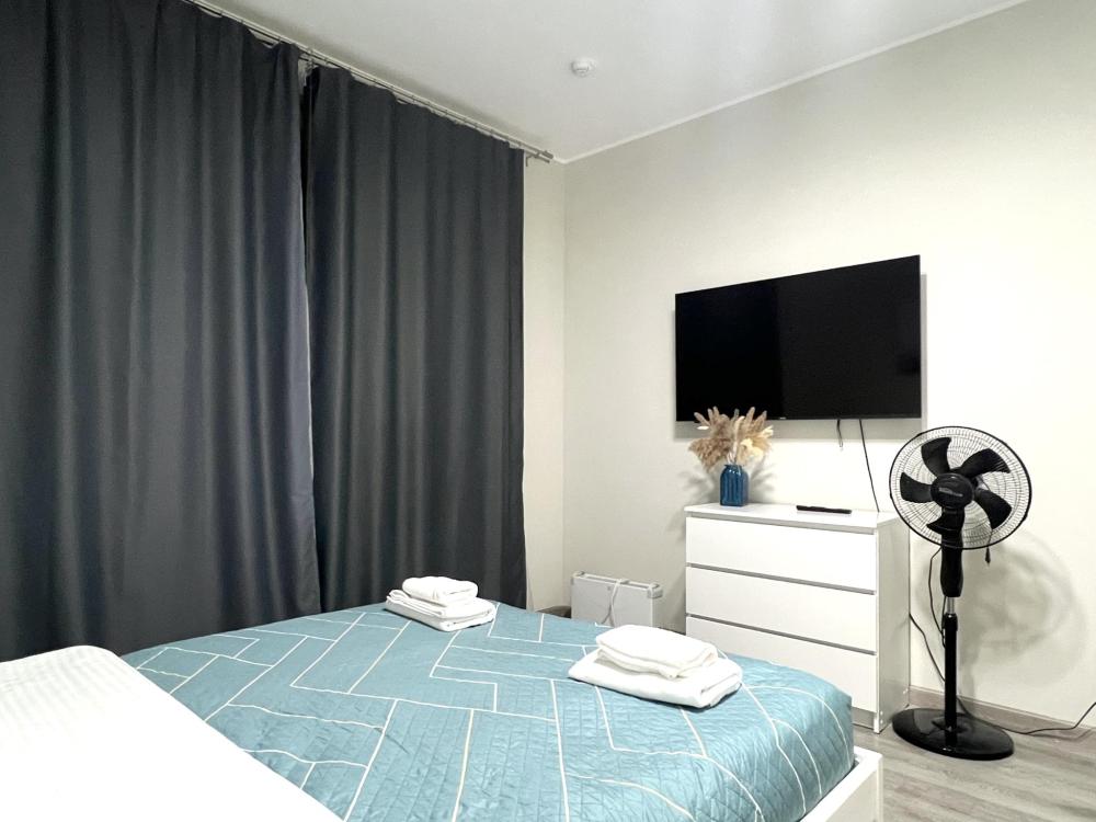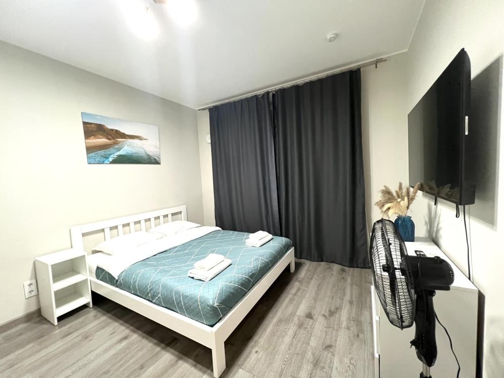 В апартаментах двуспальная кровать с толстым матрасом, комфортная оборудованная кухня, обеденный стол и стулья, душ и всё необходимое, большой шкаф для хранения вещей. В кухонной зоне: микроволновая печь, посудомоечная машина, холодильник, чайник, посуда и столовые приборы на любой случай. Чай, кофе, сахар, соль, конфеты. В ванной комнате: туалет, душ, стиральная машина, фен, утюг, набор гигиенических средств, тапочки, полотенца для ног, рук и тела на каждого гостя. В местах отдыха: постельное белье на каждого гостя, ЖК телевизор с YouTube и Smart TV, высокоскоростной Wi-Fi в номере бесплатно. Гости могут воспользоваться бесплатной у дома или платной крытой парковкой(1000 р/день)