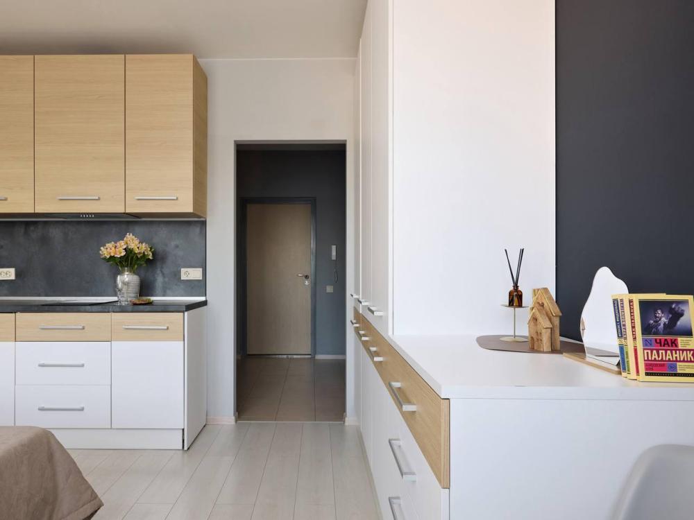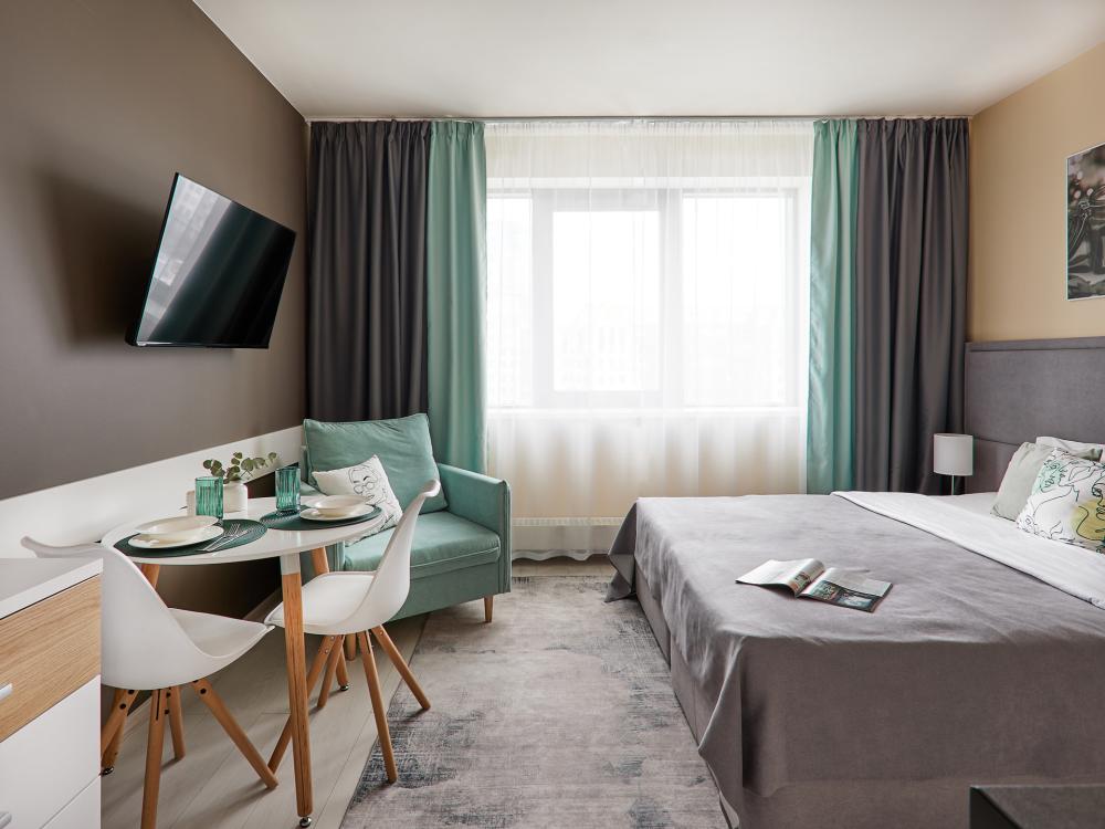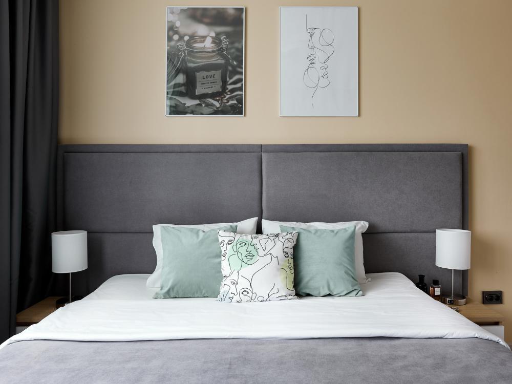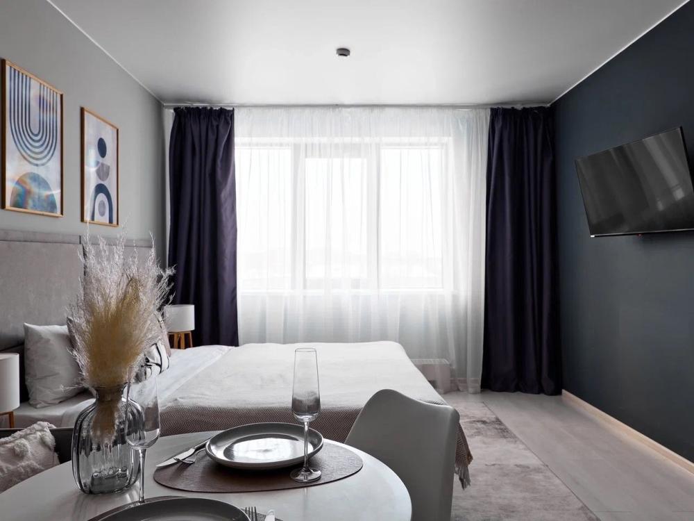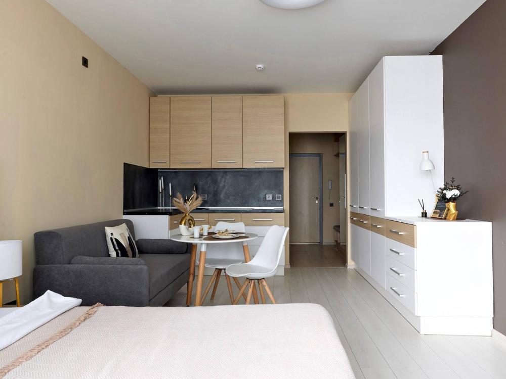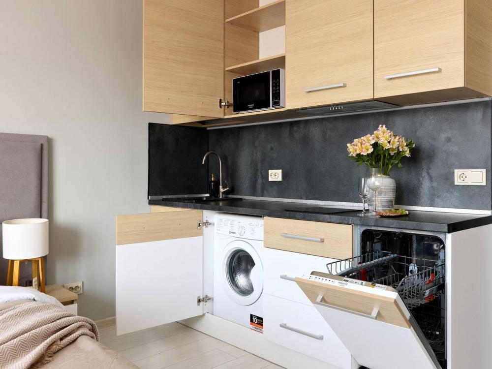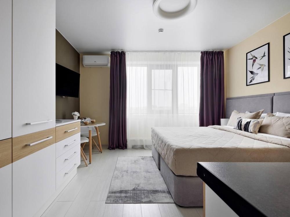 Апартаменты оборудованы всем необходимым для комфортного проживания: кровать 180х200, вместительные шкафы, вентилятор, индукционная плита, посудомоечная машина, чайник, СВЧ, холодильник, посуда и столовые приборы, стабильный wi-fi и телевизор, стиральная машина, сушилка для белья, гладильная доска, утюг, белоснежное постельное бельё высокого качества и полотенца, фен для волос, шампунь и бальзам для волос, гель для душа, одноразовые тапочки.