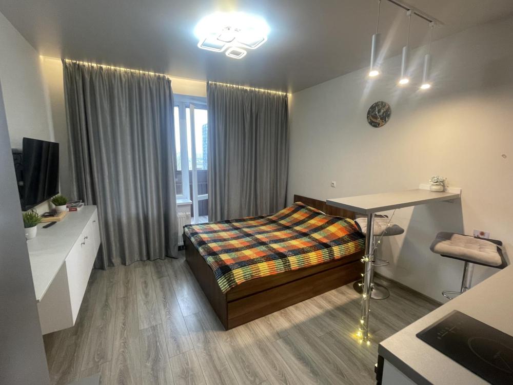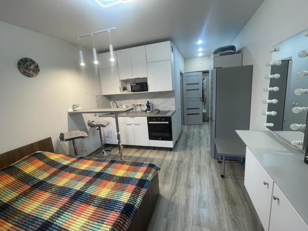 В студии есть абсолютно все для комфортного проживания. Чистые белье и полотенца, приветственный набор продуктов, духовка, микроволновая печь, плита, кофемашина капсульная, утюг, глад. доска, пылесос, телевизор, большой холодильник, бойлер, стиральная машина. Широкий ассортимент посуды и столовых приборов. Три спальных места- раскладной двуспальный и диван и раскладушка с матрасом. Проведен интернет. Большой просторный балкон.