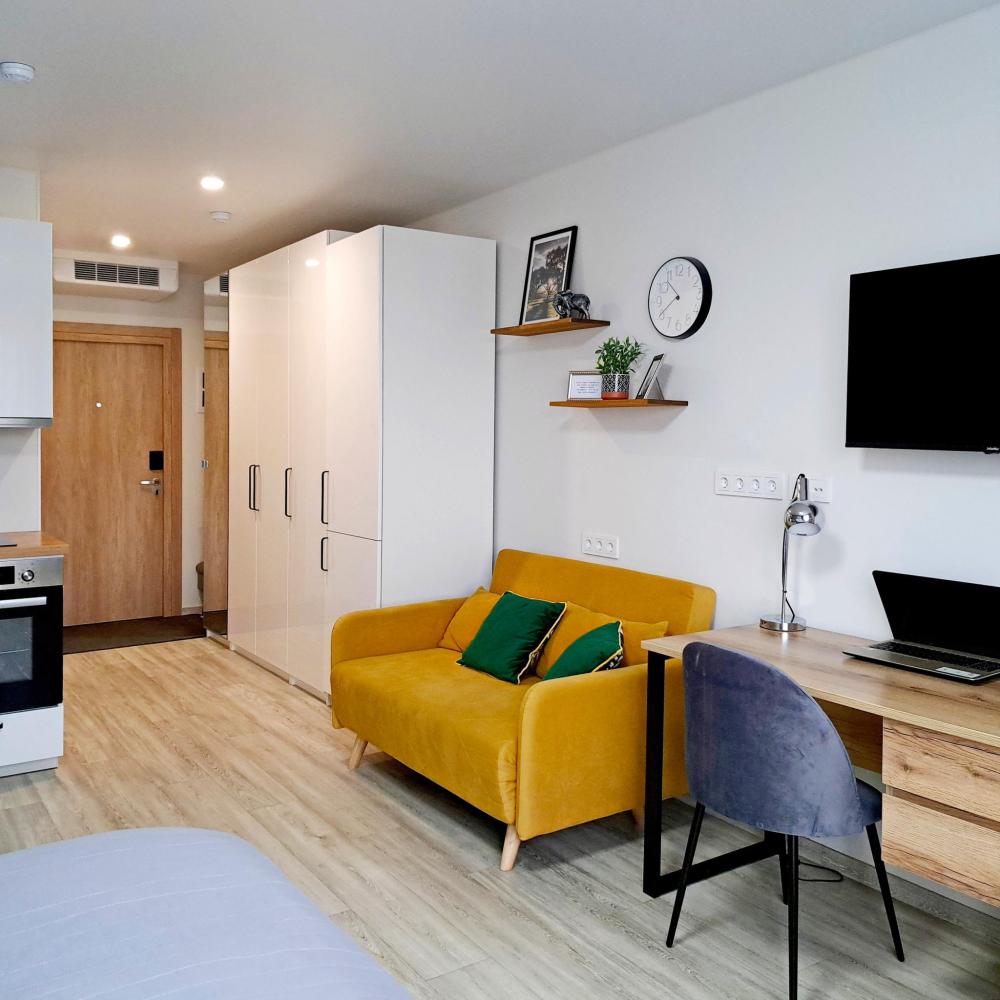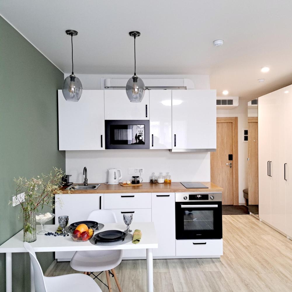 В апартаментах возможно размещение 4 человек. Спальные места: двуспальная кровать, раскладной диван. Кухня оборудована необходимой посудой и техникой: варочная панель, духовой шкаф, чайник, холодильник. К услугам гостей также телевизор, wi-fi, стиральная машина.