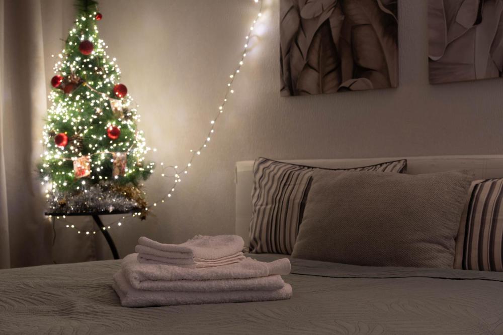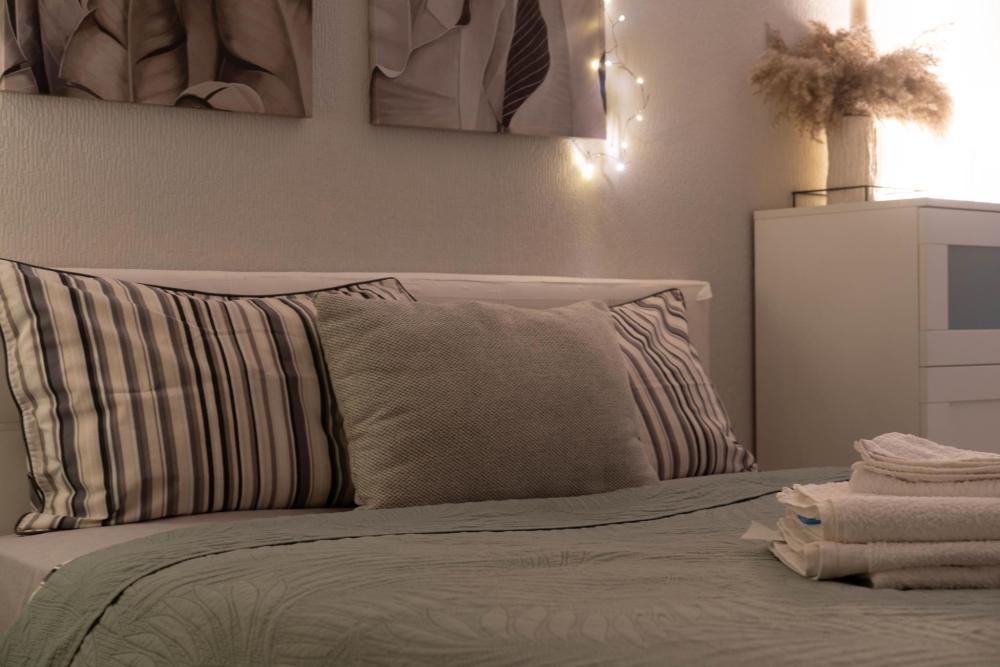 Чистое постельное белье и полотенца .