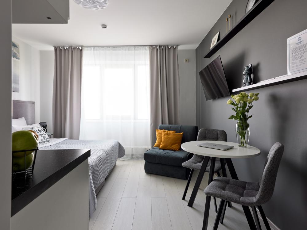 Квартира-студия в новом доме Бизнес-класса. Оборудована полностью всем необходимым для комфортного проживания 3 человек. Спальные места: кровать размера king-size и раскладное кресло-кровать. Кухня: все необходимое для приготовления еды и мытья посуды. Плита, посудомоечная машина, холодильник, чайник, фильтр воды. Санузел: чистый, в кафеле, ванная, гигиенический душ, зеркало с подсветкой, полотенцесушитель, раковина, фен. Техника: бесплатный скоростной wi-fi, большой телевизор, утюг, стиральная машина, гладильная и сушильная доска. Парковка: бесплатная во дворе, либо платная рядом с домом. В апартаментах запрещено курить и устраивать вечеринки. При заселении необходимо внести возвратный залог (3000 рублей). Также дополнительно оплачивается уборка при выезде (1000 рублей). Ждем вас! Будем рады!