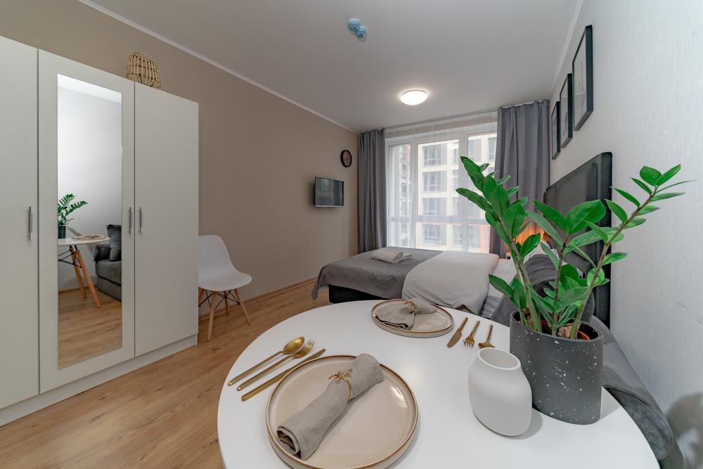 Для гостей и жителей нашего города предлагается в аренду новая студия в ЖК START. В 700 метрах от м. Парнас и в 24 минутах езды до м. Невский проспект без пересадок. Мы постарались сделать ее максимально уютной и комфортной для вас. В апартаменте есть вся необходимая мебель, а именно: кровать Спринг Бокс с удобным ортопедическим матрасом для качественного сна, современная кухня, шкаф для хранения вещей. Из техники в наличии стиральная машина, индукционная плита, посудомоечная машина, холодильник, телевизор со Smart ТВ, фен, утюг и пылесос. Смеситель с фильтром для питьевой воды. Также есть таблетки для посудомойки, мыло для рук, гель для душа и шампунь. На каждого гостя выдаём банное полотенце и застилаем белое постельное белье. Белые махровые халаты можно получить по запросу, при проживании от 7 суток. Заселение происходит в 15:00, выселение в 12:00. Для вашего удобства на двери установлен электронный замок, поэтому заселиться и выселиться вы можете независимо от нас, а носить ключи не нужно. START - это современный жилой комплекс с новыми лифтами, апартаменты с панорамными окнами. Мы позаботились о вас и повесили шторы блэкаут, чтобы в солнечные дни и белые ночи вы могли спокойно выспаться. В апартаментах запрещено курить и устраивать вечеринки. При заселение дополнительно оплачивается уборка при выезде (500 рублей). Ждем вас! Будем рады!